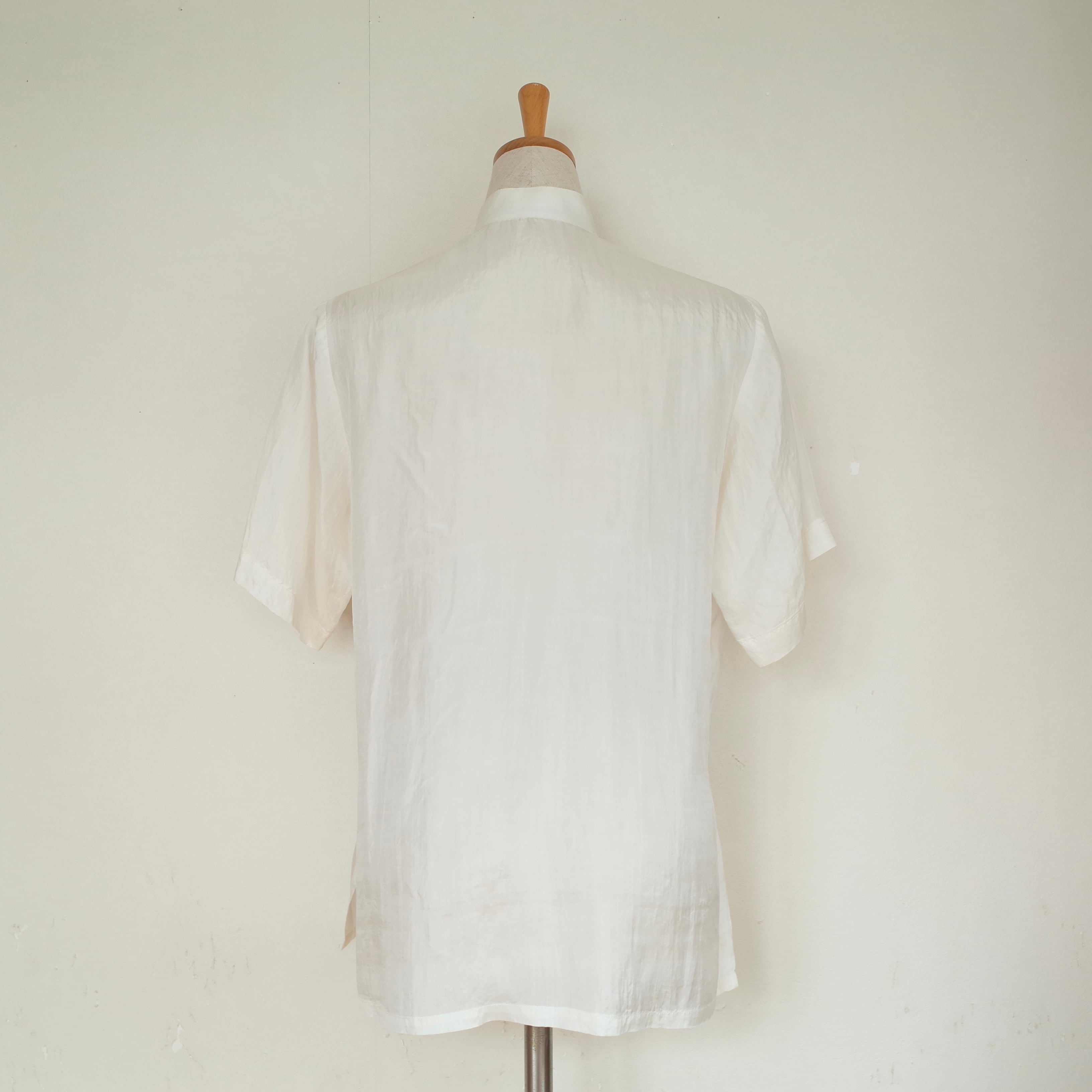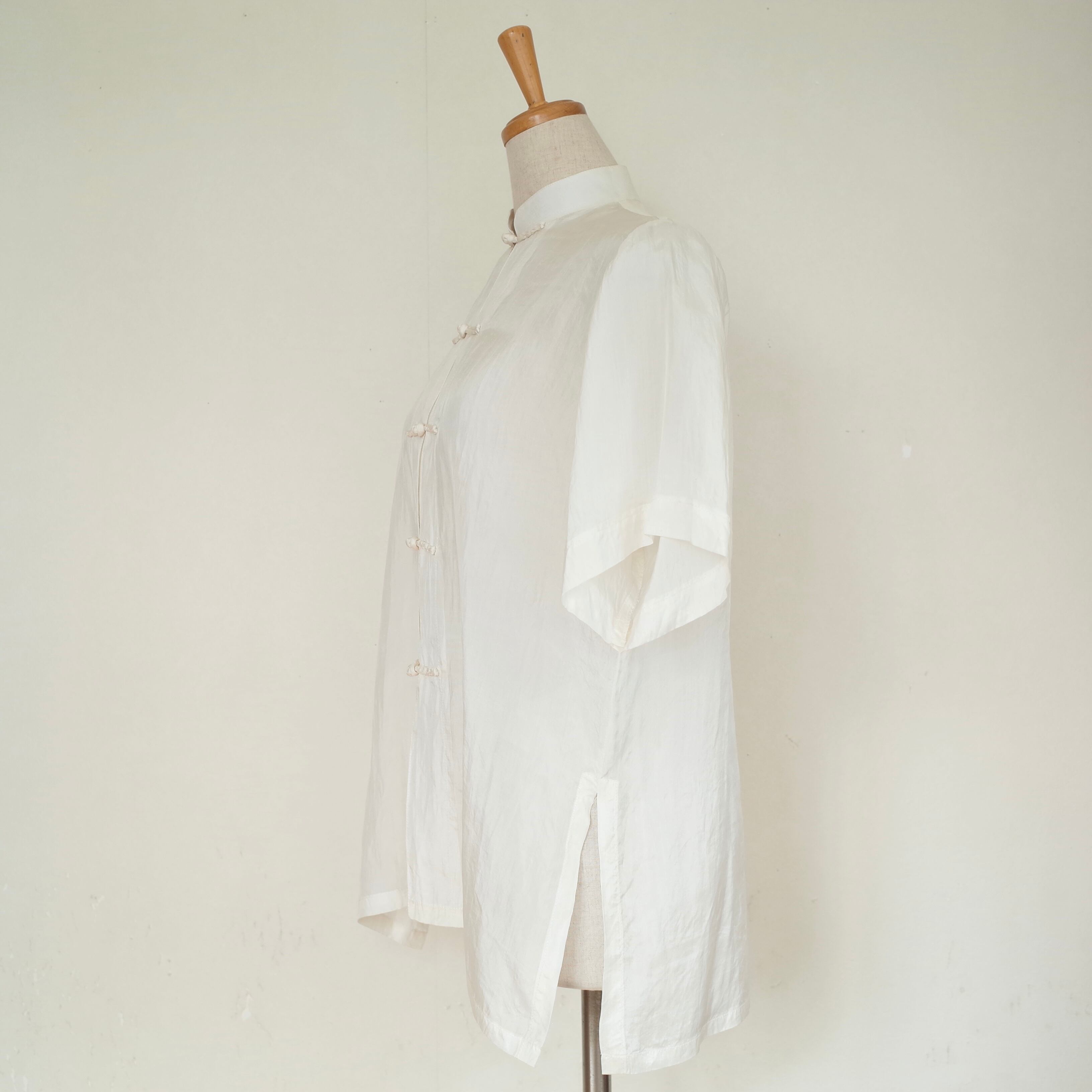 ベトナム製のチャイナブラウス。薄手のシルクなのでカットソーの上に羽織として着用するのもおすすめです。合わせやすいホワイトは重宝する一枚です。