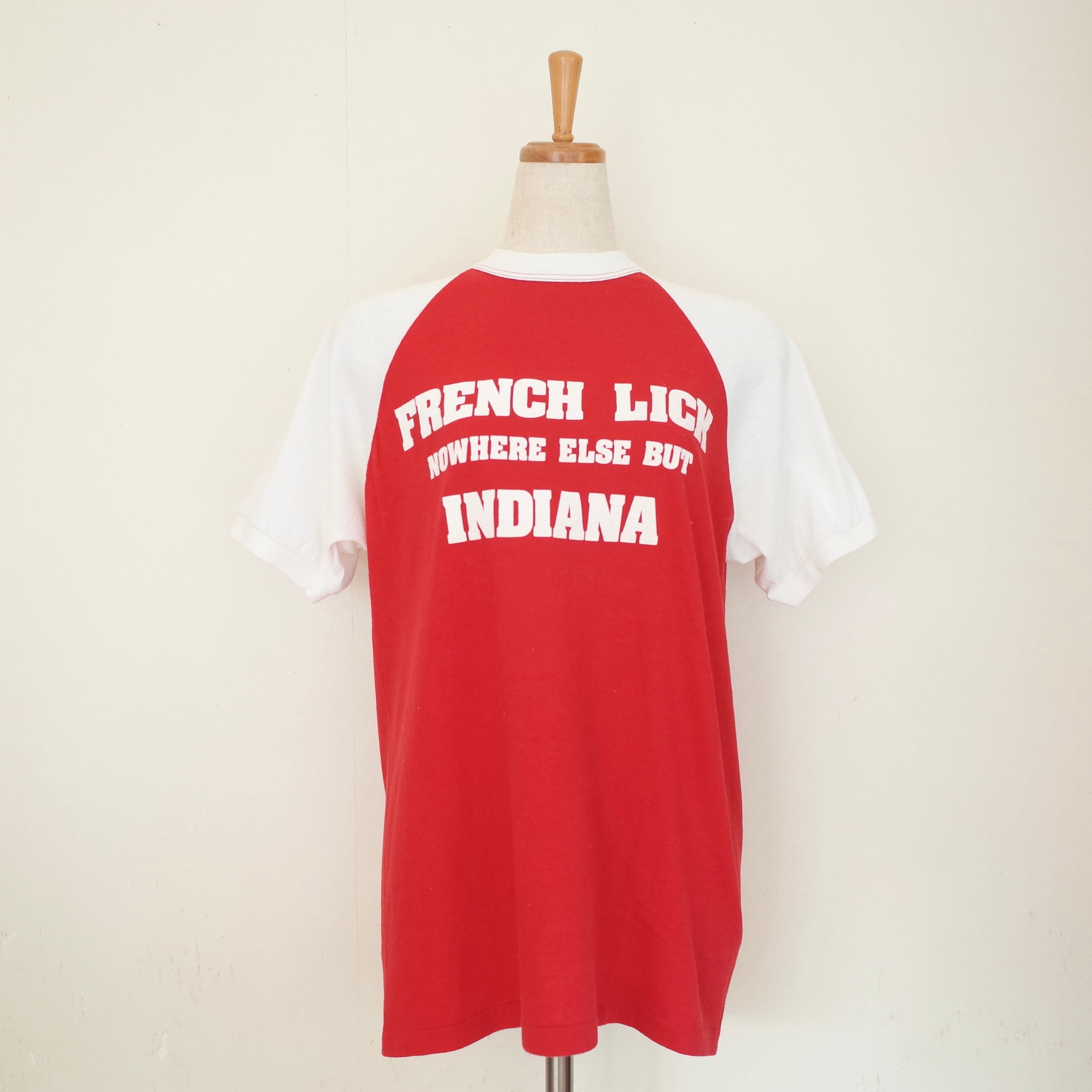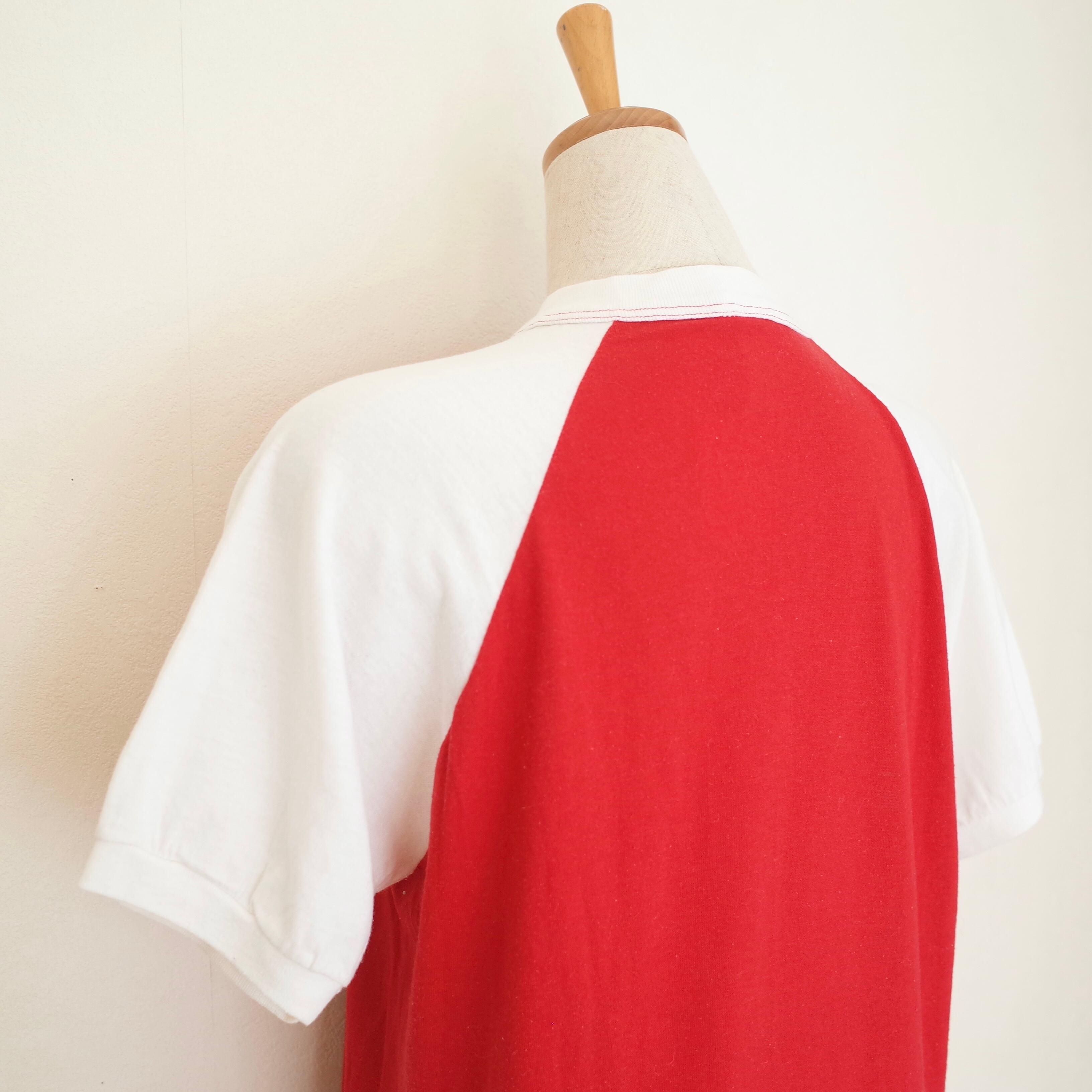 70〜80年代アメリカ製、ラグランスリーブのTシャツ。紅白の配色が◎ユニセックスで着用できるサイズで、女性が着用するとビックサイズのゆったりシルエットがかわいいです。