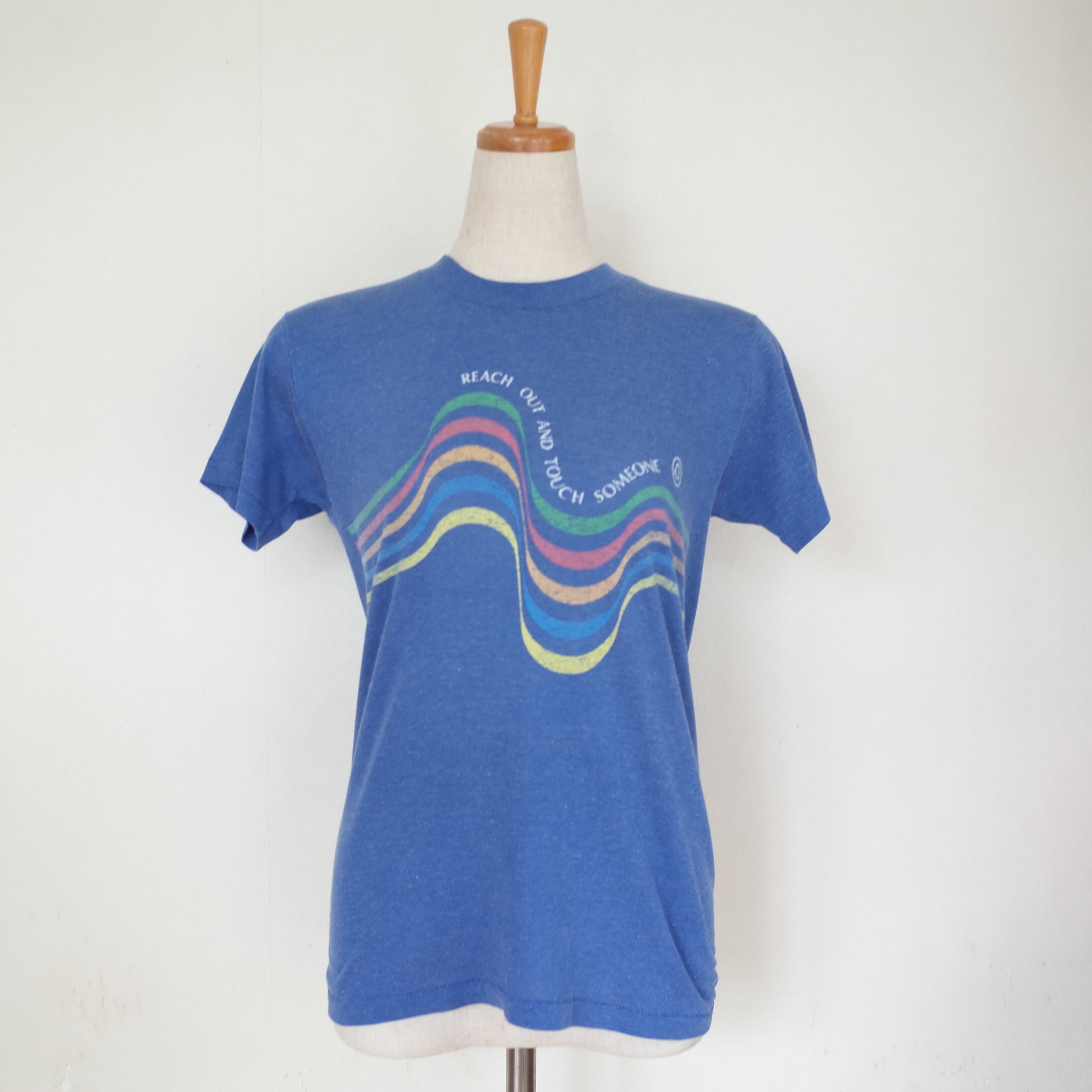 80年代アメリカ製velva sheenボディのプリントTシャツ。波打ったレインボーのラインがグッドプリントな一枚です。