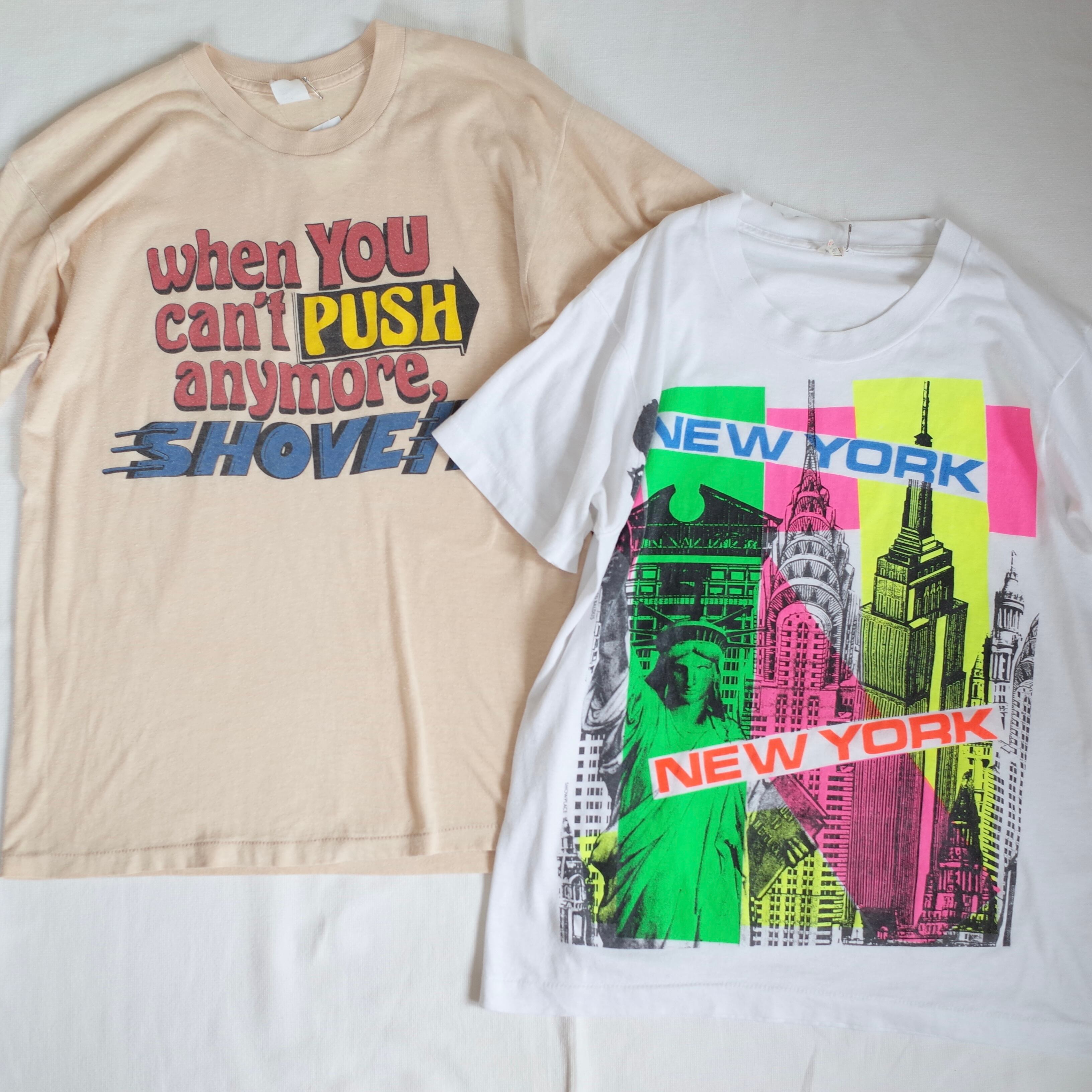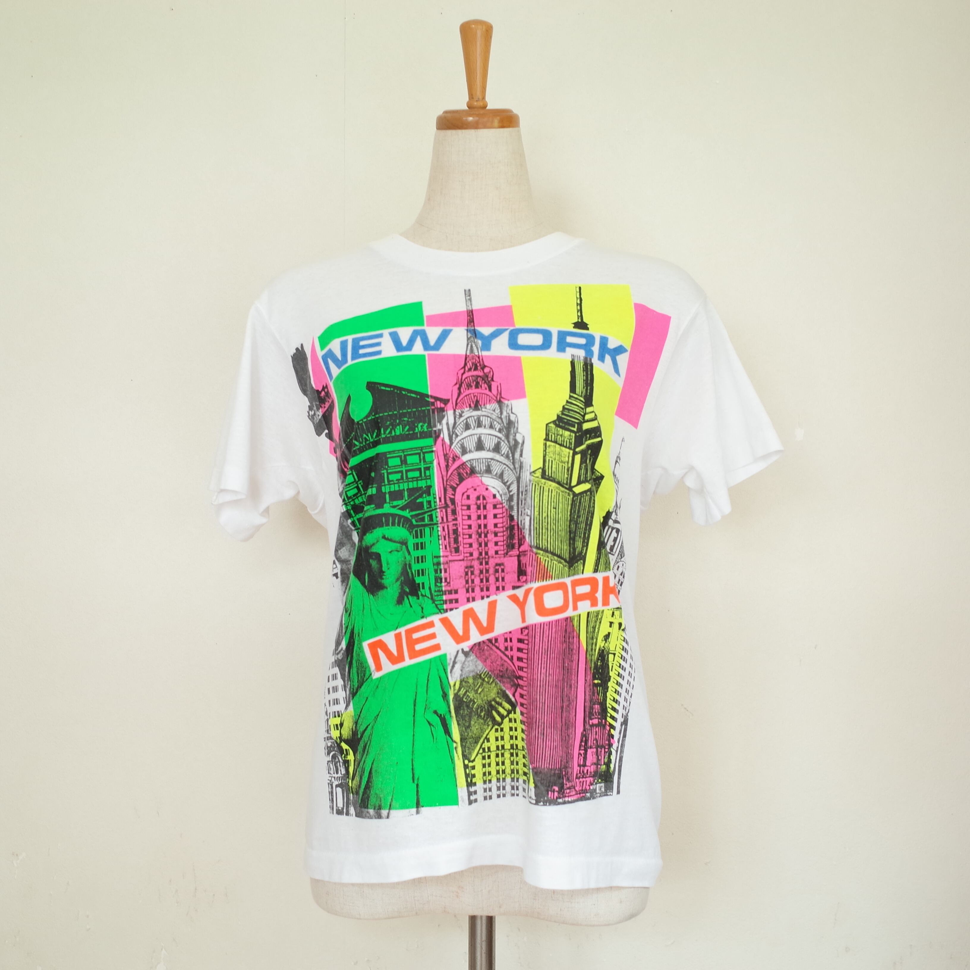 80年代アメリカ製SCREEN STARSボディのプリントTシャツ。ニューヨークを象徴する建築物がネオンカラーでプリントされた一枚。