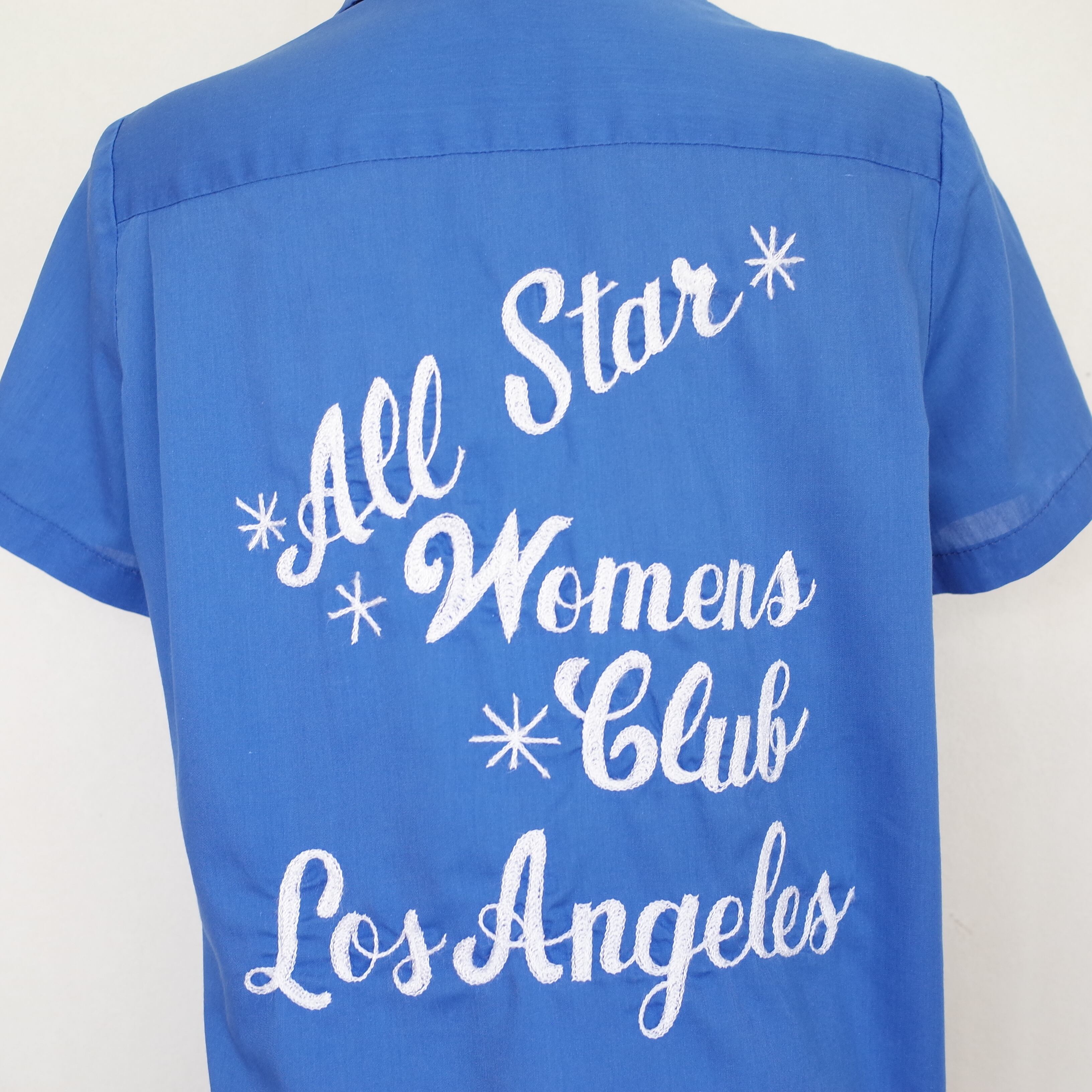 アメリカ製ヴィンテージのボーリングシャツ。ブルー×ホワイトの爽やかな配色とハンド刺繍が可愛い一枚です。