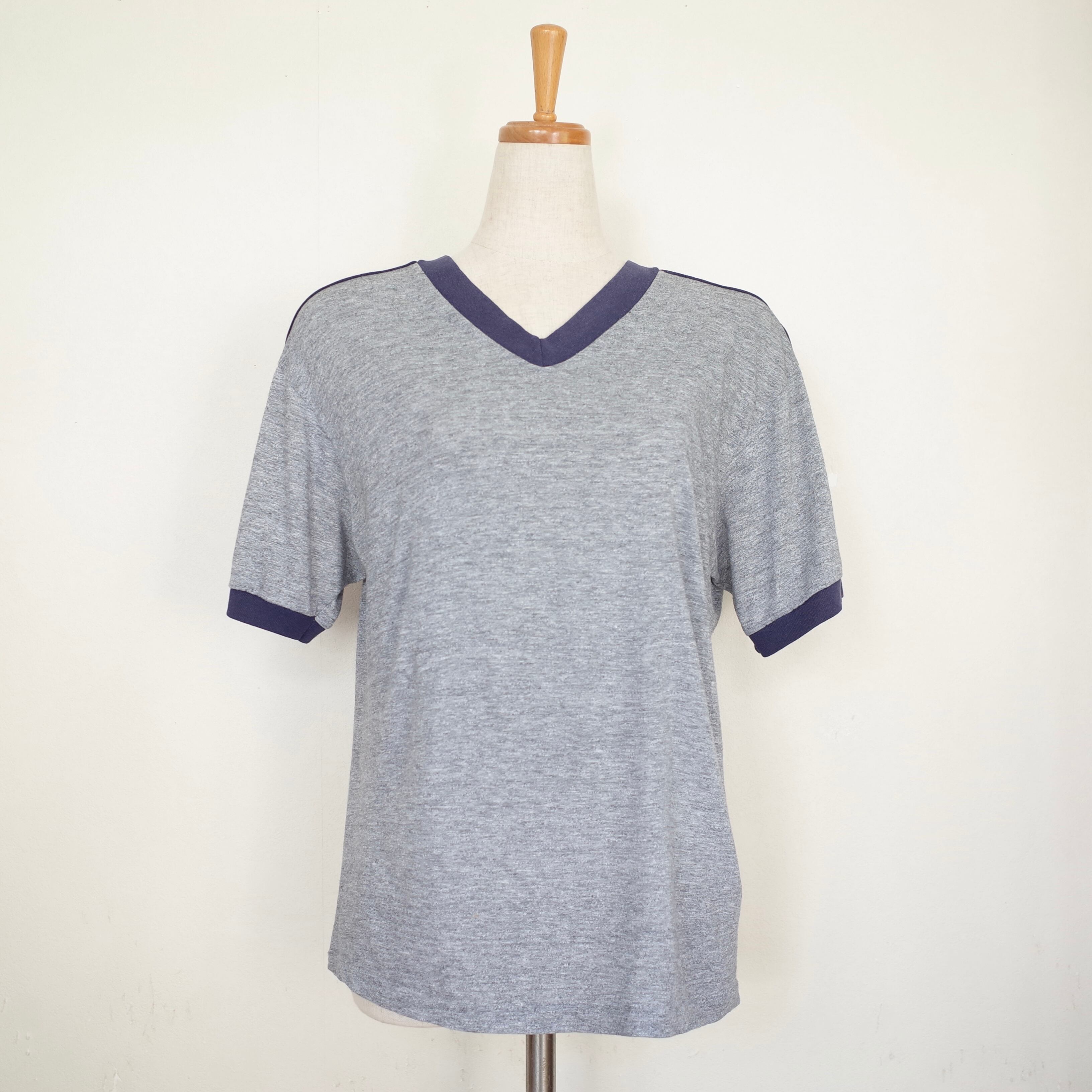肩に入った太めのメッシュのラインがスポーティーな一枚。着込まれたクタクタな霜降りグレーの生地感とネックリブの少し褪せた感じが雰囲気あります。ロングスカートやスラックスなど綺麗目なボトムと合わせるのもおすすめです。