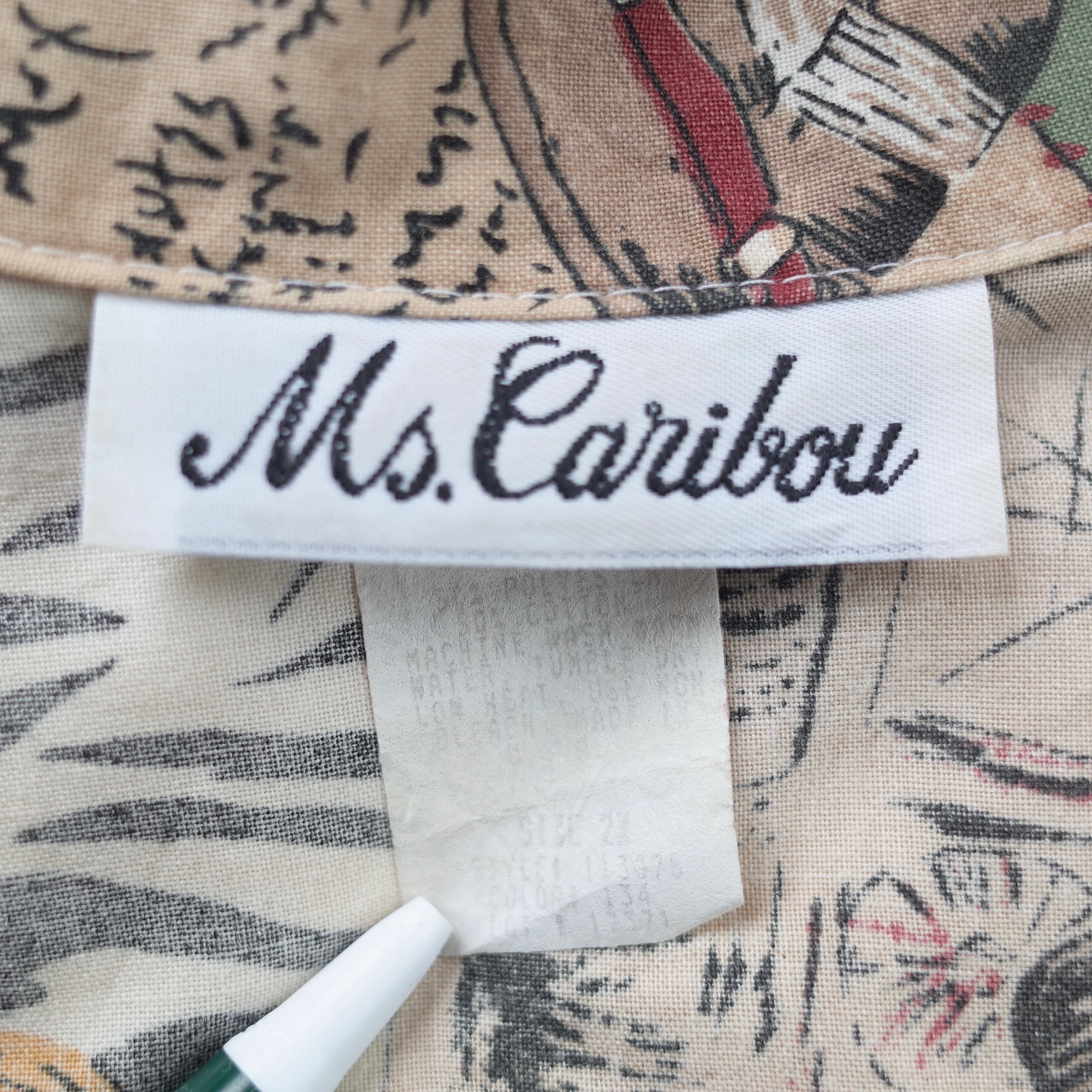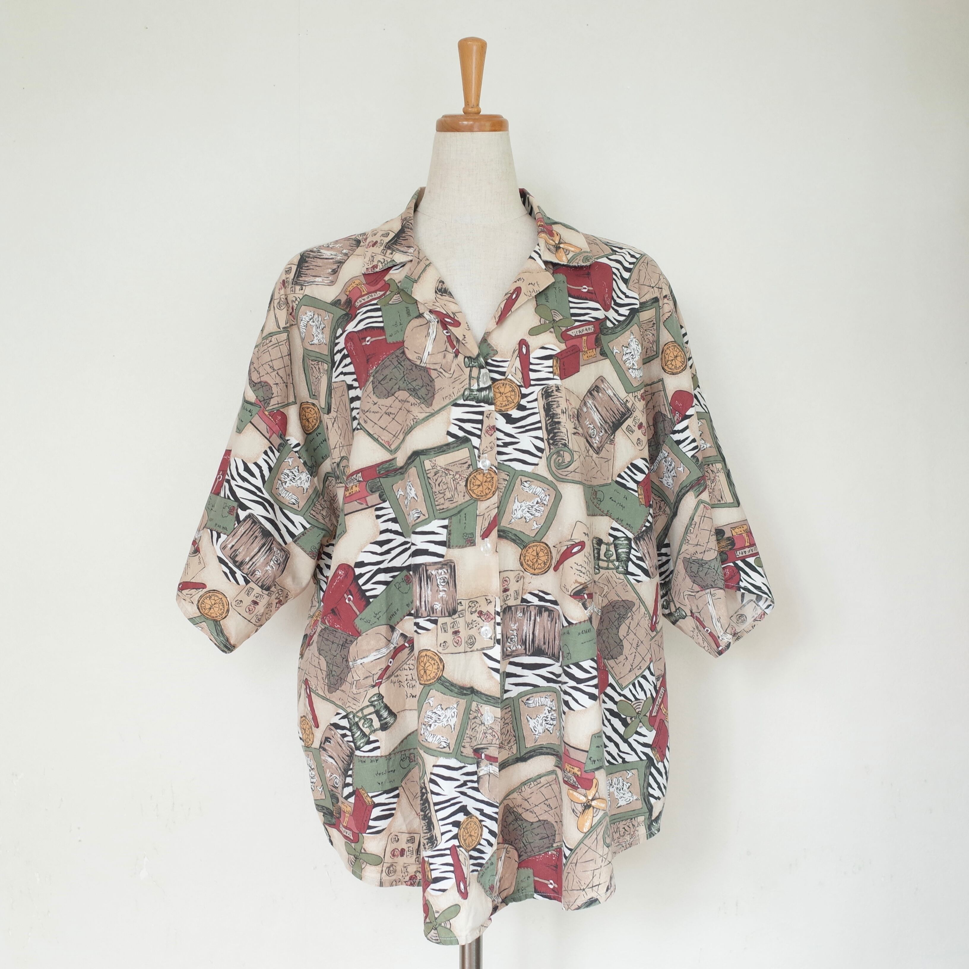 80〜90年代アメリカ製の半袖シャツ。オーバーサイズがかわいい一枚。シマウマや地図や双眼鏡などプリントも目を惹くシャツです。
