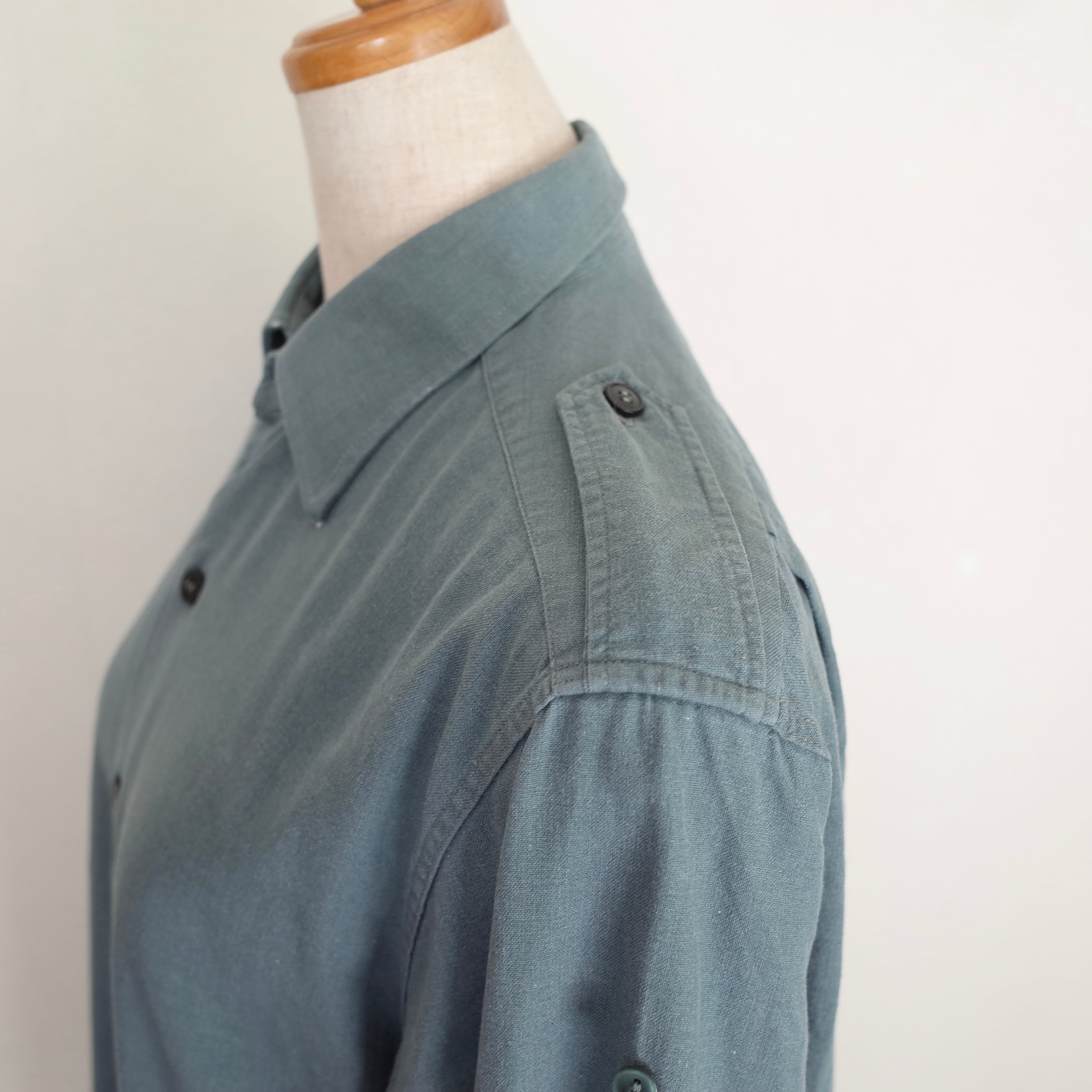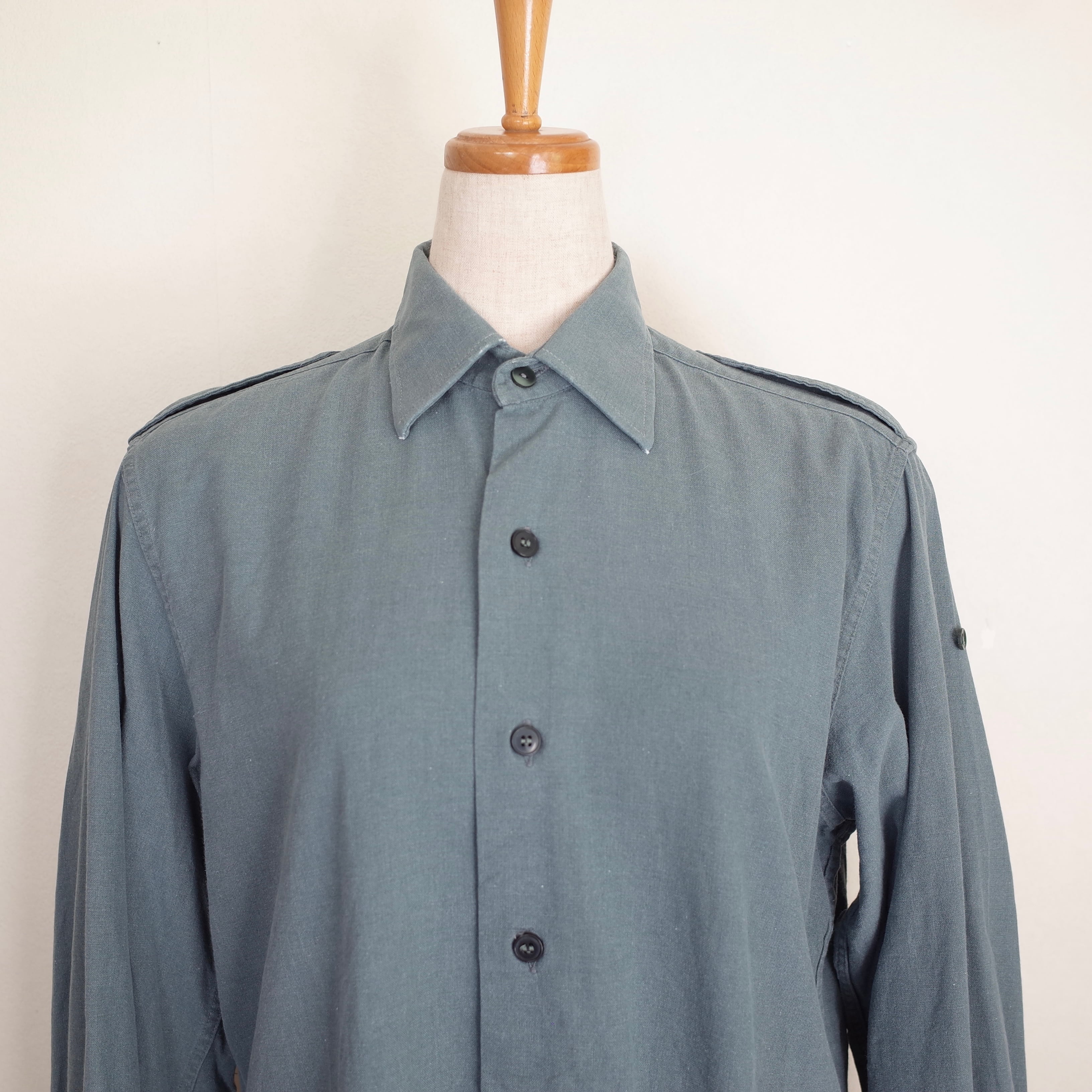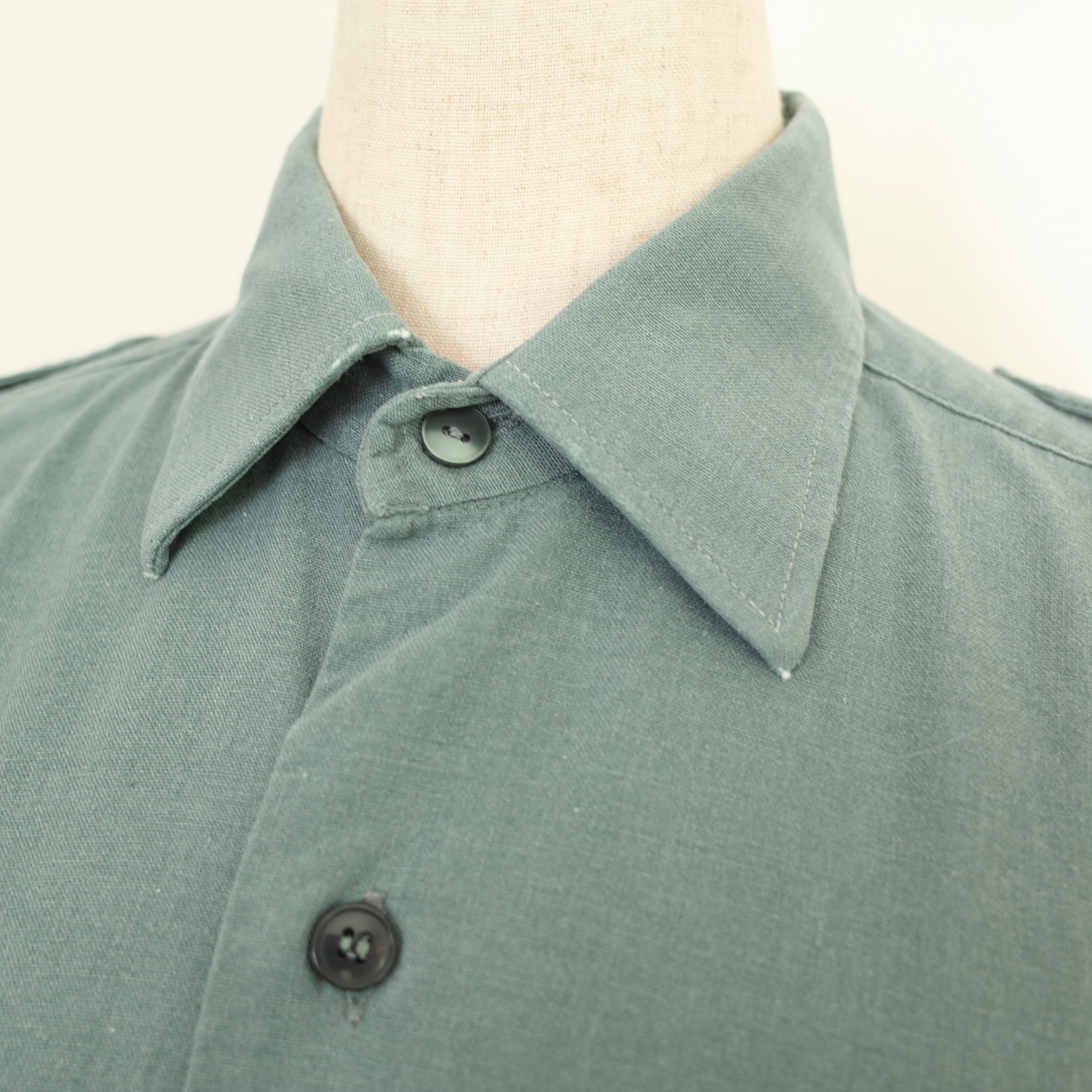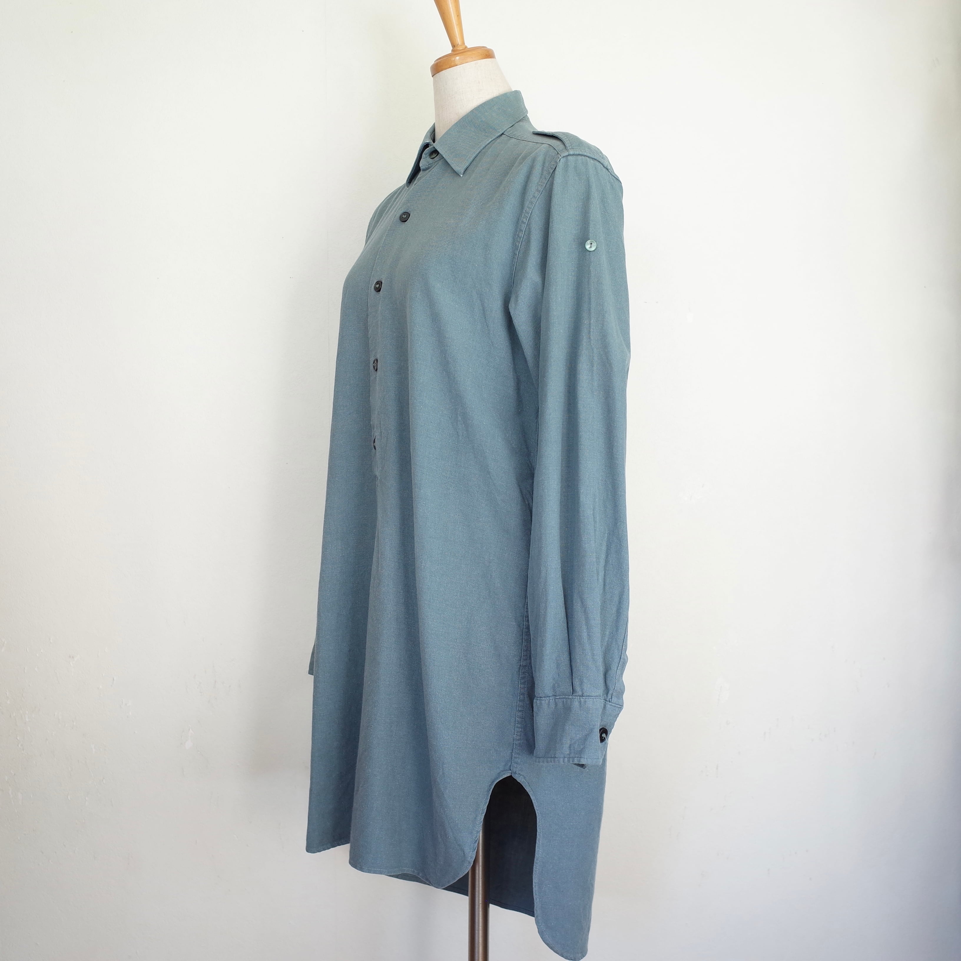 1960年代製スイス軍のグランパシャツ。当時は、ワークウェアやパジャマとして着られていました。風合いの良いしっかりとしたコットン生地を使用したプルオーバーのシャツ。グレーとグリーンを合わせたような絶妙な中間色も◎インナーとしても、もちろん一枚でも。現代の洋服に合わせてもすんなり馴染む一枚です。ユニセックスで着用いただけます。