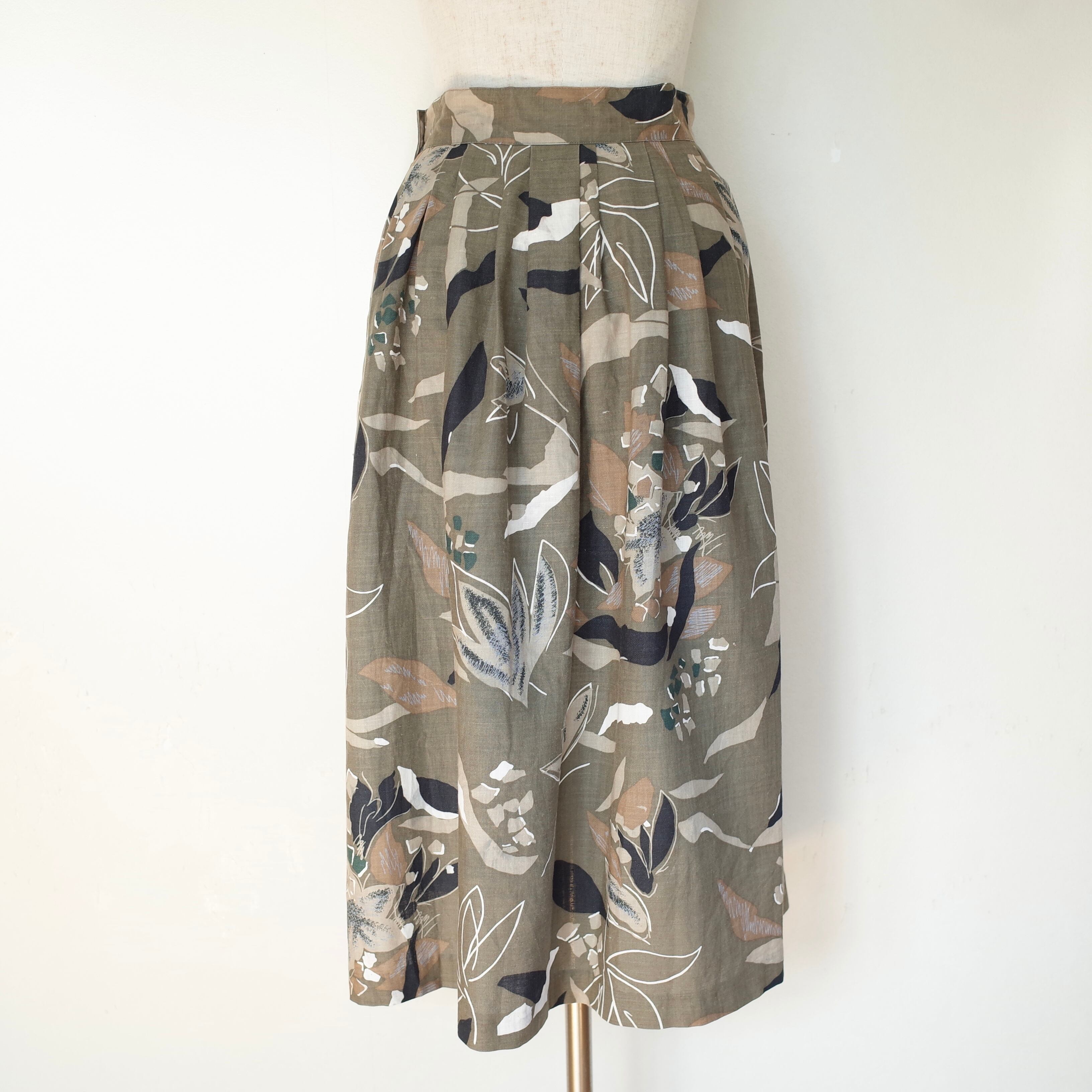 シャリ感のあるしっかりとしたラミーという麻素材と、コットンが混ざったミモレ丈のスカート。アースカラー配色の植物プリントがかわいい一枚です。