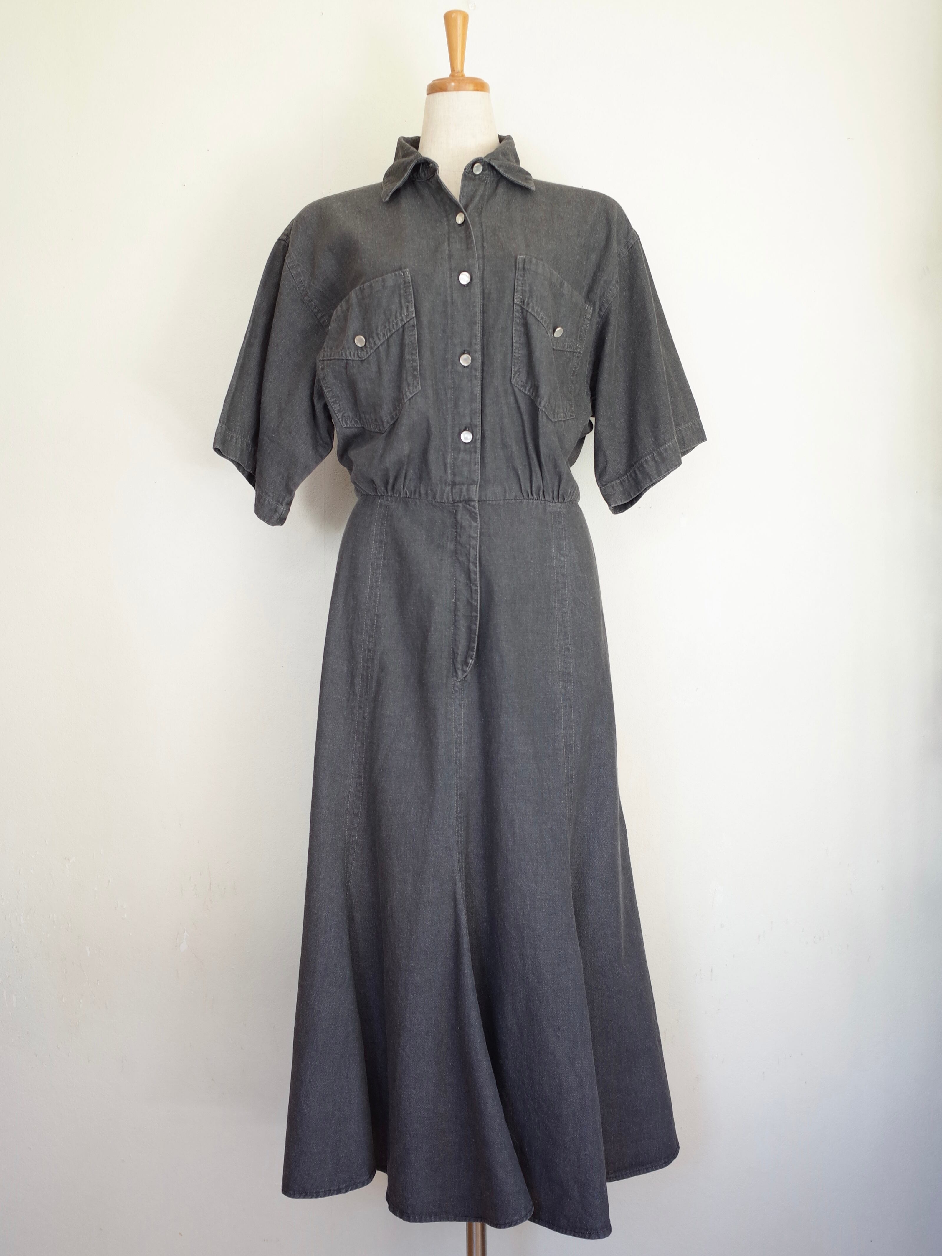 80年代アメリカ製ブラックデニム素材のワンピース。TALONジップです。ウエストに切り替えがあるので野暮ったくならず、裾にかけてボリュームの出るスカートのラインも綺麗です。一枚でシンプルにさらりと着用出来るワンピースです。