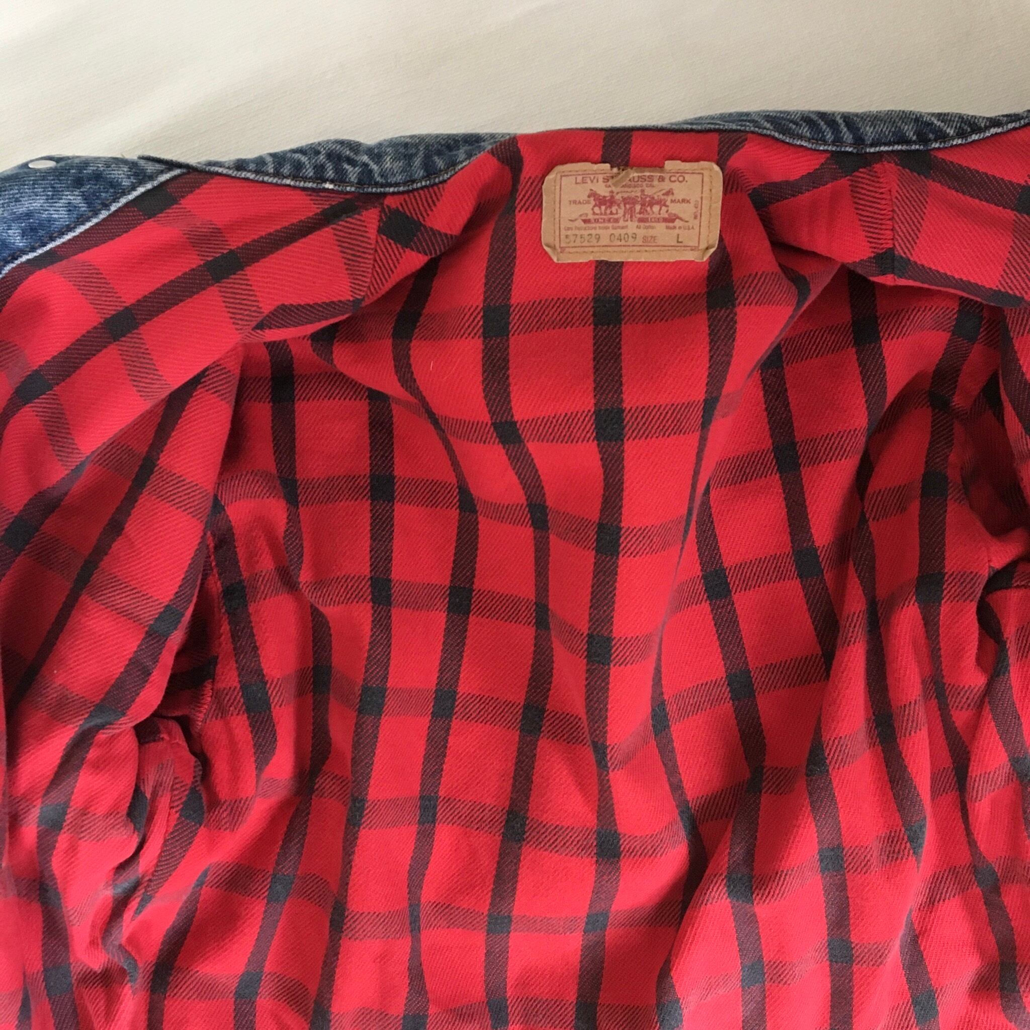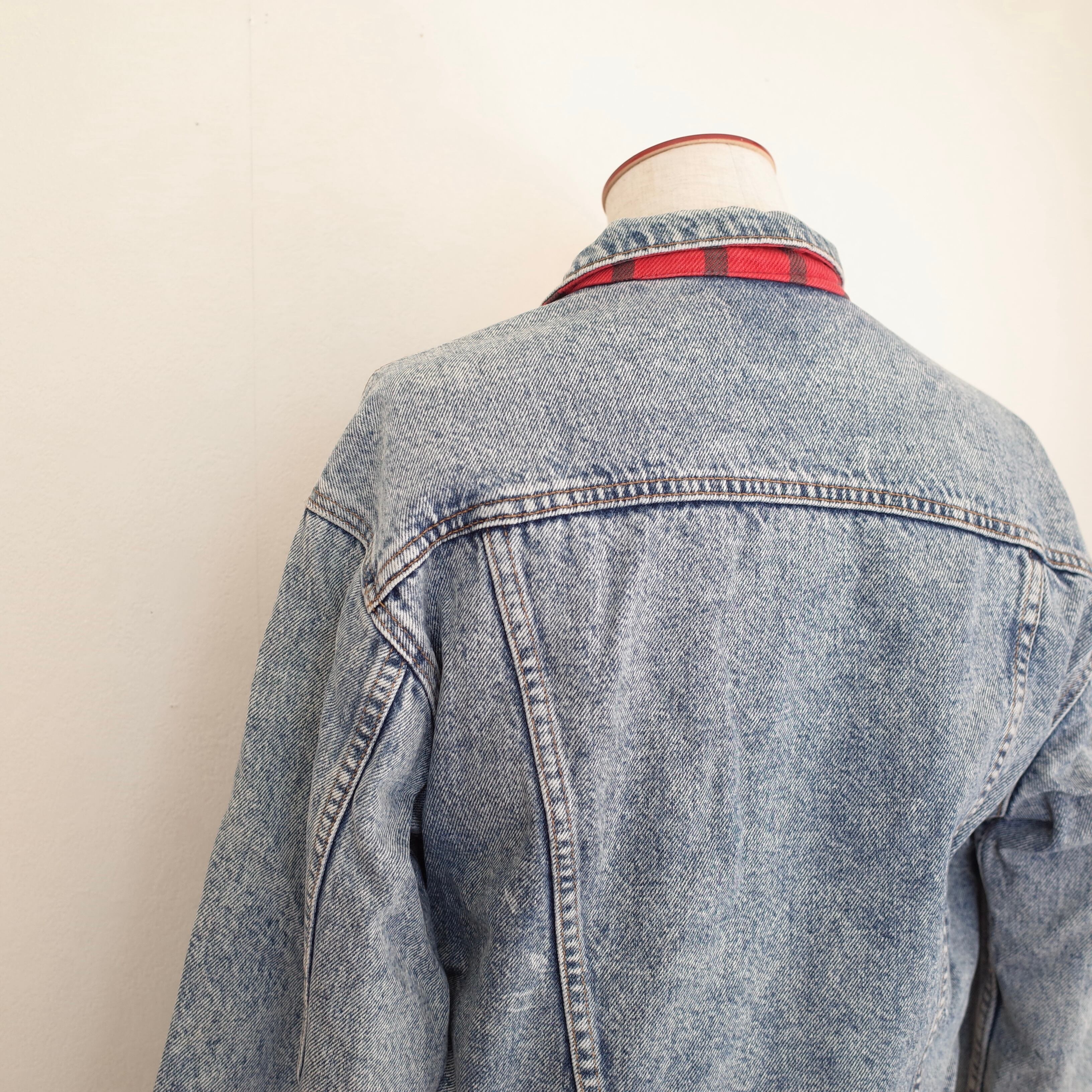 80年代アメリカ製Levi'sのデニムジャケット。フォースです。裏地にチェック柄のブランケットが付いています。時を経てケミカルウォッシュになったデニムがとても味がある一着です。