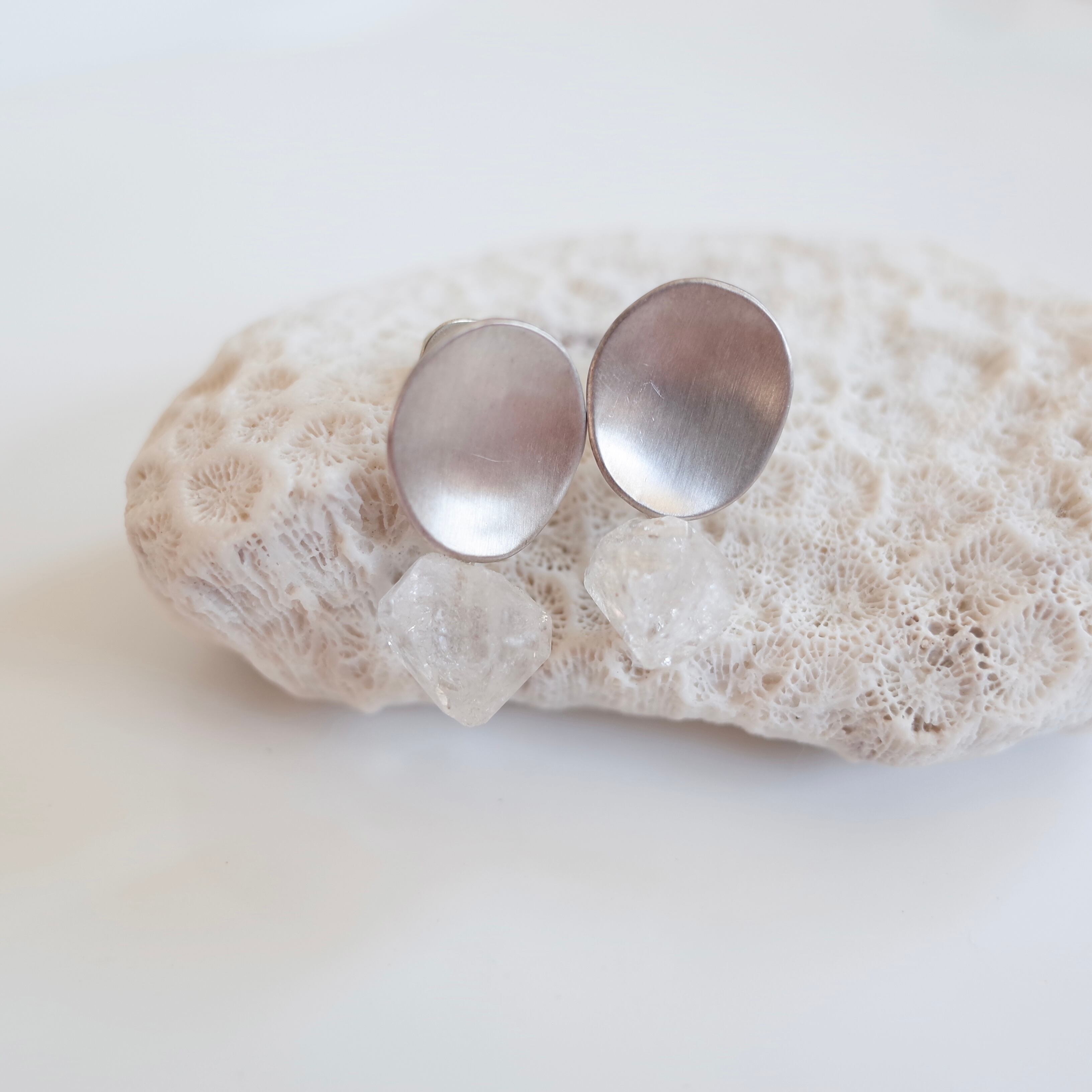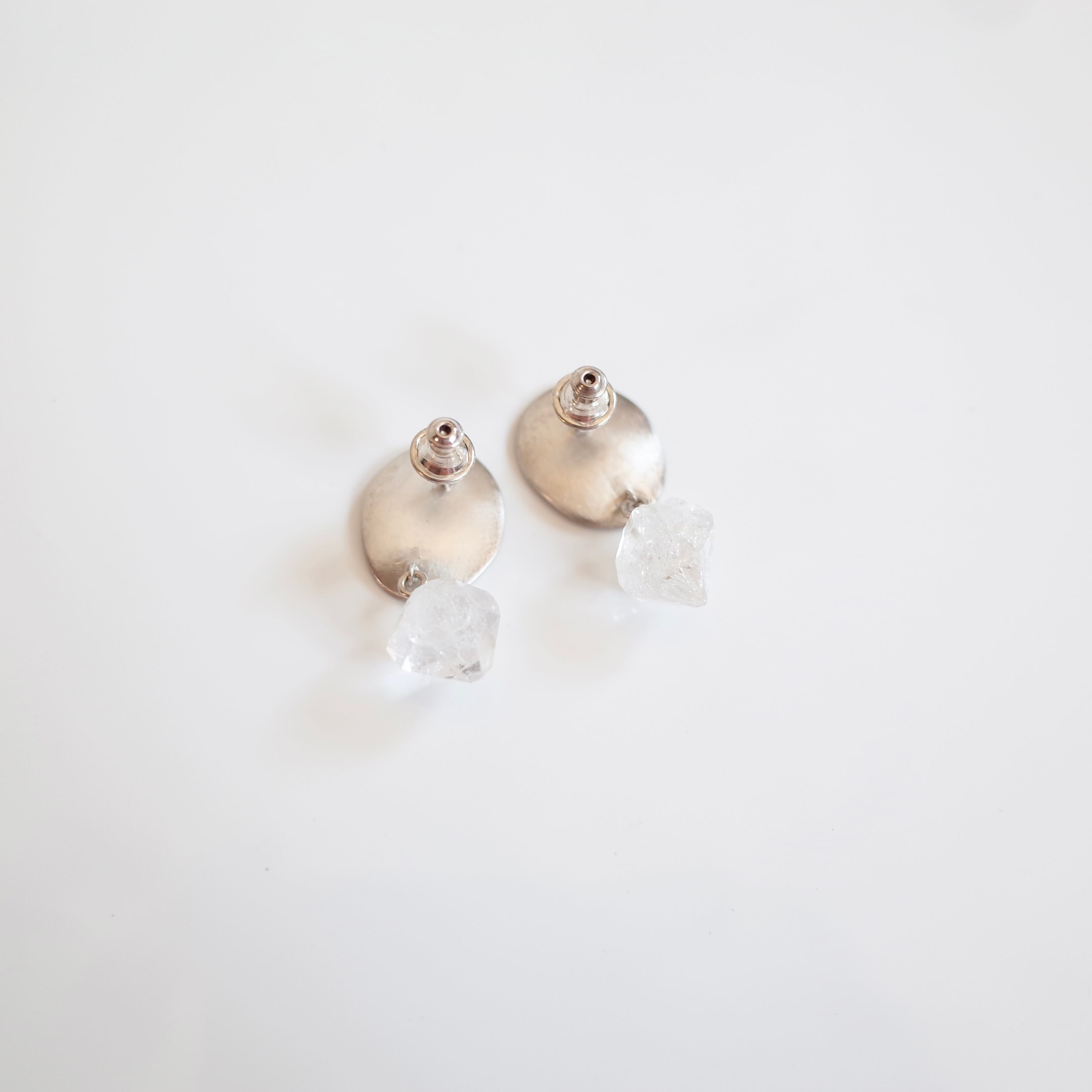 天然石を使用したherのピアスです。エレスチャルクォーツは水晶の一種で、大変長い年月をかけ、木の年輪のように結晶を重ねて作られています。マットなシルバーとの組み合わせが揺れる度に、繊細な輝きを際立たせてくれます。