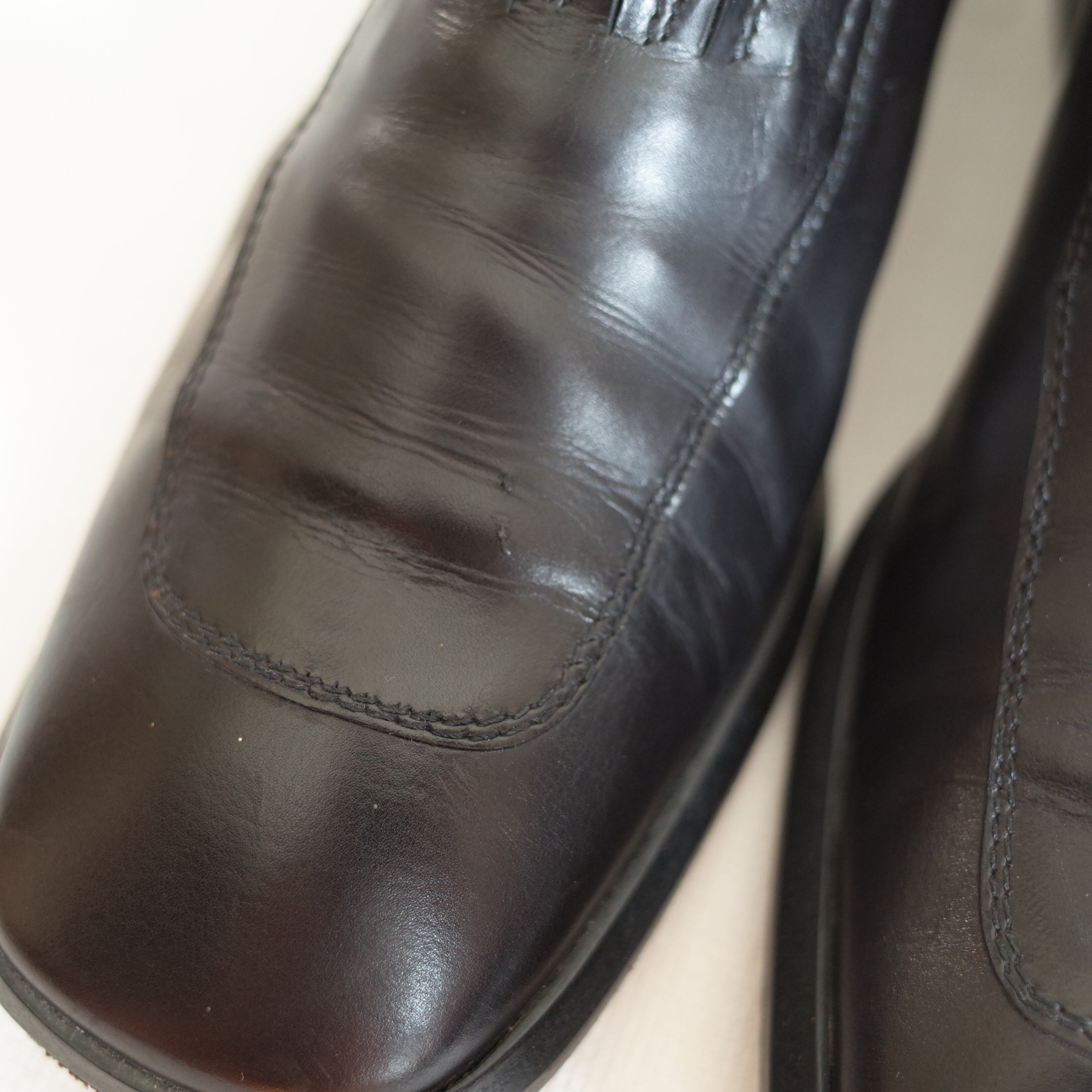 Ralph Laurenのレザーシューズ。細長のシルエットでぱつっと切りそろえたような直線的なスクエアトゥ。甲にゴムが使われているので足を入れやすくなっています。