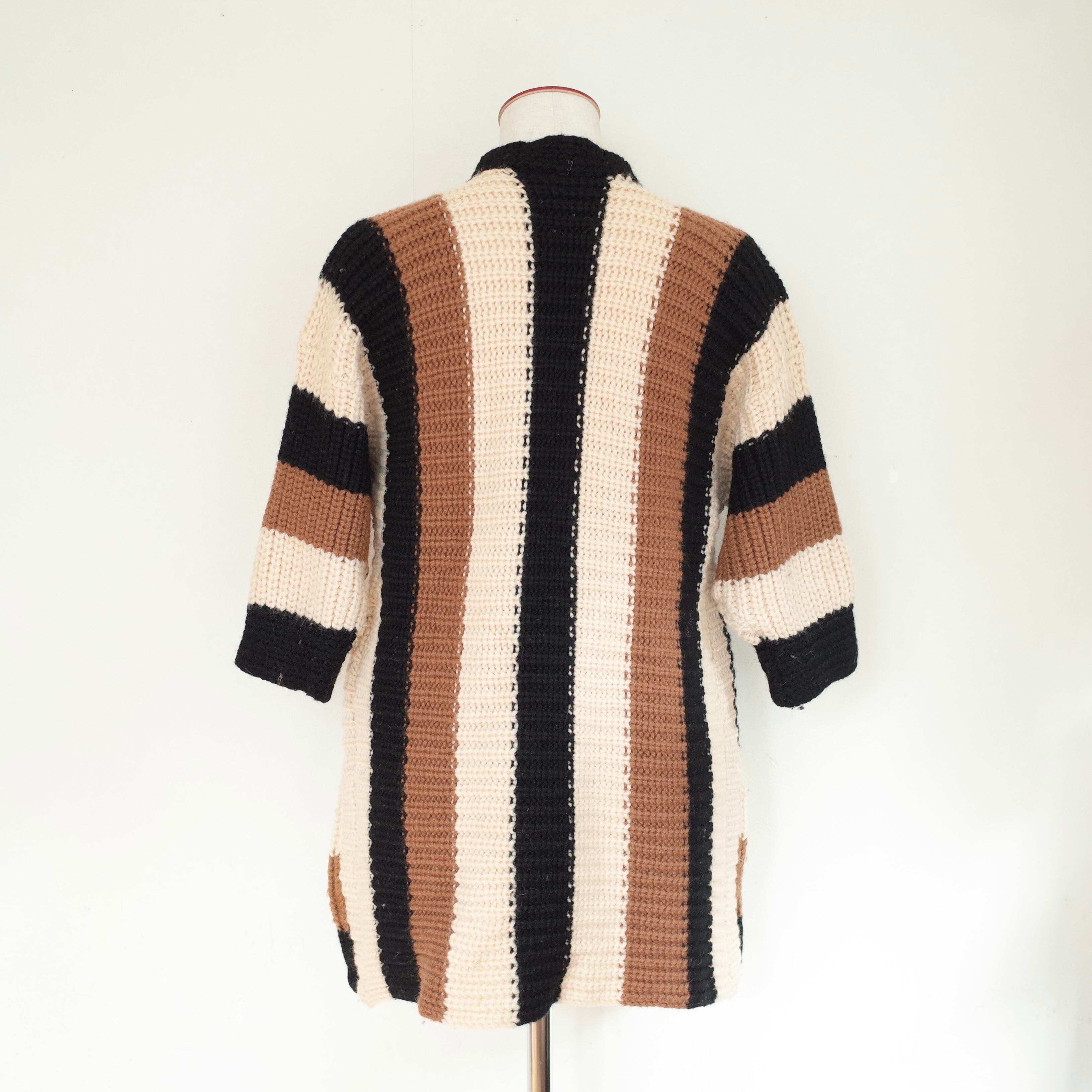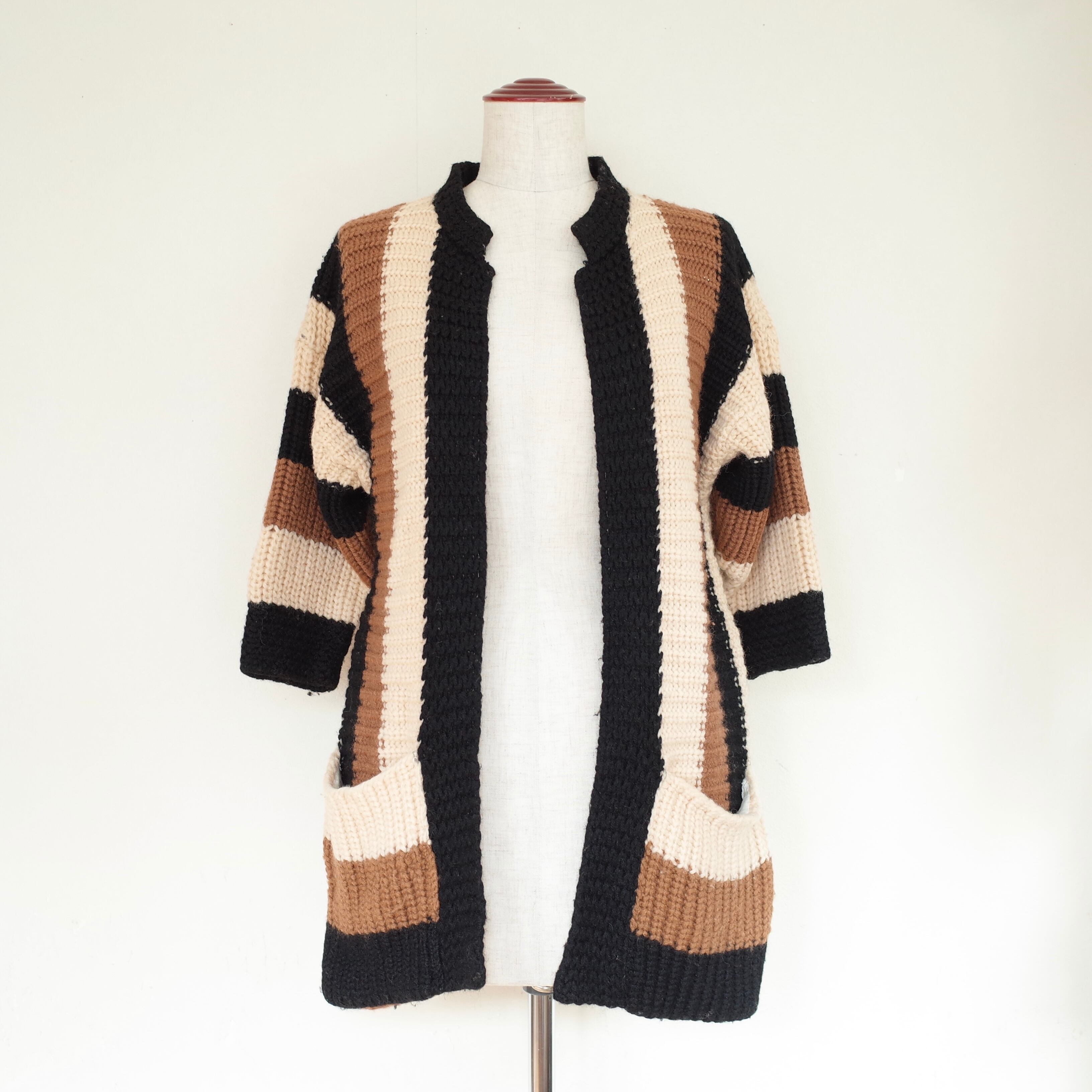 ブラック×ブラウン×ベージュの落ち着いた配色が可愛いニットカーディガン。5分丈なので、下にボウタイブラウスなどをレイヤーしてあえて袖からブラウスを出して着用しても◎色々な着方が出来るので、スタイリングを考えるのが楽しくなる一着です。