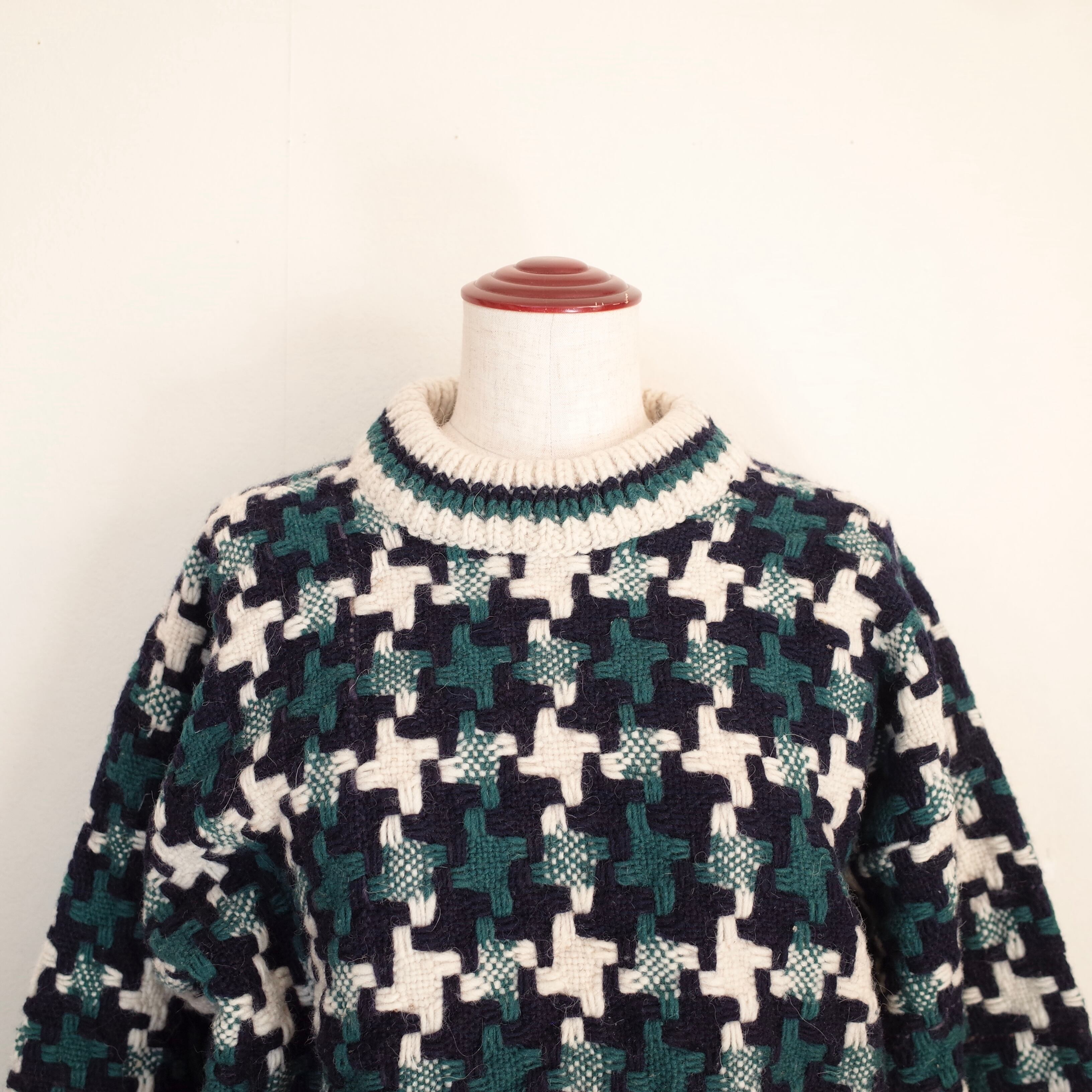 織物のような編み方のセーター。2色のラインが入った太めのピッチのリブが全体をまとめてくれています。ホワイト×ネイビー×グリーンの糸がミックスされた目を引く柄。手の込んだ一着です。こちらはユニセックスで着用できるサイズ感です。