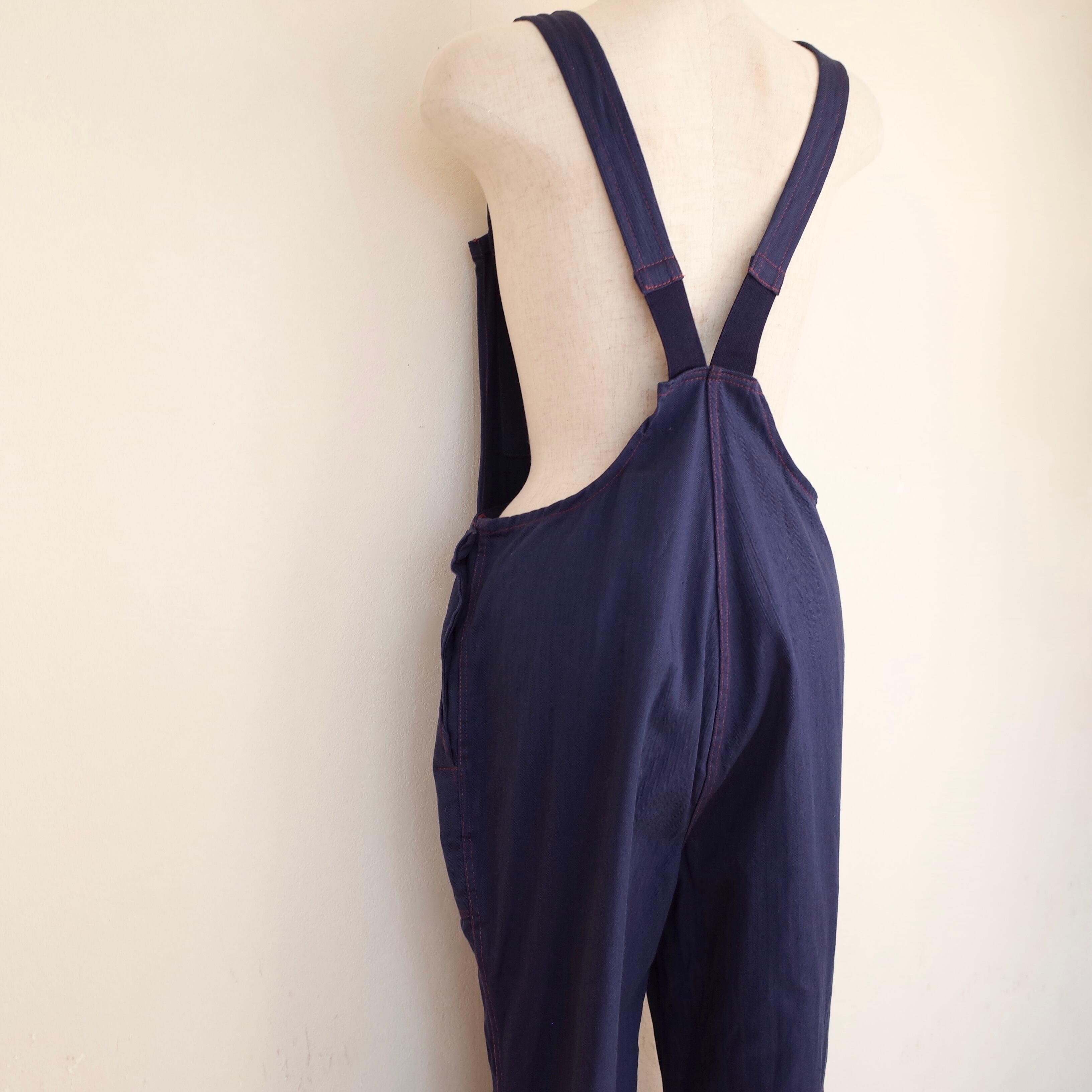 ユーロワークのオーバーオール。ヨーロッパのワークウェアは機能面に加え、ヨーロッパらしい洗練されたデザインがプラスされているので普段のコーディネートにスッと溶け込んでくれます。こちらは、ネイビー地に赤いステッチが可愛らしいオーバーオールです。肩紐はボタンで2段階に調節可能で、一部分ゴムになっている為脱ぎ着もしやすくなっています。