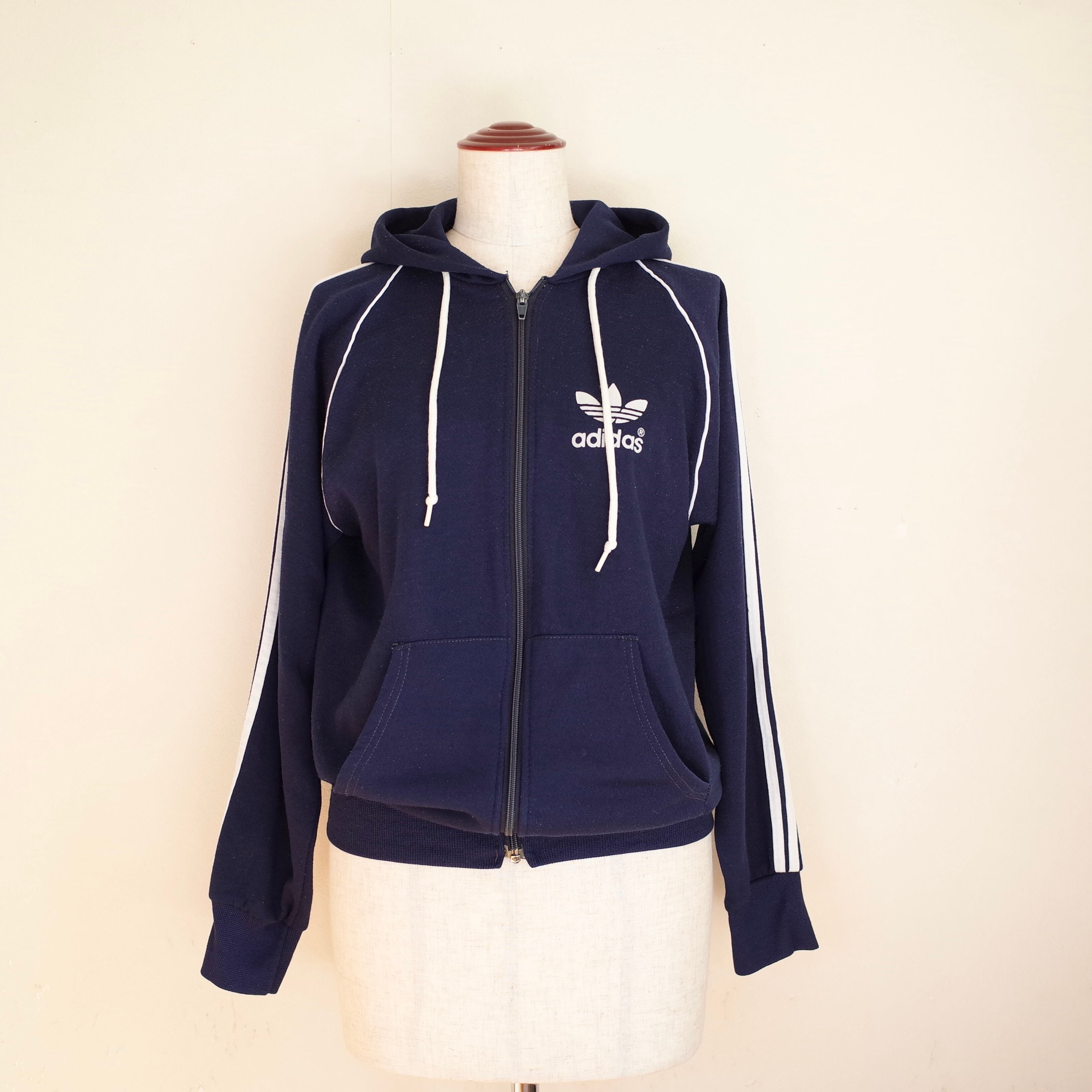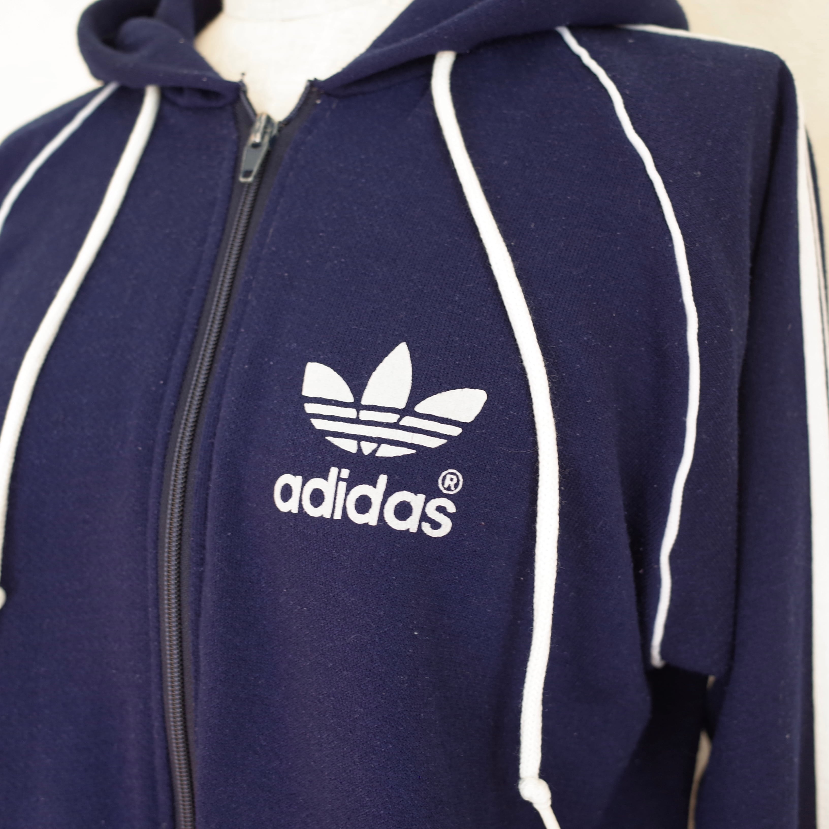 80年代アメリカ製adidasのパーカーです。ネイビーにホワイトの3本ライン。ラグランで袖口にはホワイトのパイピングが施されています。サイズ感もよく、雰囲気抜群な一枚です。