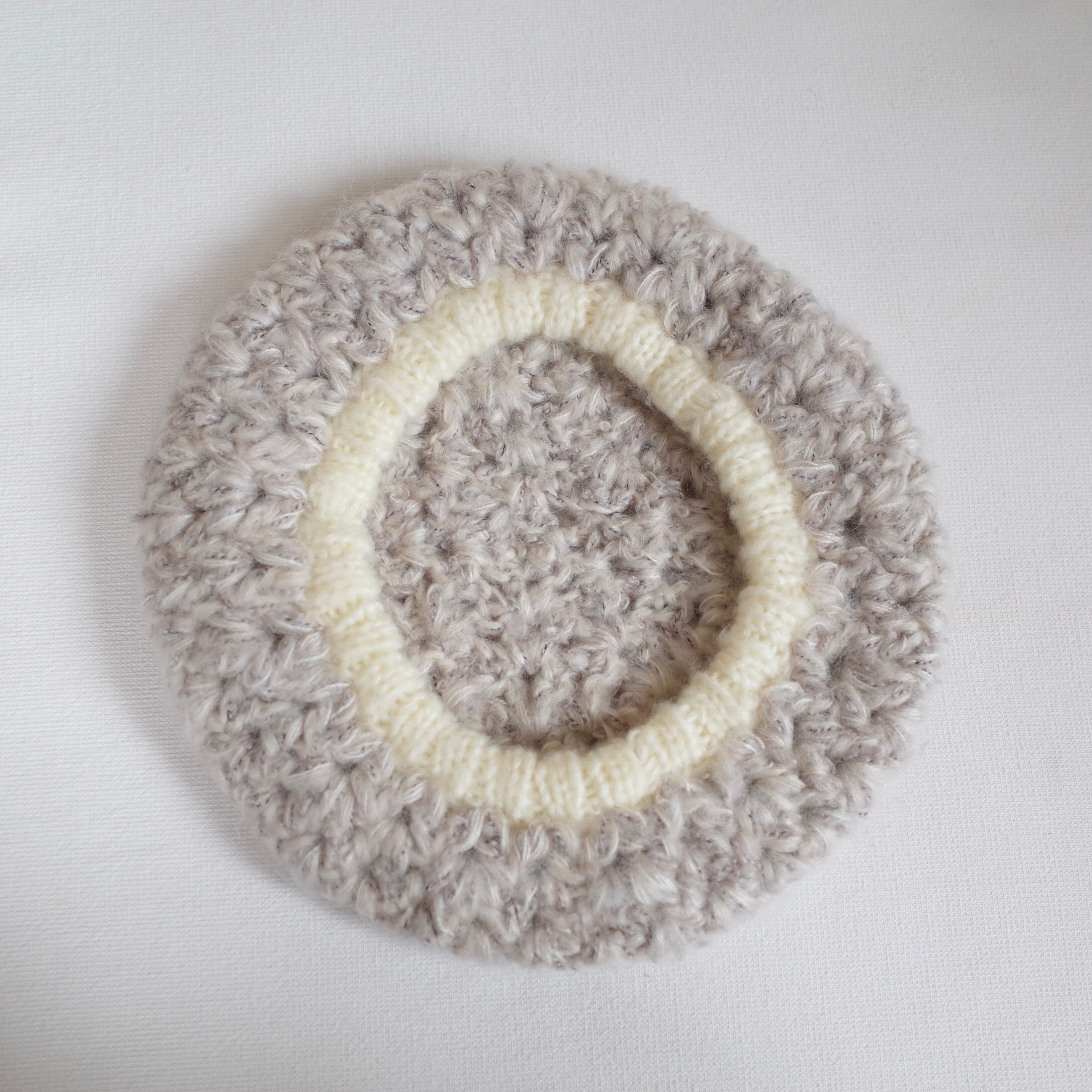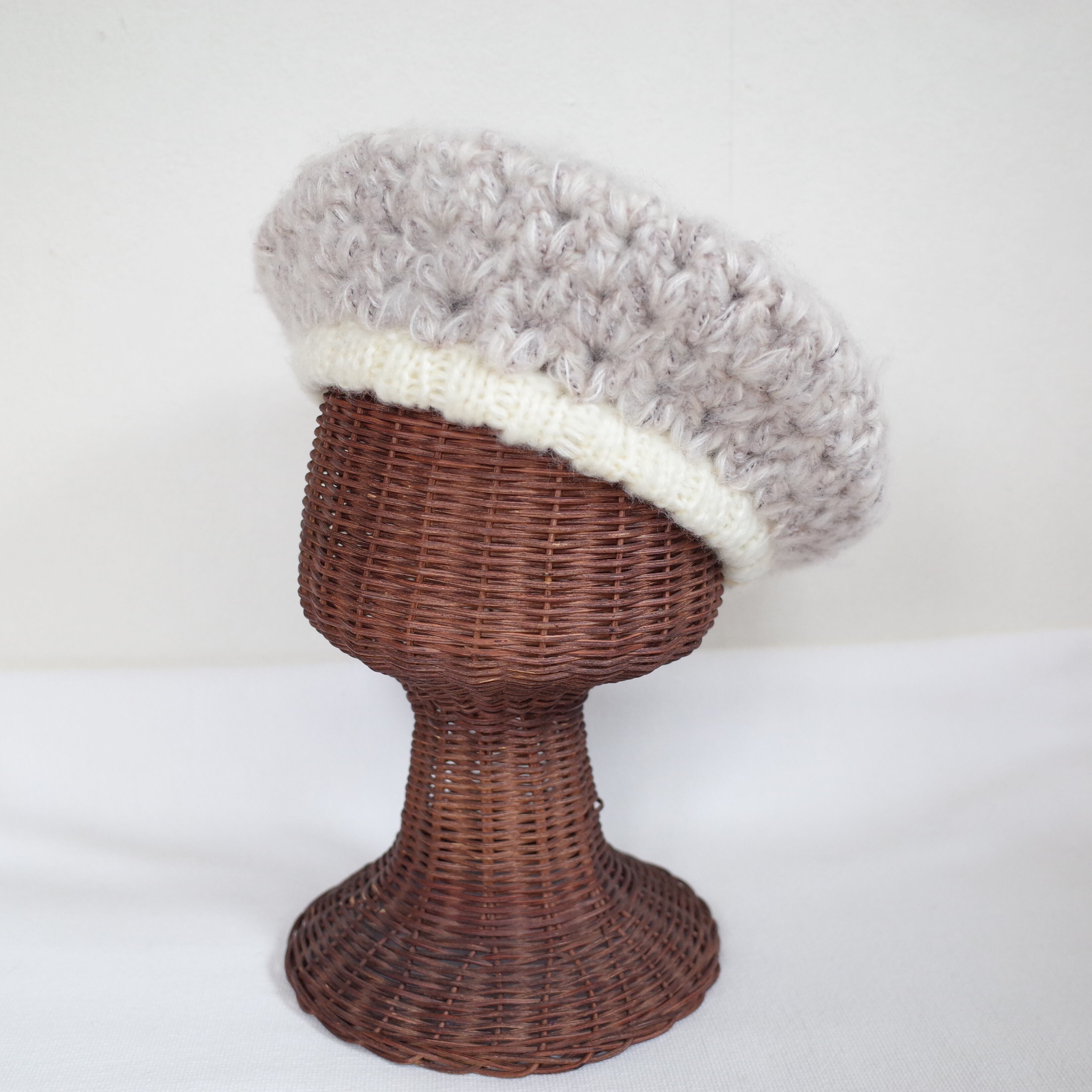 ハンドニットのベレー帽。優しいカラーの配色で、ざっくりとしたローゲージの編みもかわいいベレー帽。