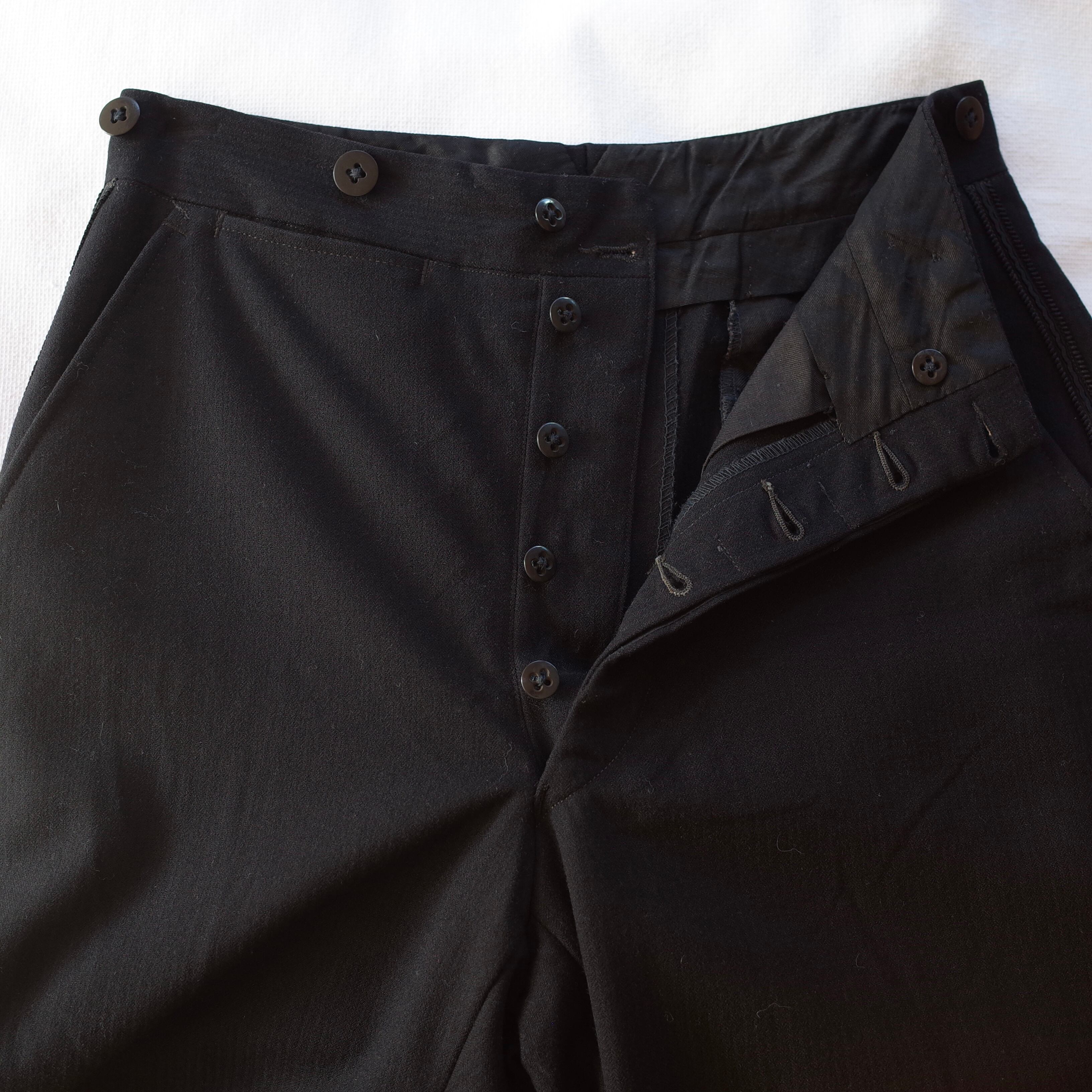 サイドにラインの装飾が施されたメンズライクなスラックスパンツ。サスペンダーを付けられるボタンも付いています。しっかりとしたウールのような素材で、ゆるく履けるストレートシルエットにラインがハンサムな印象の一本。裏地はつきません。