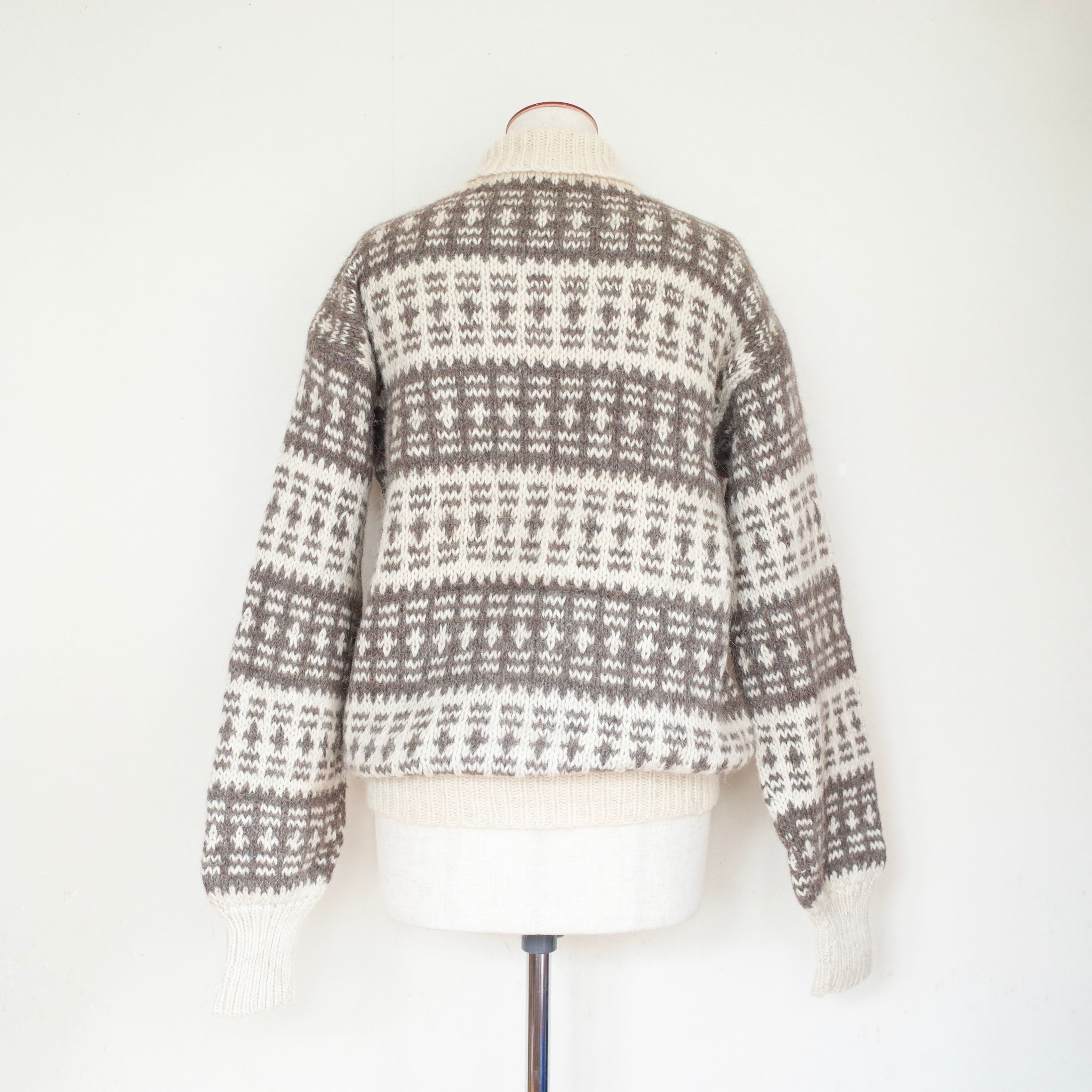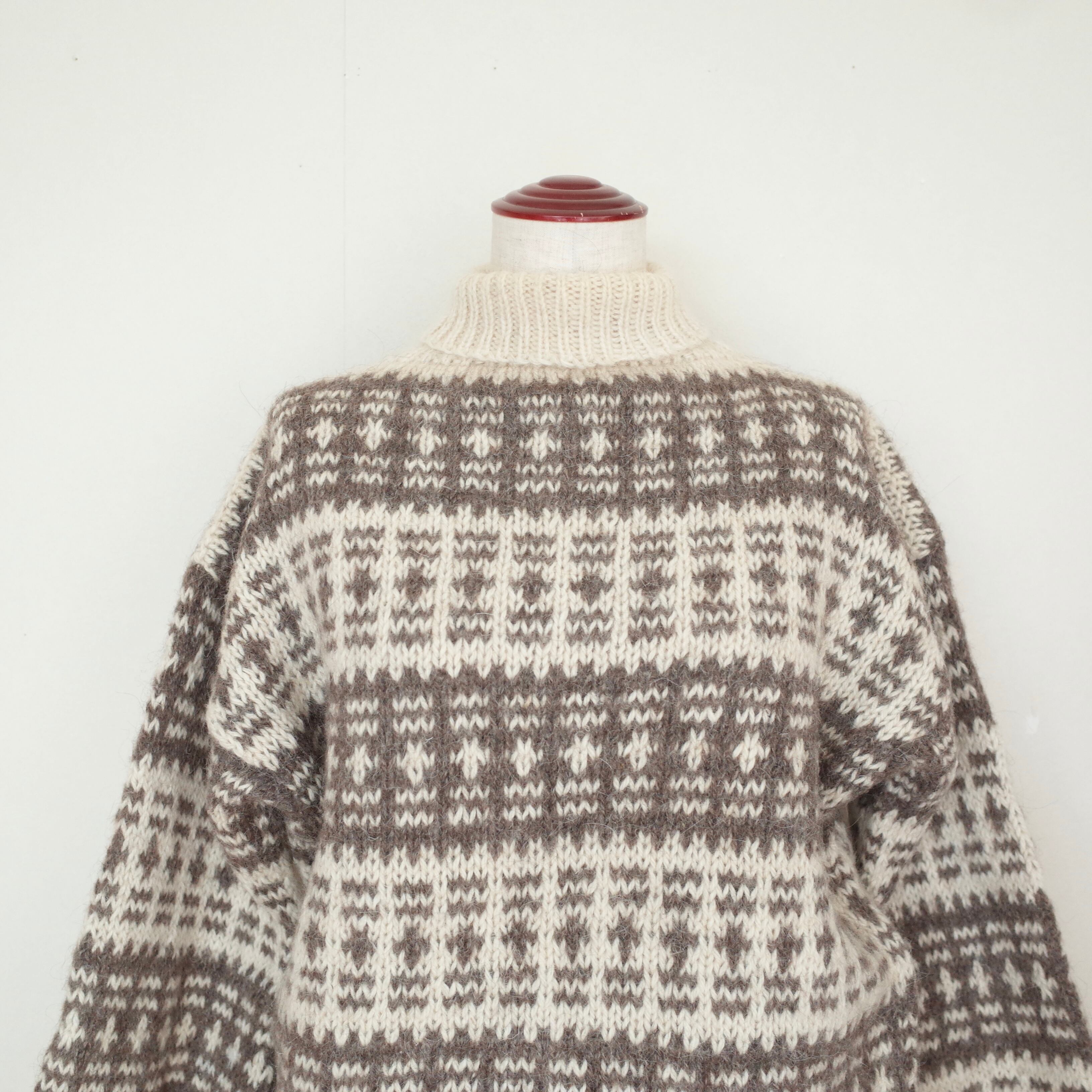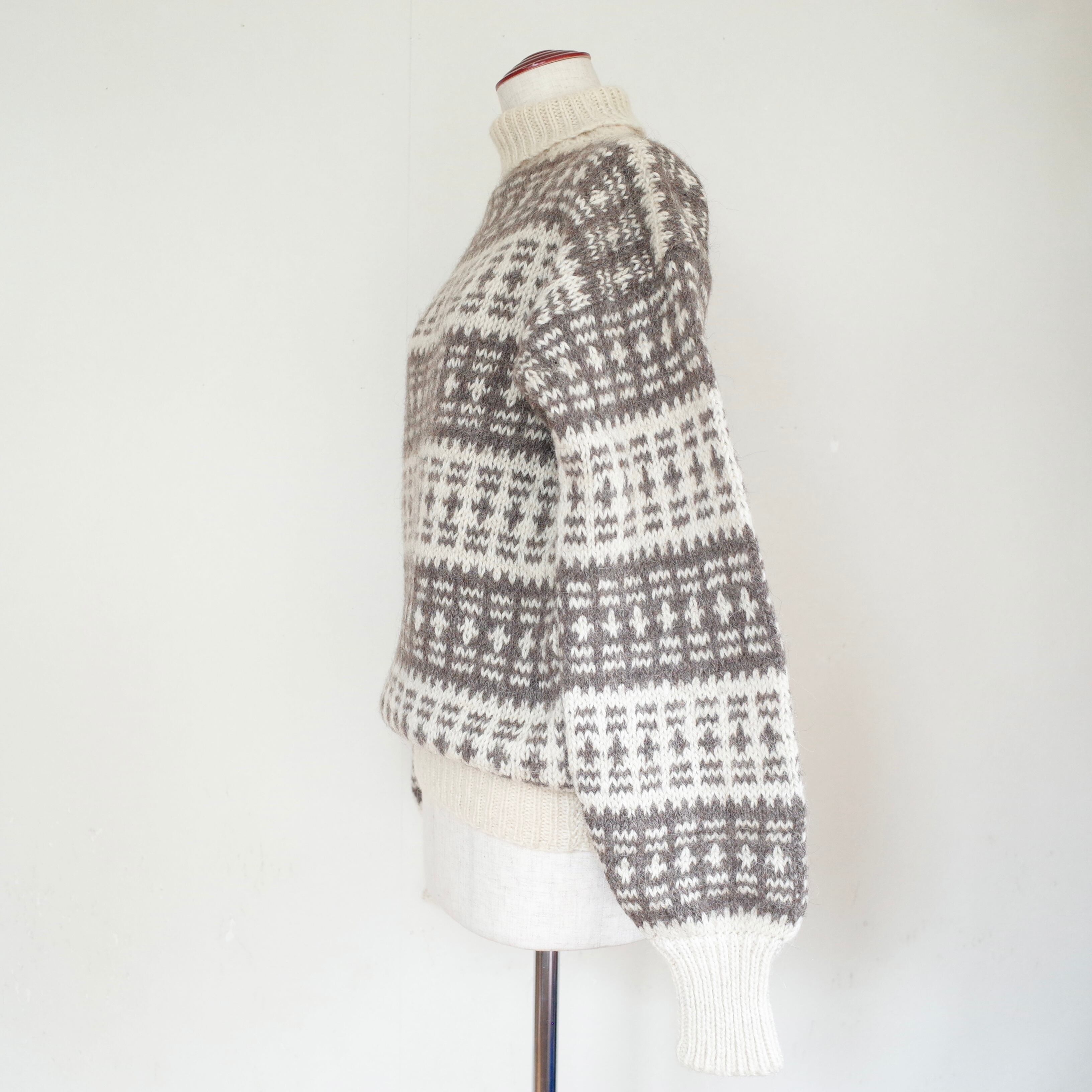 タートルネックのハンドニットセーター。少しゆったりとしたサイズ感で、ドロップショルダーになります。タートルネックは12cmなので伸ばしても折り返しても◎袖口の長めのリブがしっかりと手の甲を包んでくれるので袖をくしゅくしゅさせて着るとかわいいです。