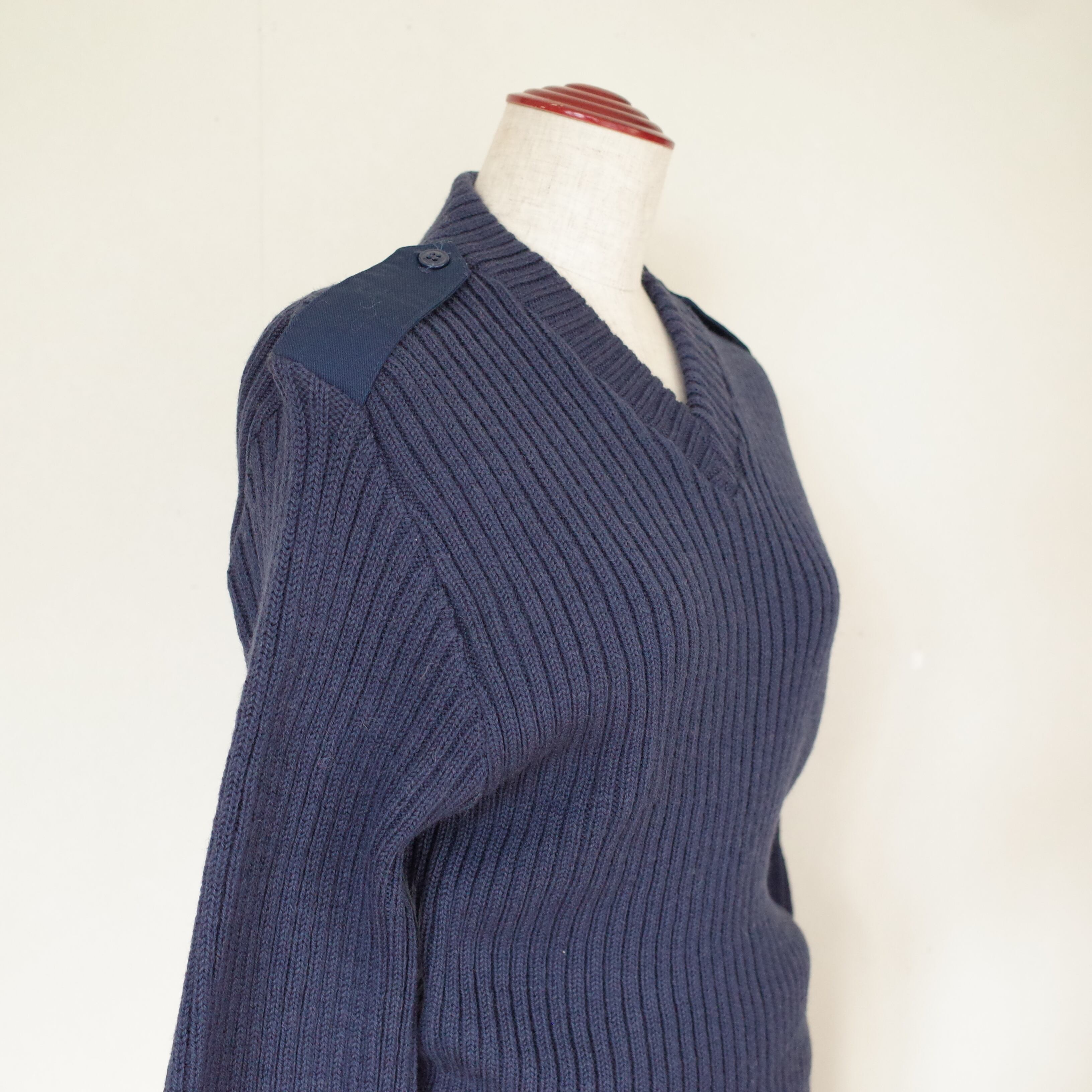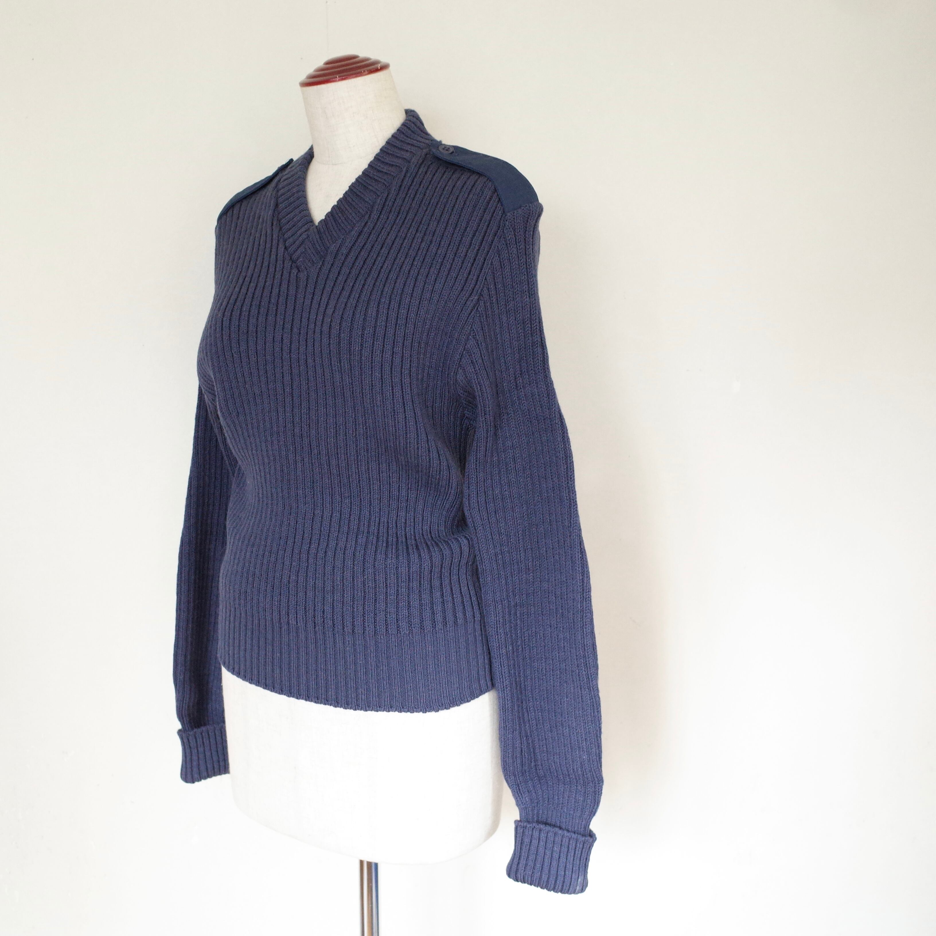 アメリカ製米軍のコマンドセーターです。体にフィットするような太めのリブ。肘には補強のためのエルボーパッチが付いています。Vネックで、小さめサイズ。丈も長すぎず、バランスが抜群です。機能性を重視した軍物ですが、ロングスカートやワイドパンツと合わせたコーディネートで可愛らしさをプラスしても◎