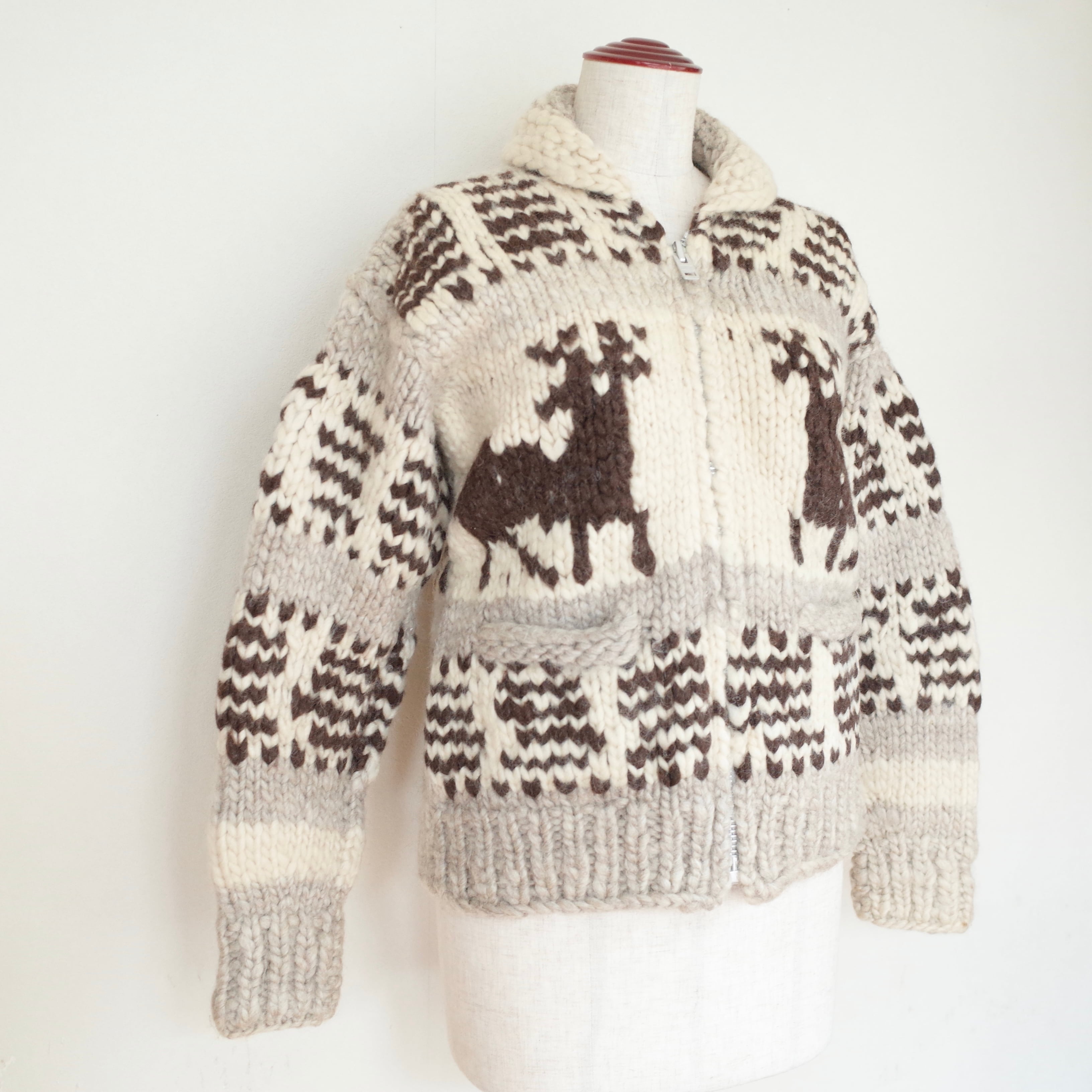 トナカイ柄がかわいいカウチンセーター。野暮ったくならない、ジャストサイズ。伝統的なグレー、アイボリー、ブラウンの羊毛でナチュラルなカラーが使われている為、柄物のボトムなどとのコーディネートも楽しめる一着です。