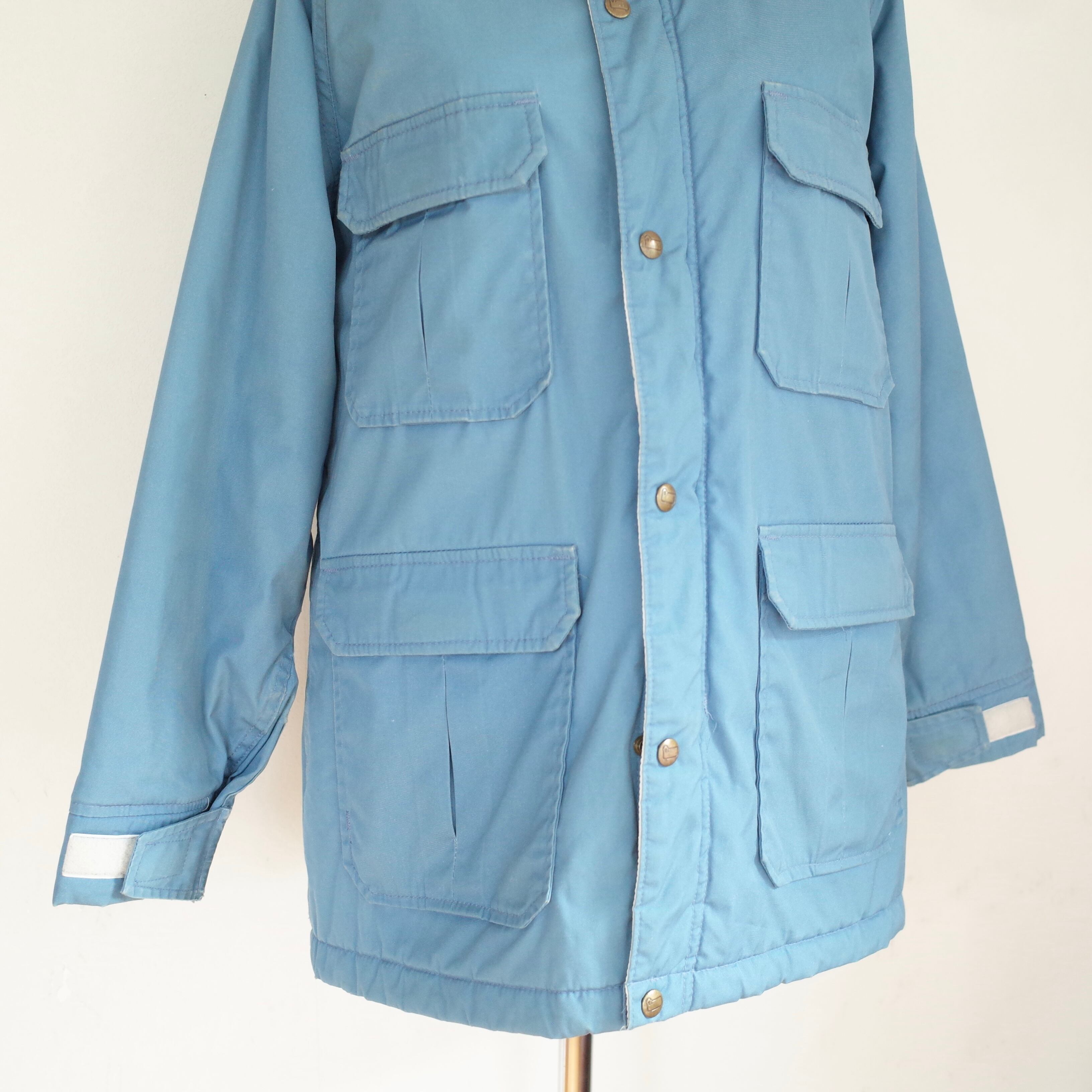 80年代アメリカ製Woolrich WOMANのマウンテンジャケット。お尻まで隠れる長めの着丈と、内側は中綿仕様になっていて、暖かいジャケット。シェルのライトブルーとライナーのホワイトの配色の良い一枚です。
