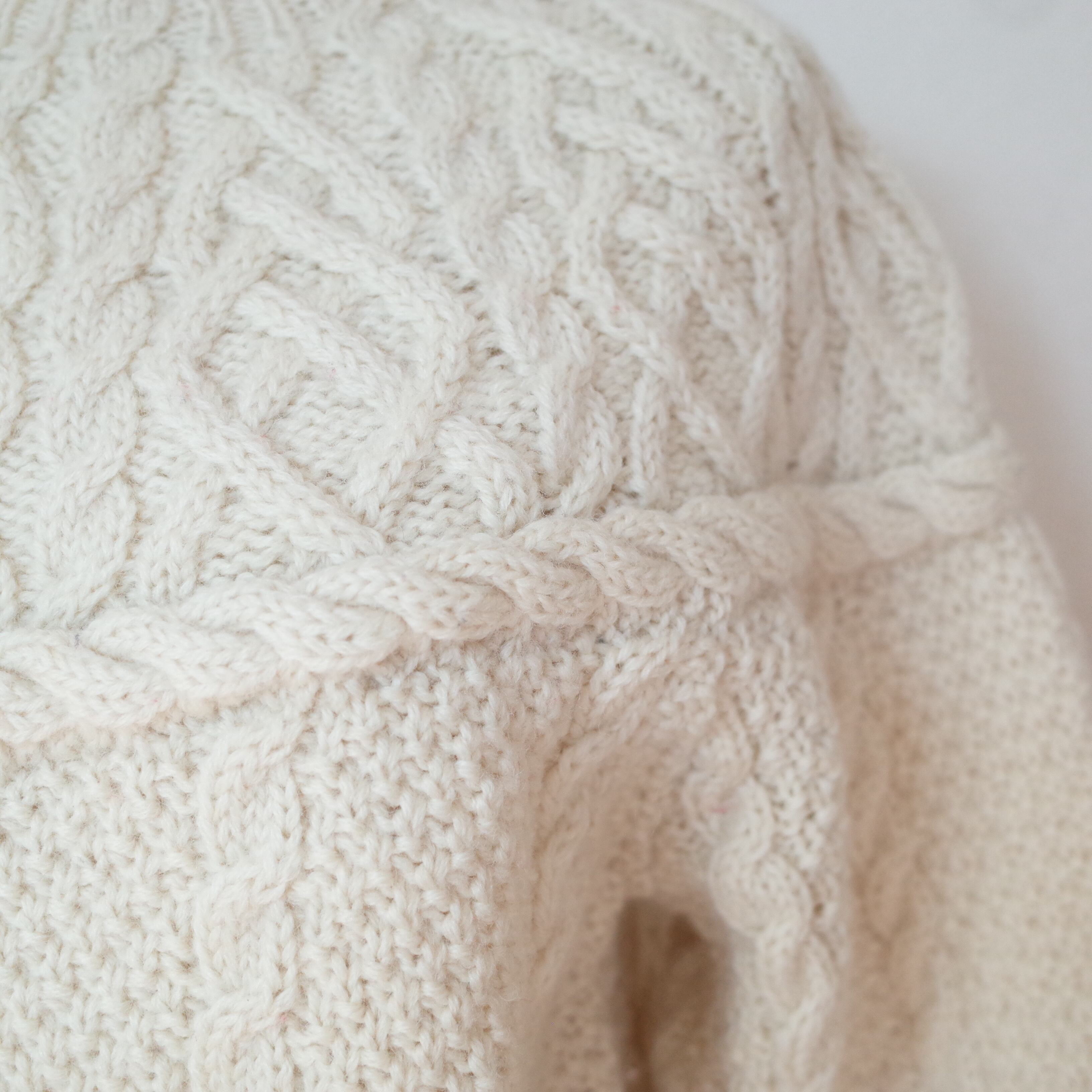 胸元での切り替えがかわいいケーブル編みのセーター。柔らかい雰囲気で丸みを帯びたシルエットも可愛らしいセーターです。