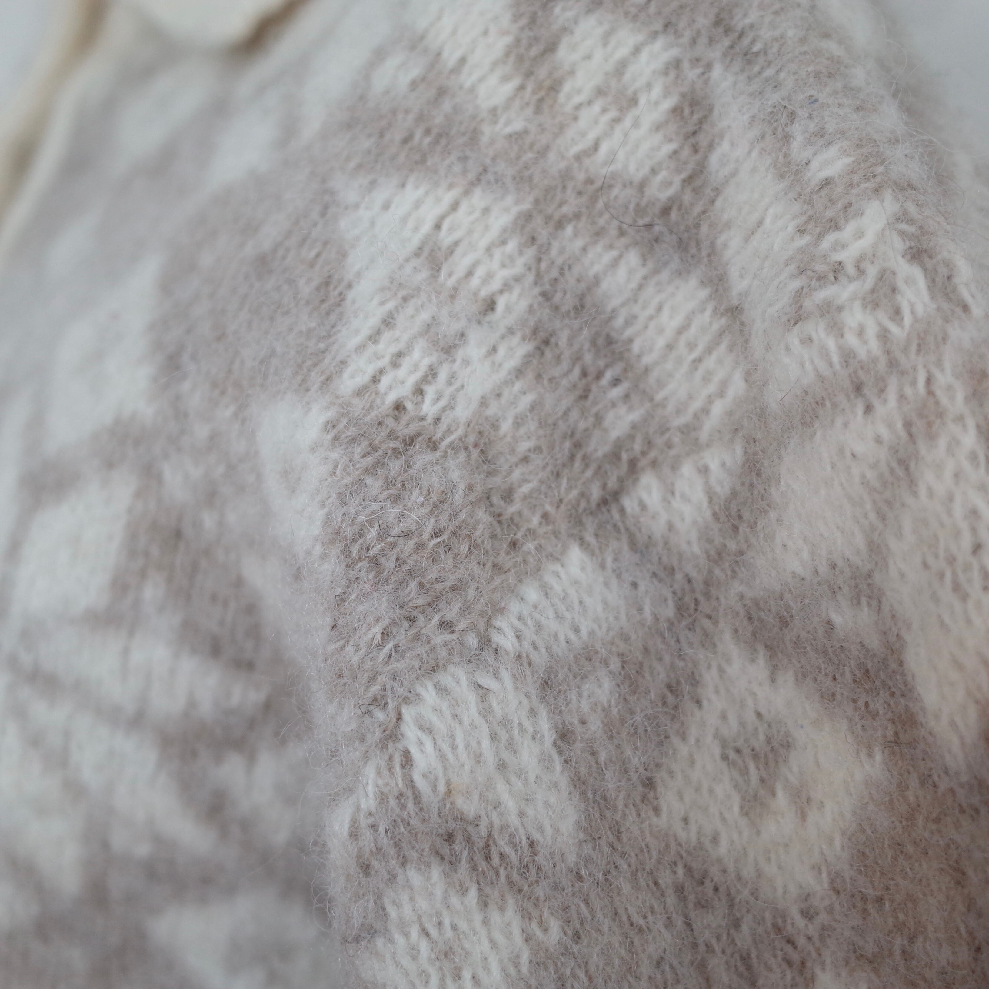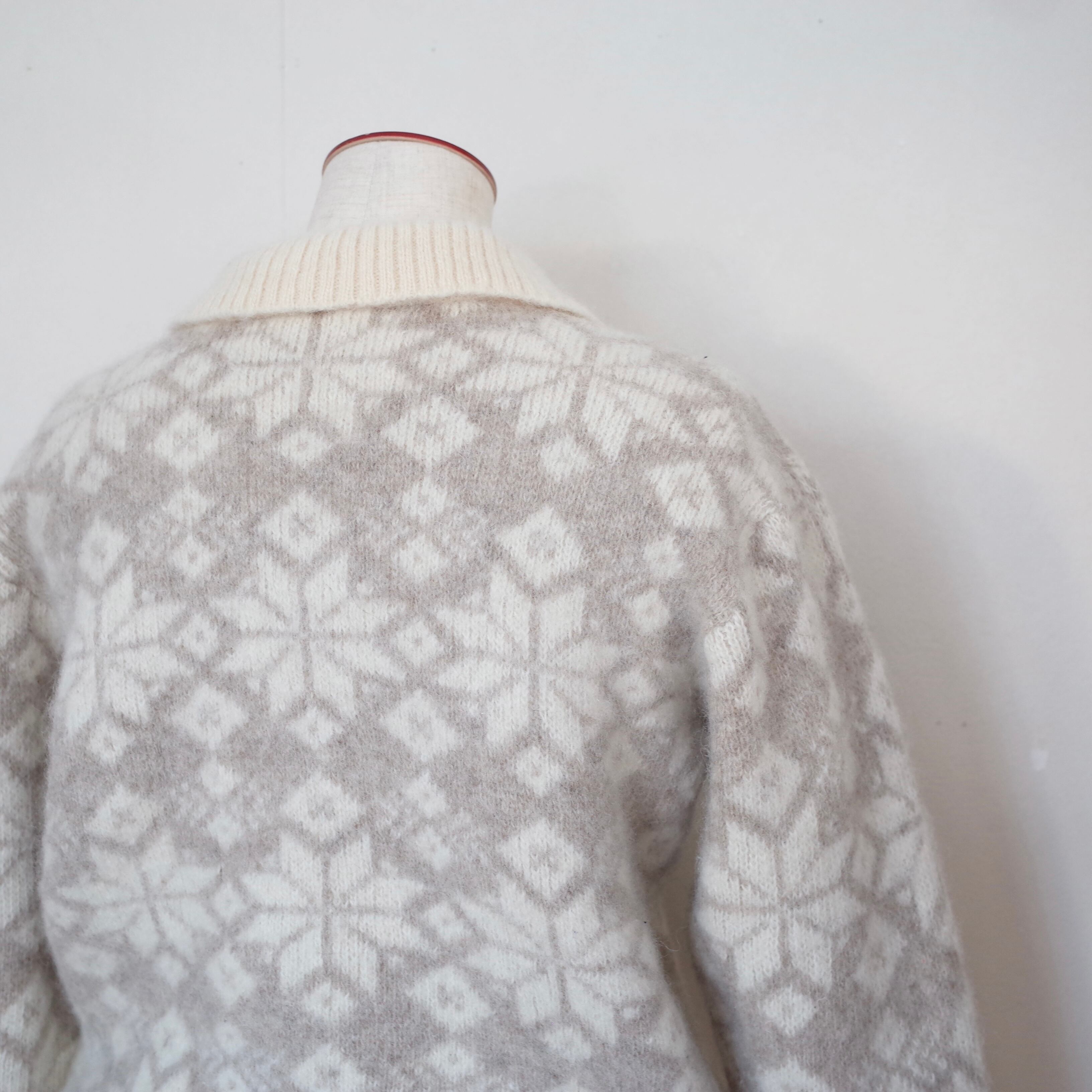 アイスランド製襟付きのセーター。たくさんついたボタンが可愛らしいデザイン。ライトグレーとホワイトの淡い配色のノルディック柄が柔らかい雰囲気です。モヘアのようにふわふわしていて、しっかりと目の詰まった暖かい一枚です。