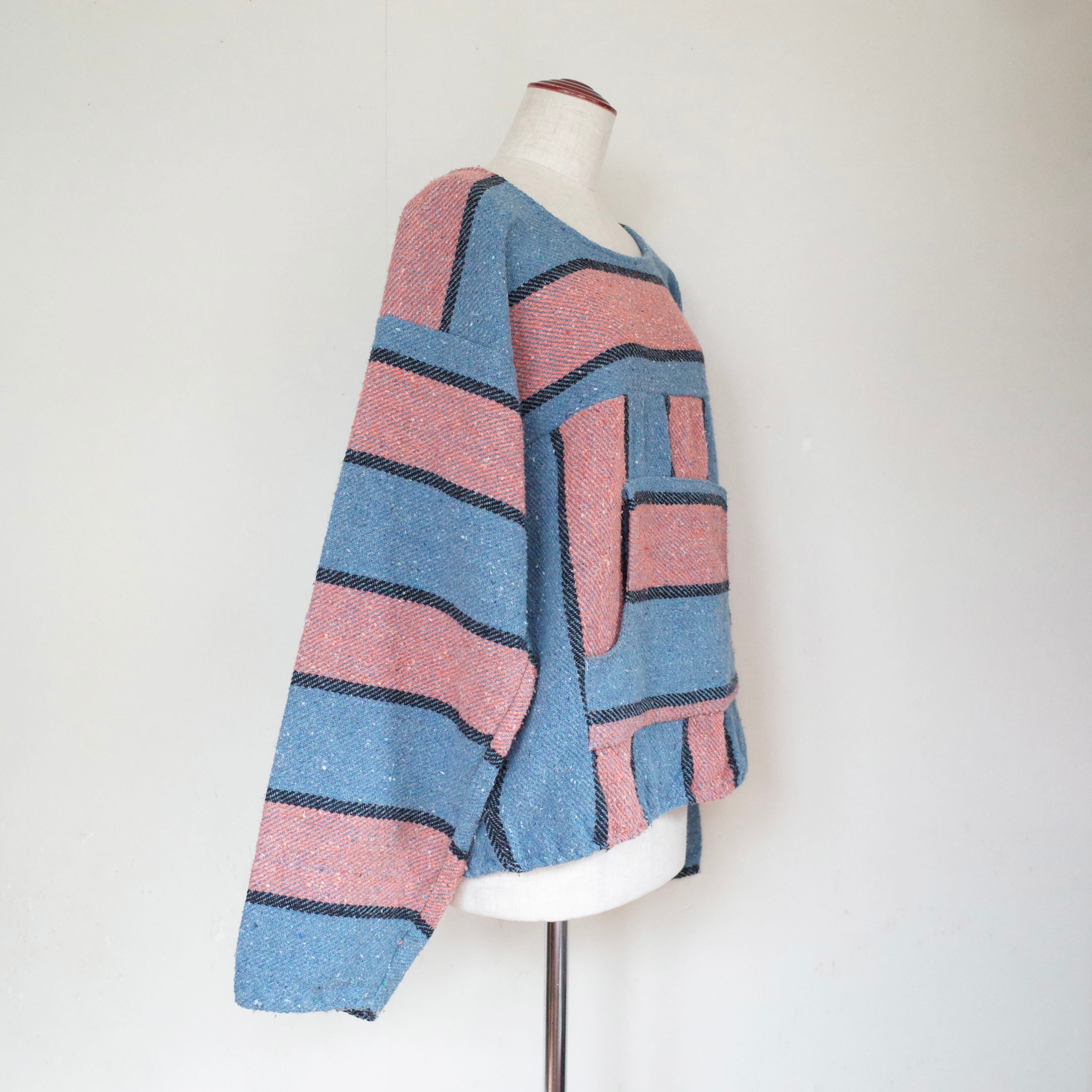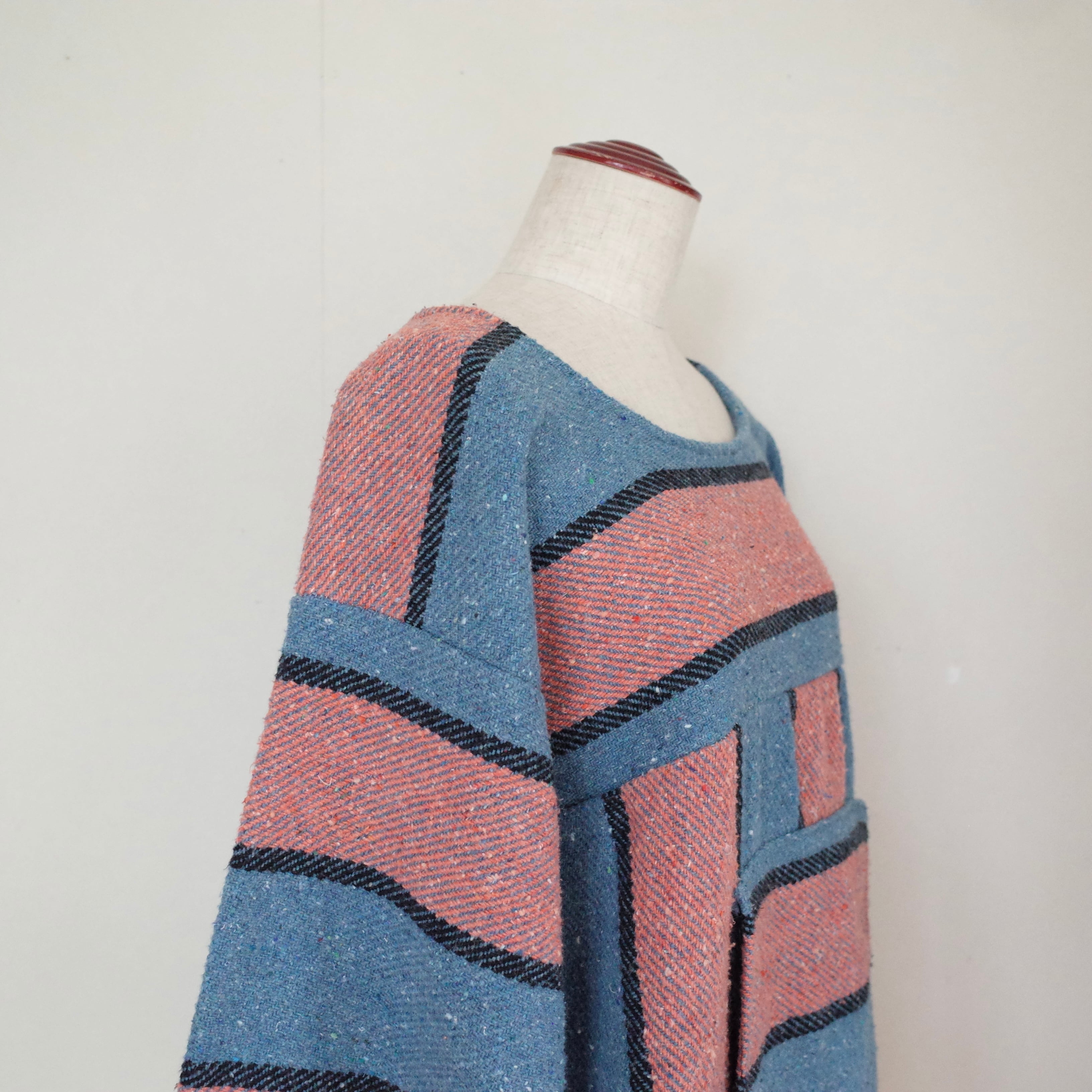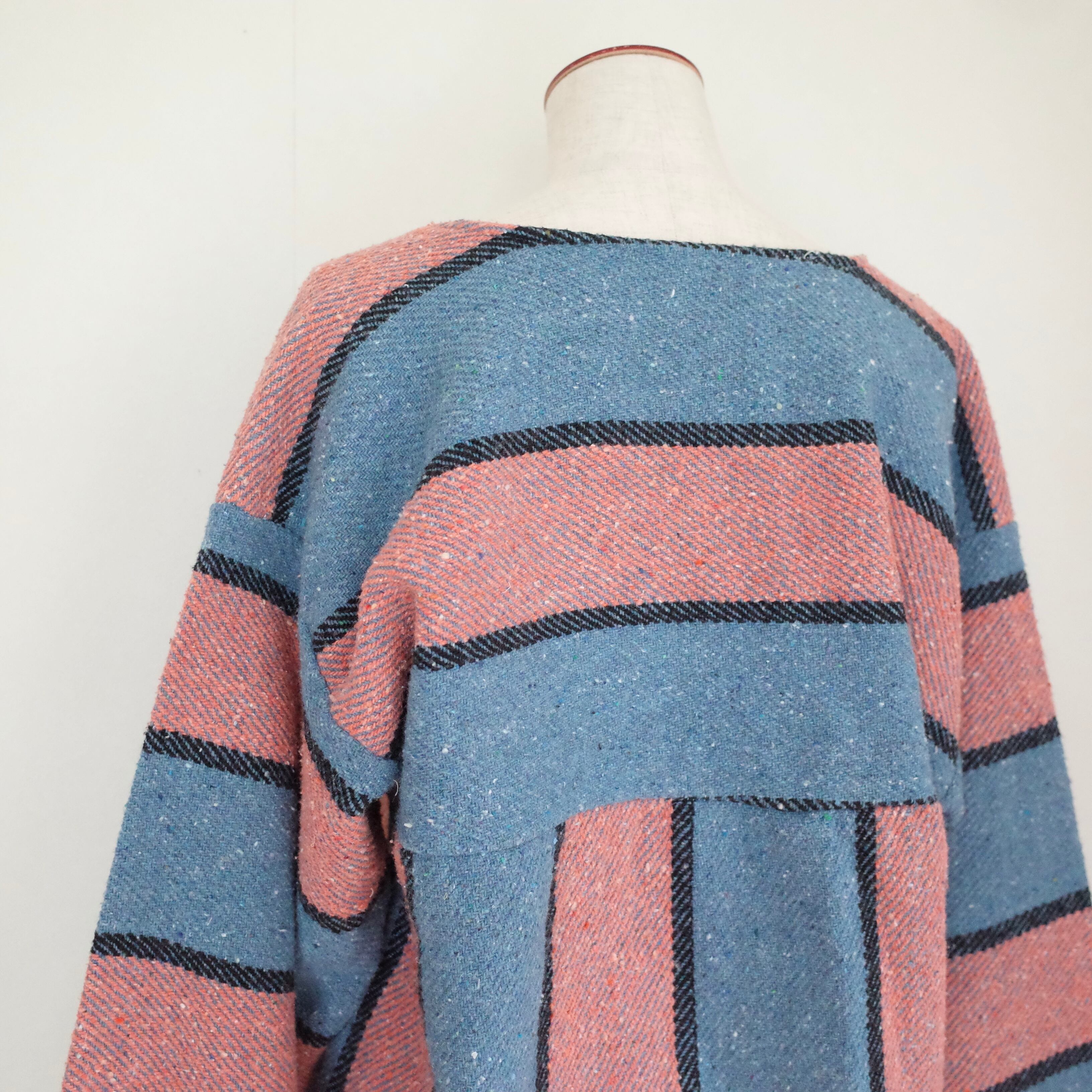 ヒッピー&サーフのアイコン、メキシカンパーカーをリメイクした一枚。こちらはフードをなくし、クルーネックに。袖が長めなので、袖口をロールアップしての着用がおすすめです。気軽にバサッと着れるゆったりとしたサイズ感です。