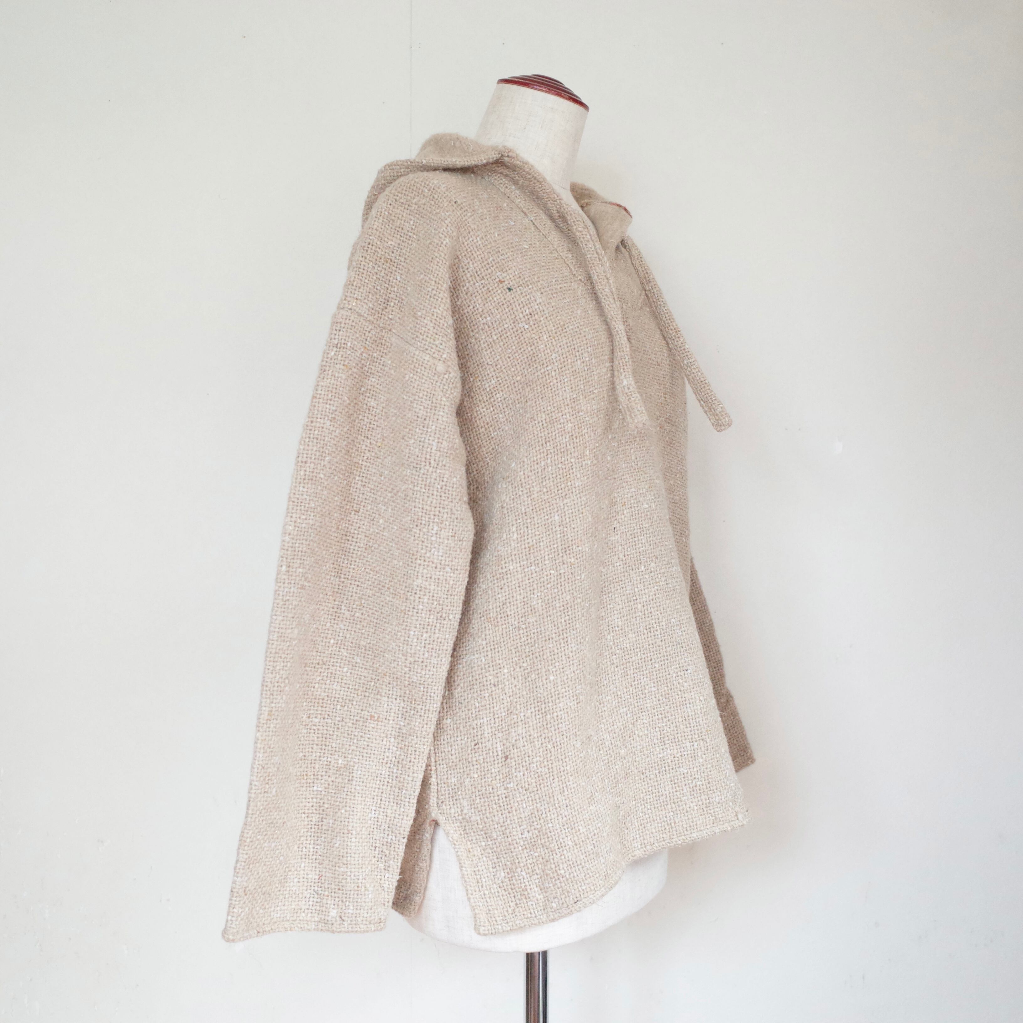 ヒッピー&サーフのアイコン、メキシカンパーカー。最近ではストリートブランドやハイブランドからも出ています。こちらは珍しいベージュの無地タイプ。前の大きなポケットが無いので、オーバーオールとの合わせも◎シャツをインしたり、コートのインナーに仕込めば、程よい抜け感の演出にも。気軽にバサッと着れるゆったりサイズ。ユニセックスで着用可能なサイズ感です。