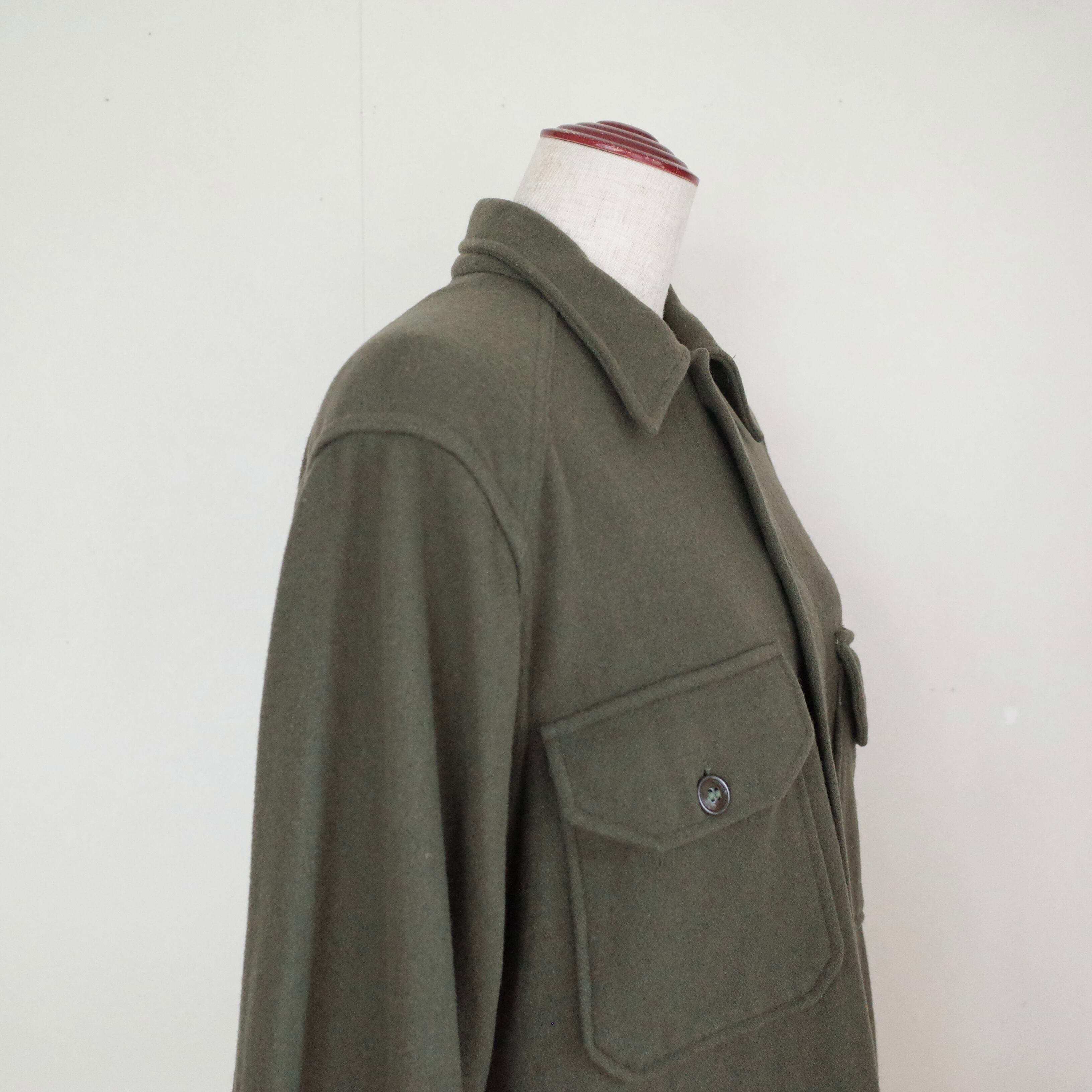 フェルトのような厚手のウール素材のミリタリーシャツジャケット。肩の切り替えや大きく中央のバランスに付いたポケットのデザインなどが魅力的な一枚。羽織としてもトップスとしても着用できるアイテムです。