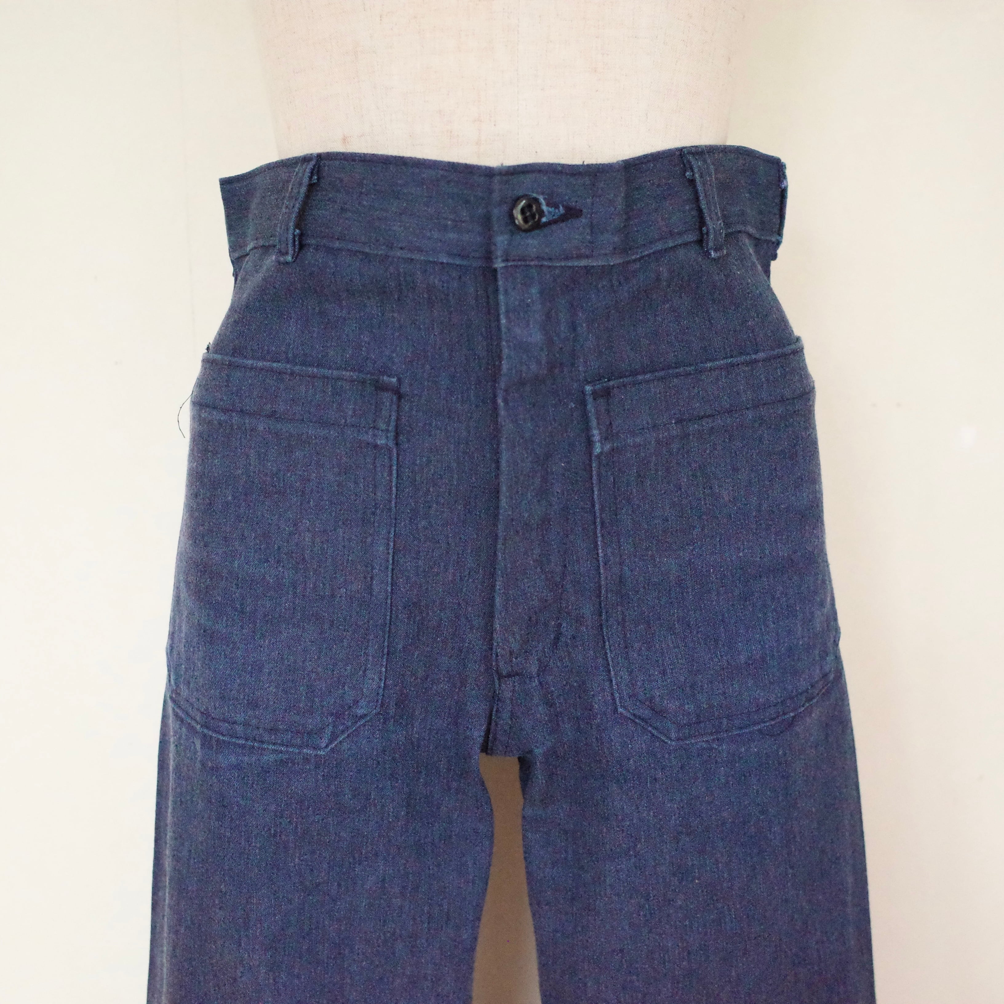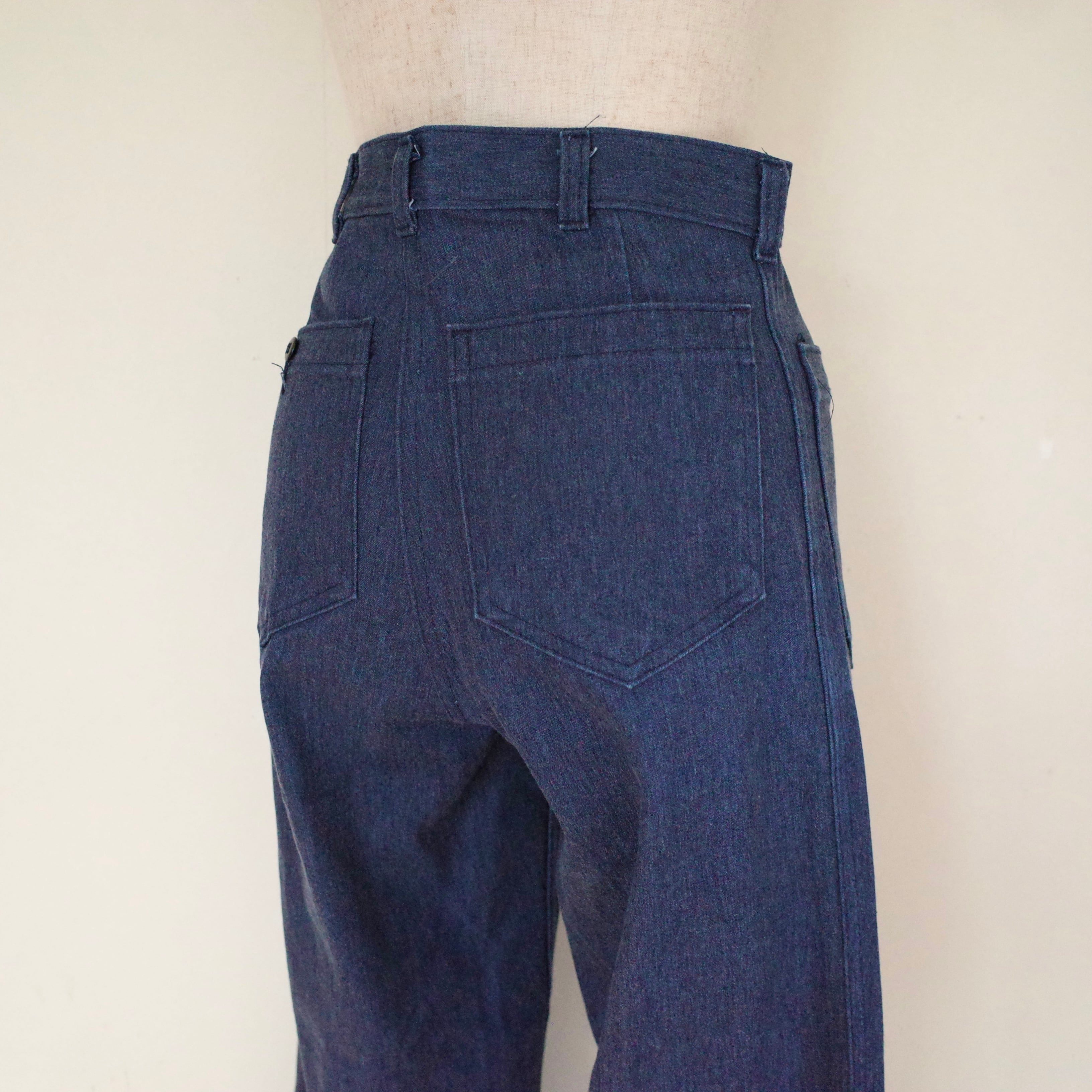 80年代アメリカ製SOUTHERN APPAREL COMPANYのデニムセーラーパンツです。ハイウエストで、レングスは膝から大胆に広がるベルボトムのフレアシルエット。セーラーパンツならではの縦長のフロントポケットが可愛いデザインです。