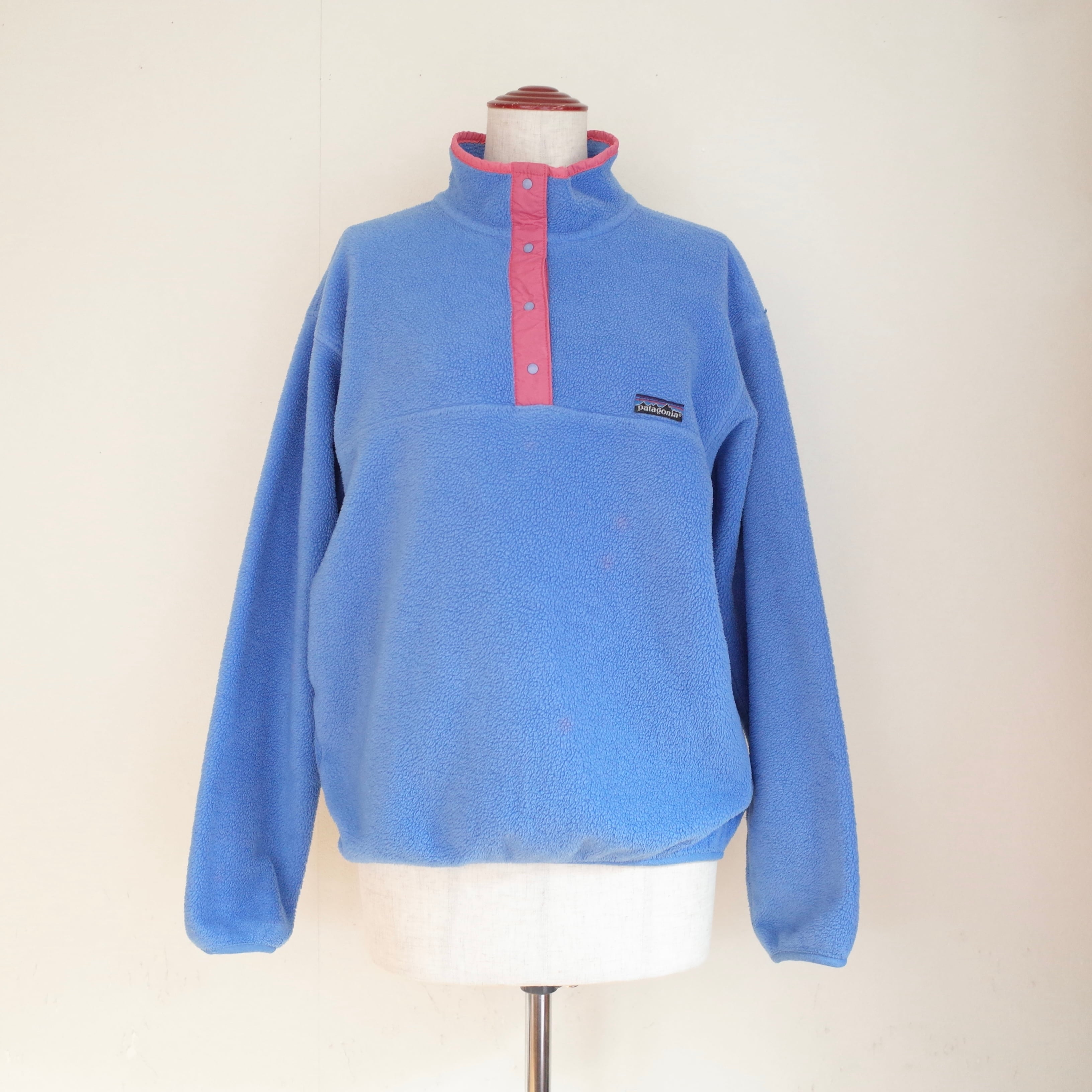 80〜90年代アメリカ製patagoniaのスナップT。スウェット感覚で着られる万能な一枚。鮮やかなブルーのボディにピンクのトリム。暖かい機能性とポップな配色で、アウトドアアイテムなのにスタイリッシュなルックスが魅力的です。デニムはもちろんですが、柄のロングスカートなどとの合わせも◎