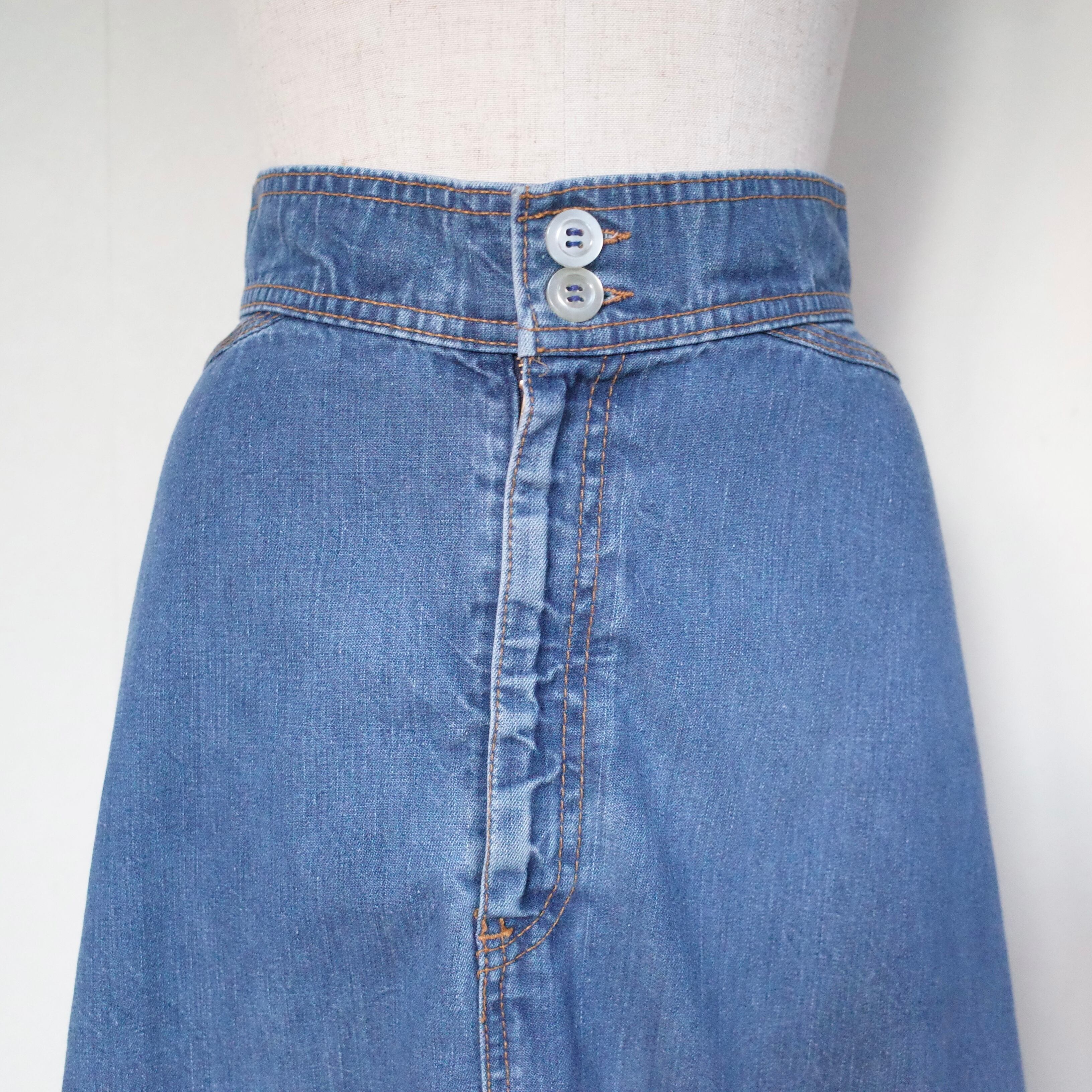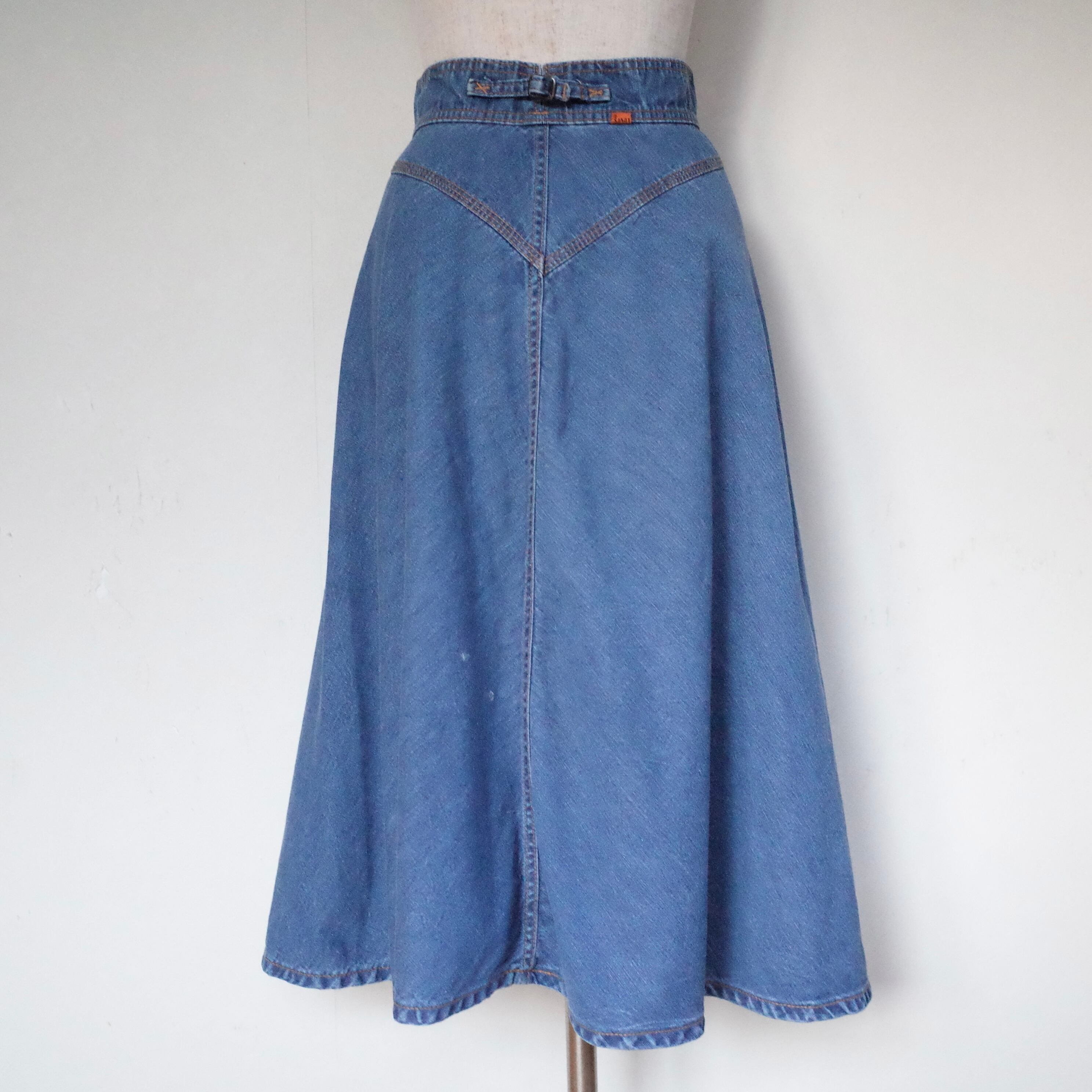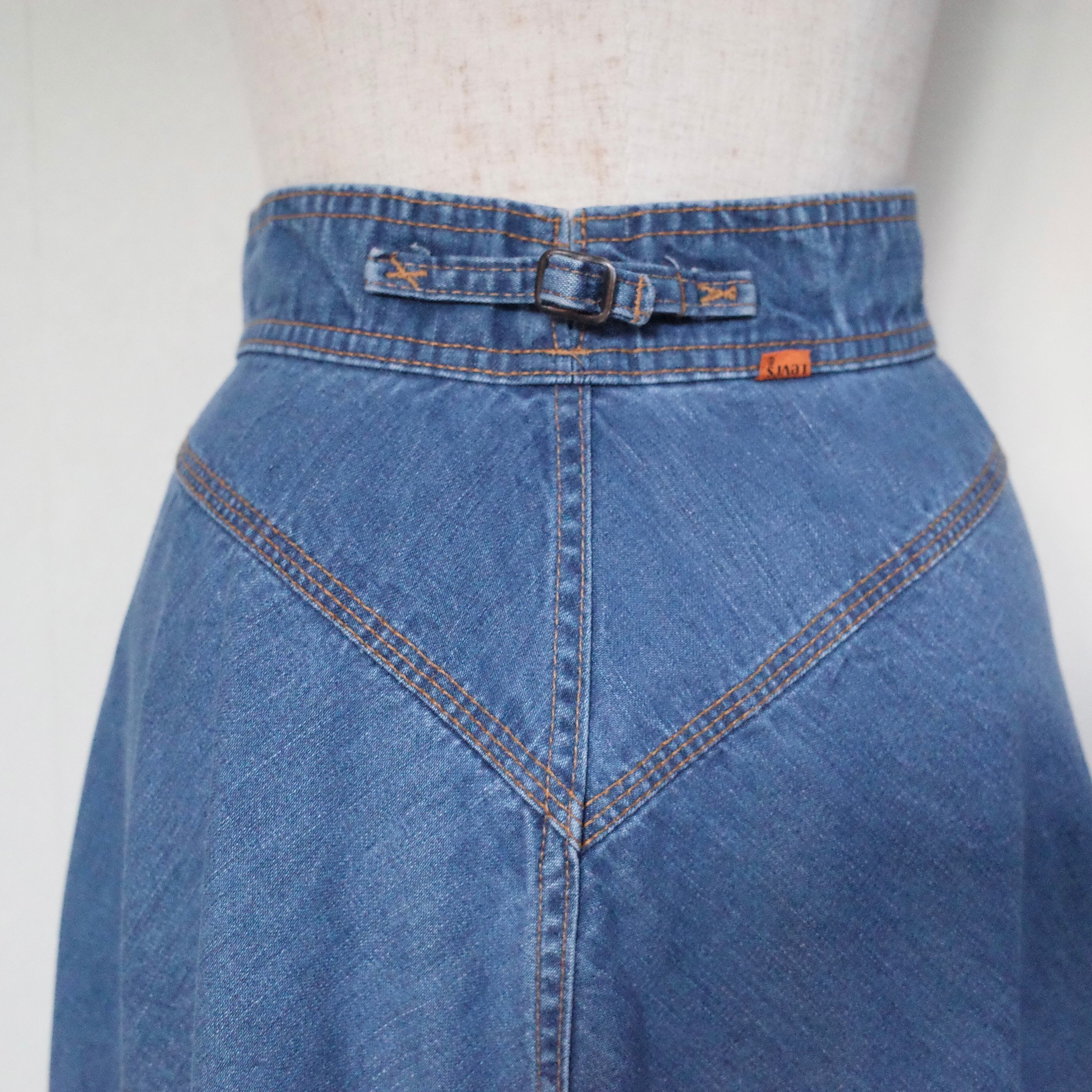 70年代製Levi'sのデニムスカートです。オレンジタブで、薄手の柔らかいデニム素材のミモレ丈スカート。ウエスト後ろにベルトが付いていて、切り替えのデザインも70年代らしい一枚。バックスタイルが可愛らしいスカートです。