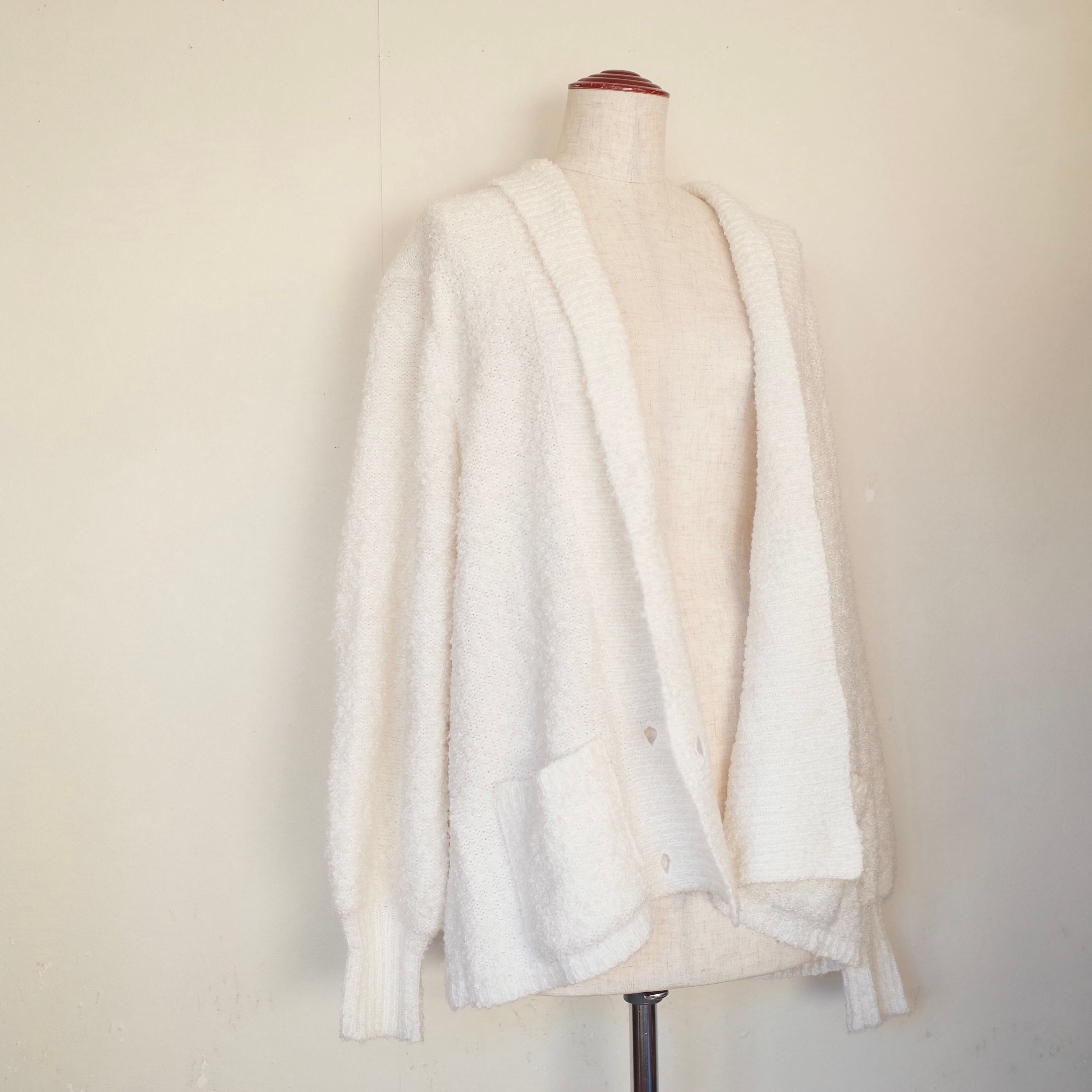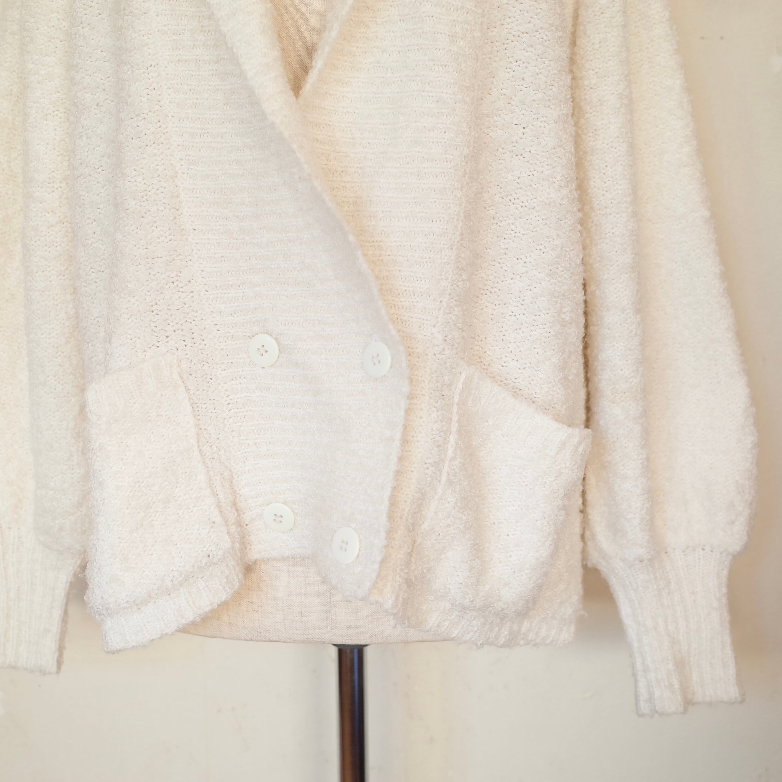 アクリルニットのカーディガン。ボタンはダブルで、ゆるっとした大きめのシルエットです。ふんわりとした袖のデザインが可愛らしい一枚。これからの季節、さらっと羽織るのに便利でデザインの良いカーディガンです。