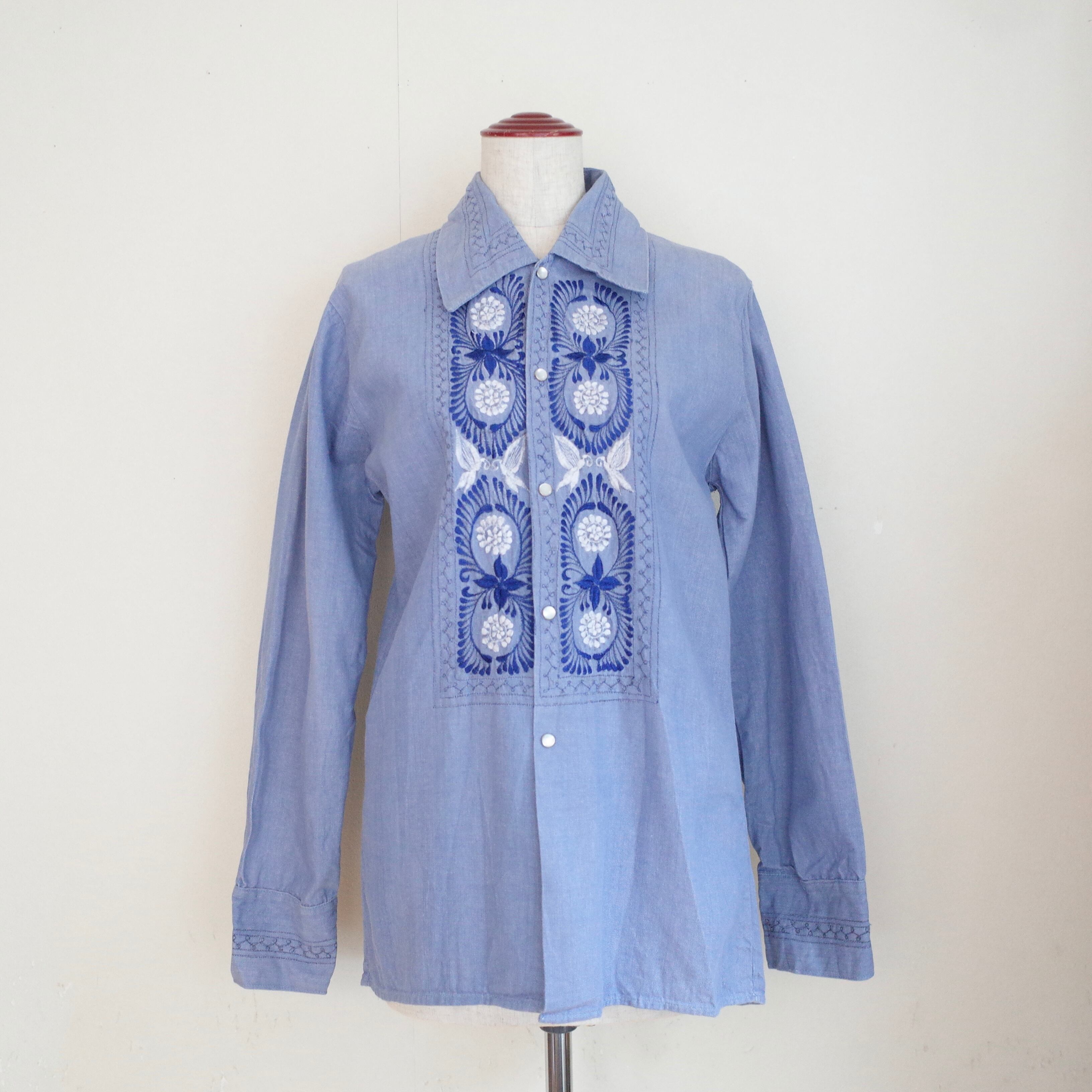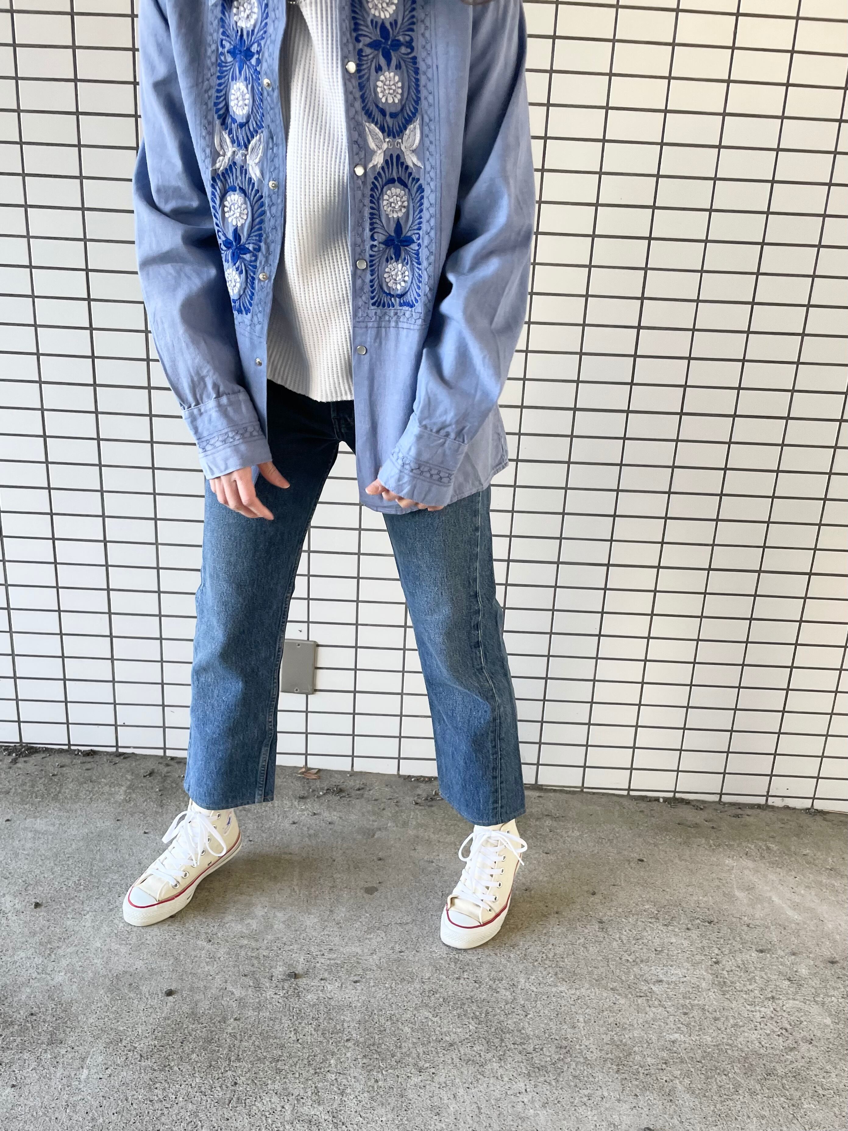 薄いデニム素材のような生地に、ブルーとホワイトの刺繍が綺麗なシャツ。張りのある薄手の生地感で、Tシャツの上にさらっと羽織るのにちょうど良い一枚。襟や袖口にも入ったさり気ない刺繍も◎デニムonデニムのコーディネートにもおすすめです。