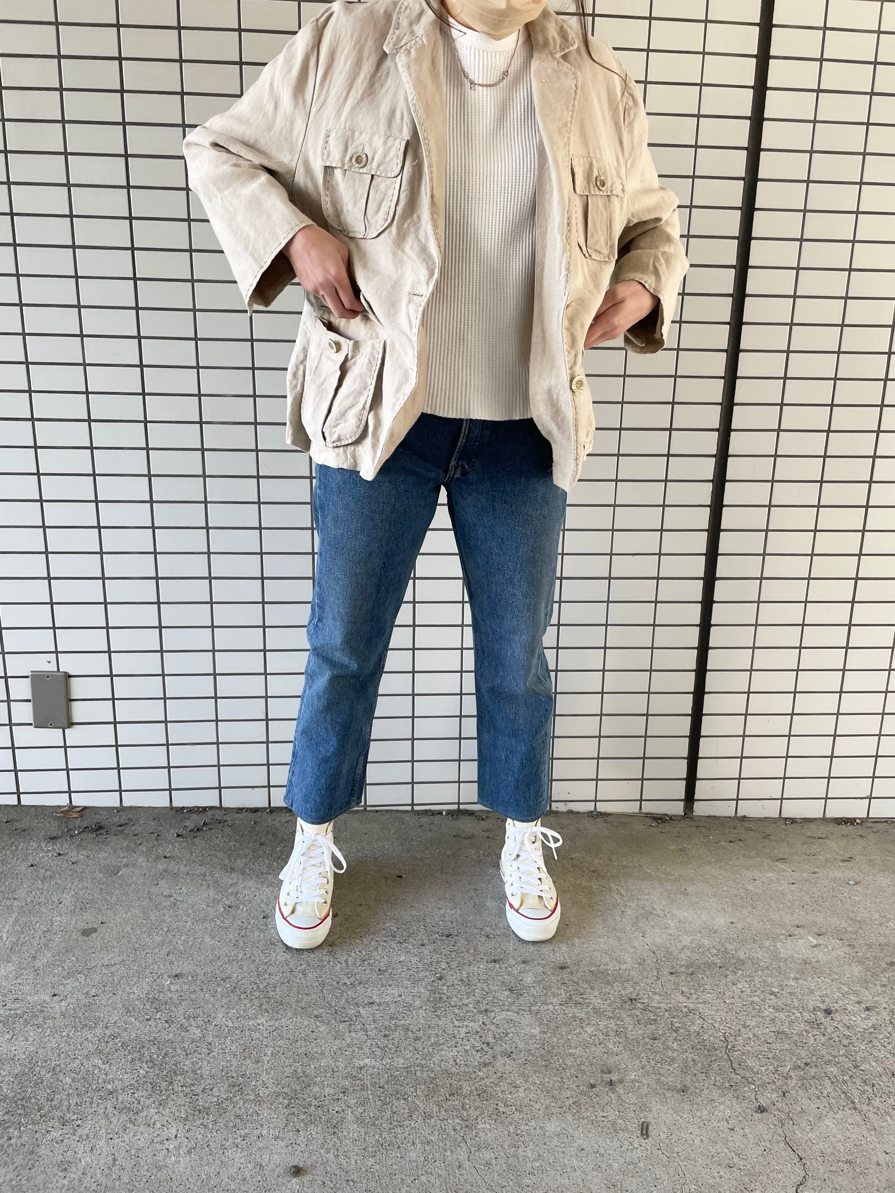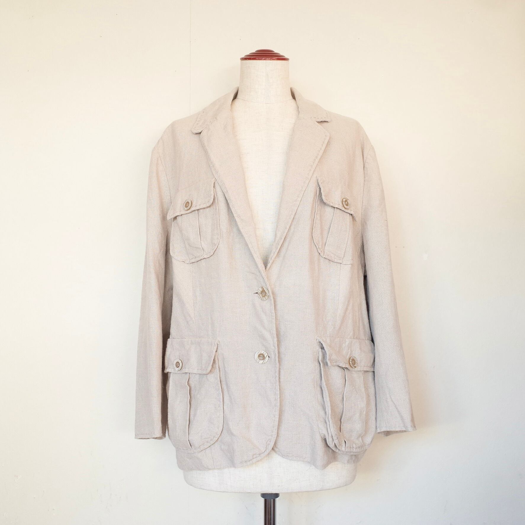 柔らかいリネン素材のサファリジャケット。ゆとりのある少しオーバーサイズなシルエットです。ステッチが施されているのもポイントです。カジュアルにデニムはもちろんのこと、ワンピースやロングスカートにも◎さらっと雑に羽織っても可愛いジャケットです。