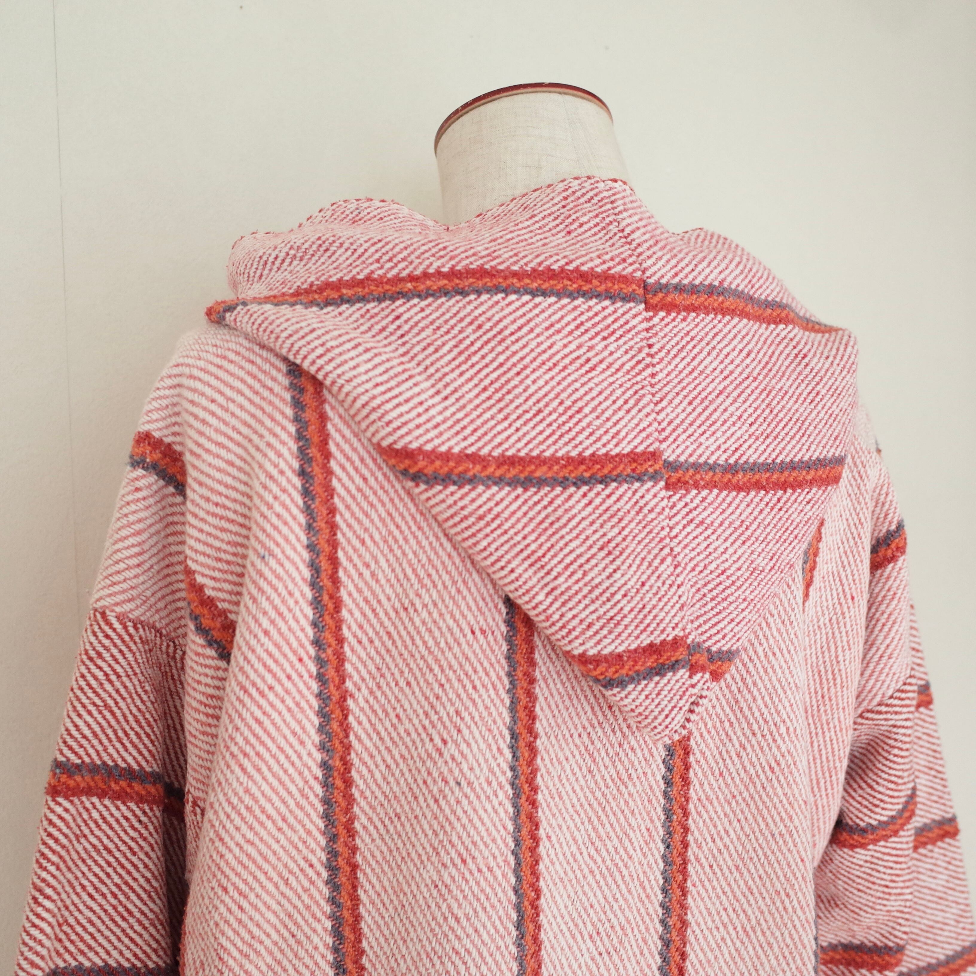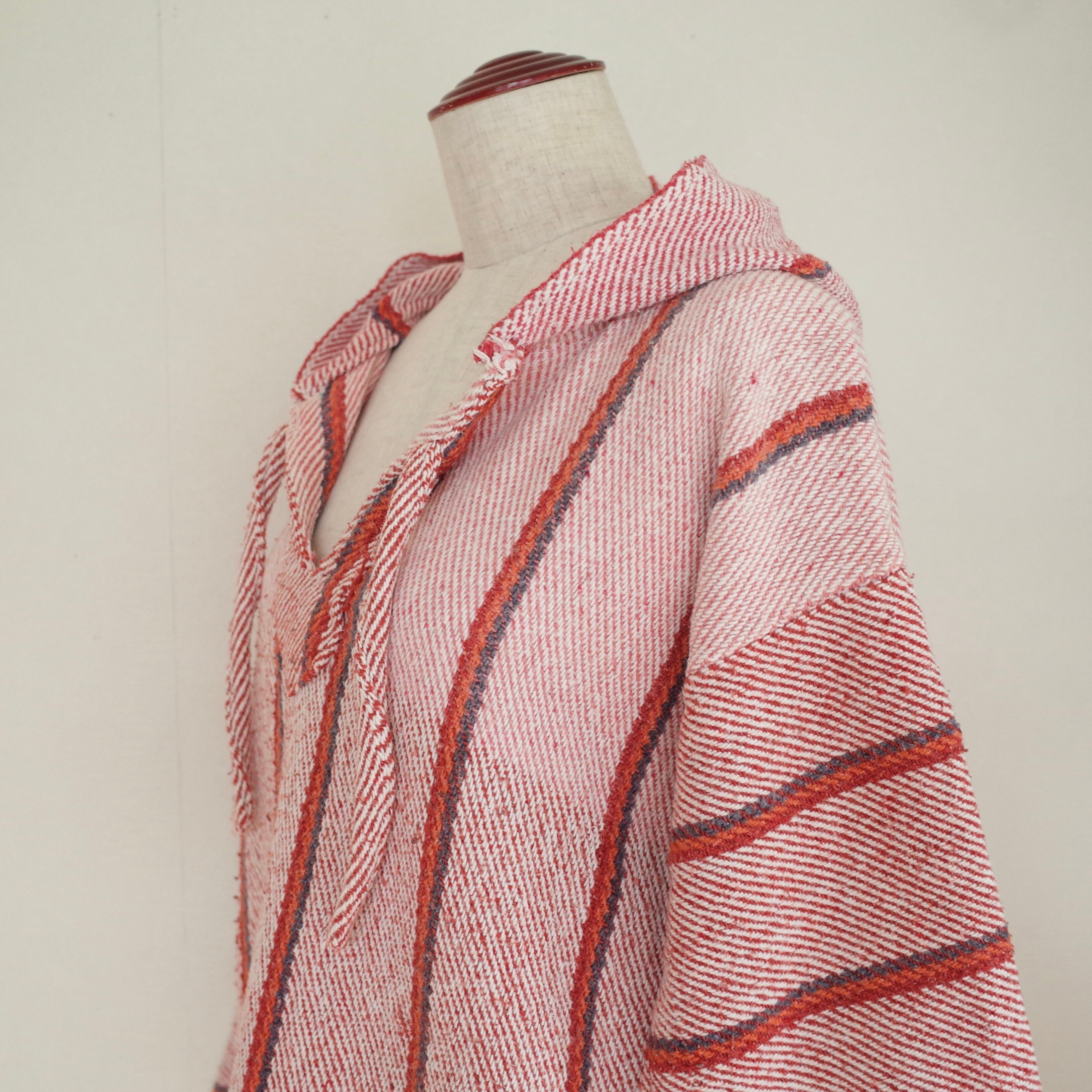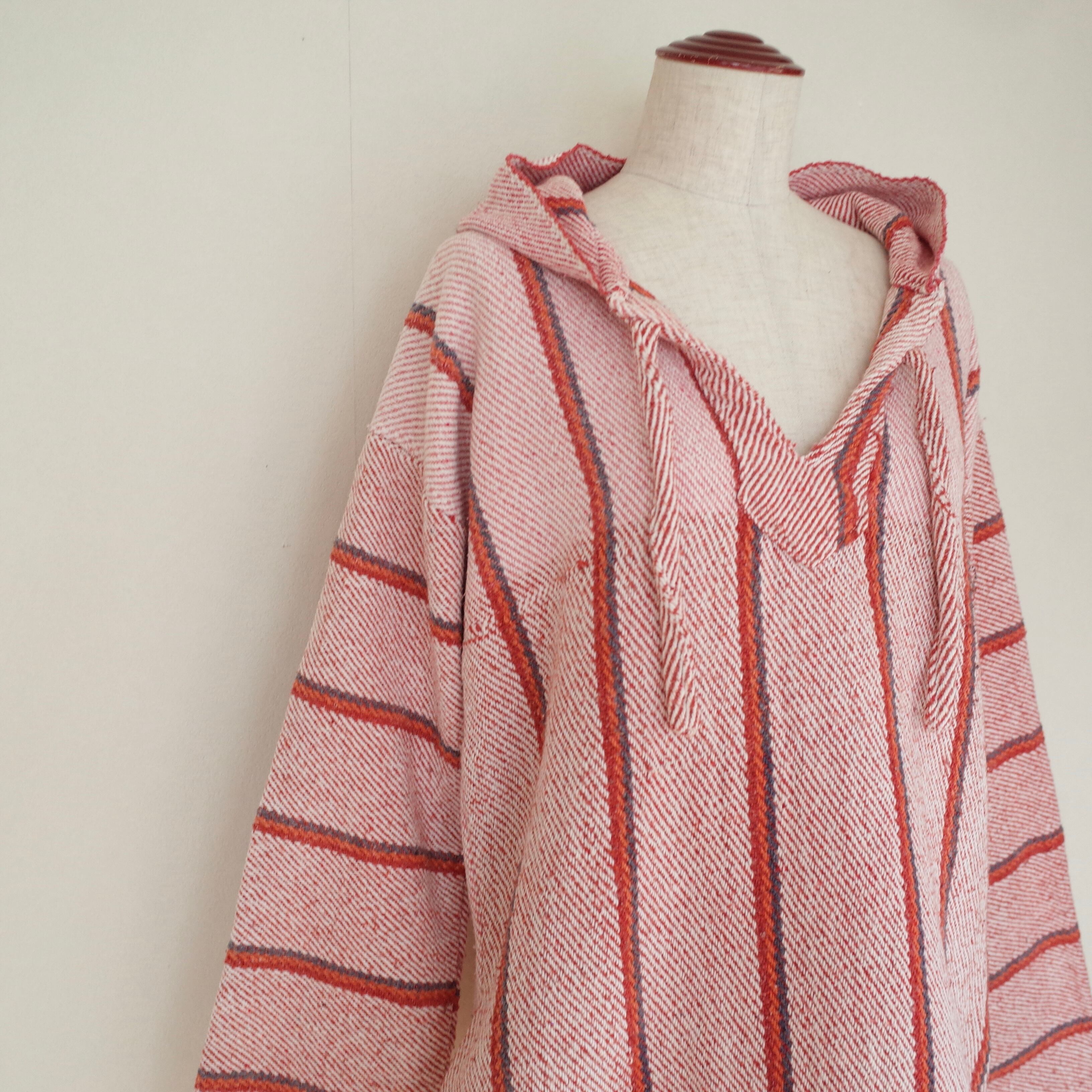 ヒッピー&サーフのアイコン、メキシカンパーカー。最近ではストリートブランドやハイブランドからも出ています。シャツをインしたり、ジャケットのインナーに仕込めば、程よい抜け感の演出も。こちらはコットン100%の赤いストライプのメキパです。袖が長いのでロールアップしても◎