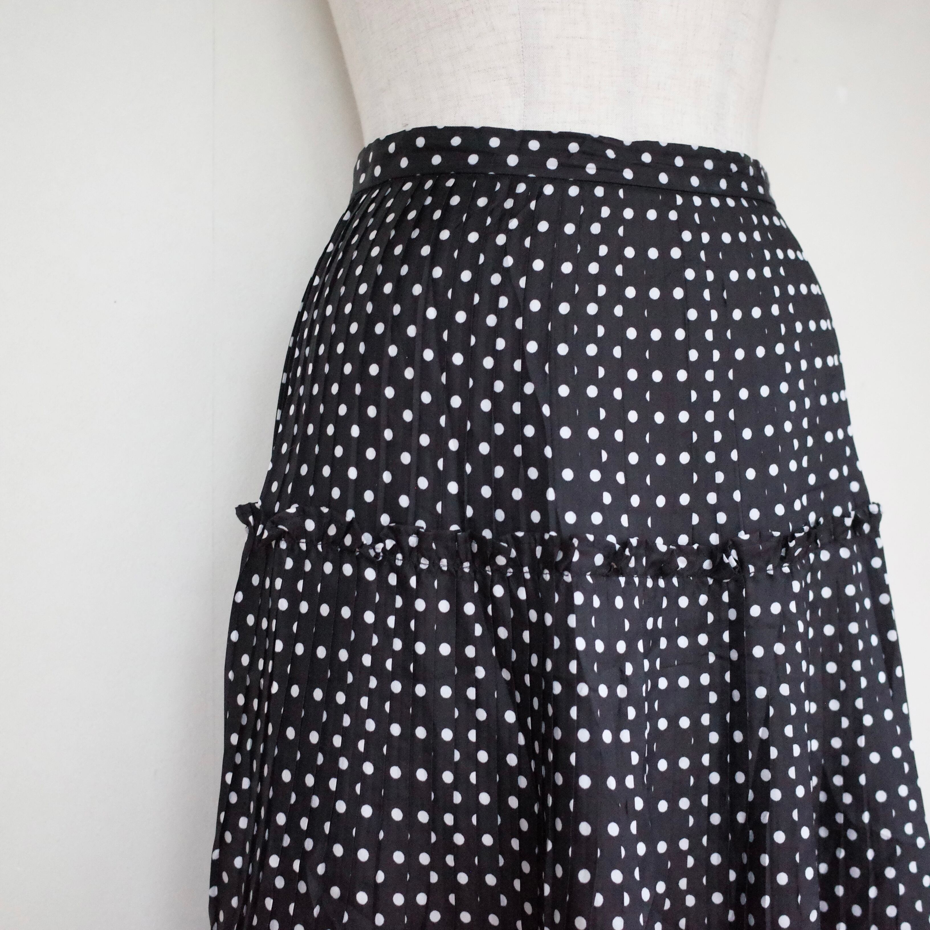 ドイツ製のティアードロングスカートです。ブラックベースにホワイトドットの少し光沢とハリ感があるトリアセテート素材。ティアードですが甘過ぎないディテールです。ヴィンテージのTシャツとも相性がいいので、これからの季節に活躍してくれるスカートです。裏地は付いていませんが、透けません。