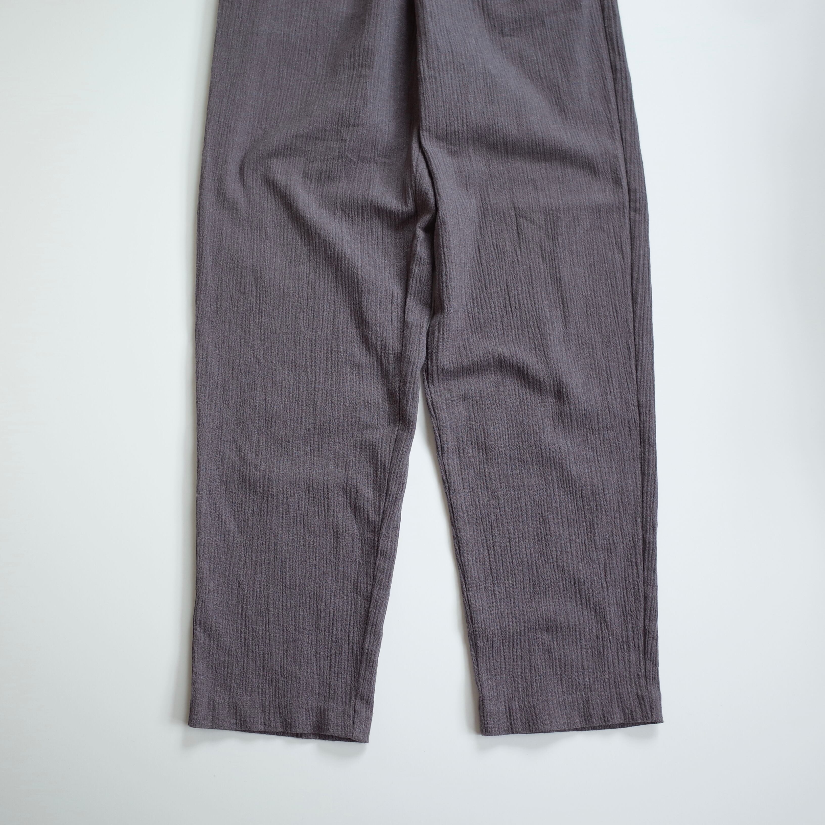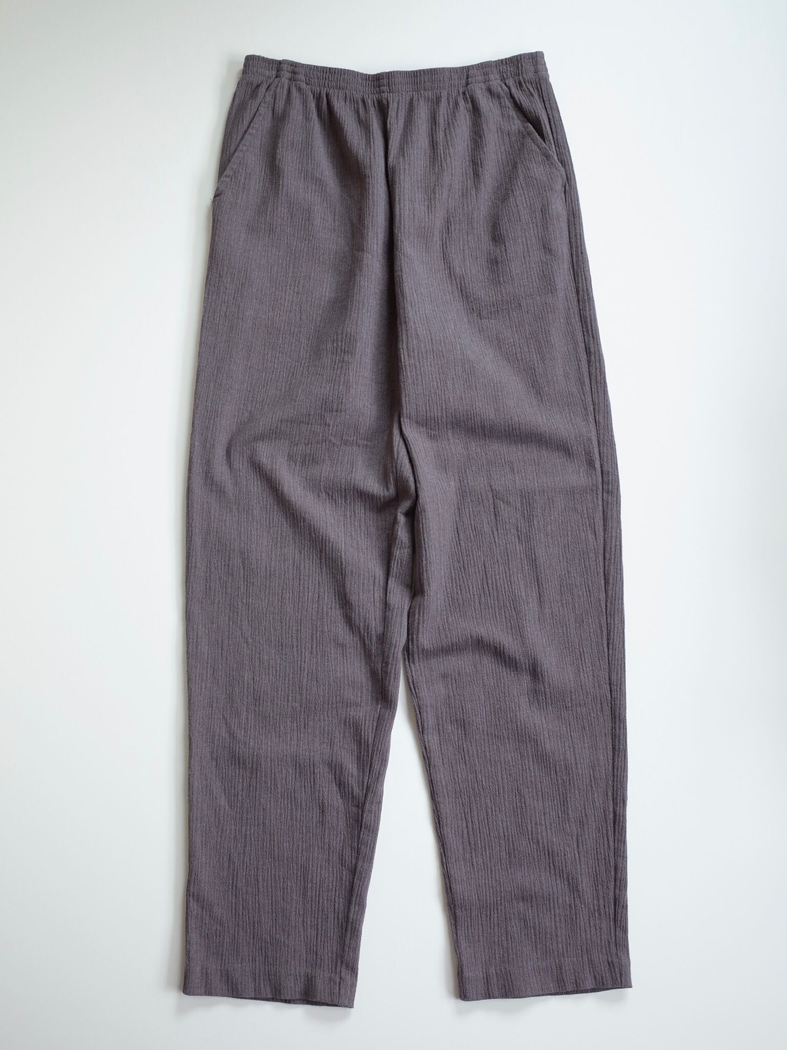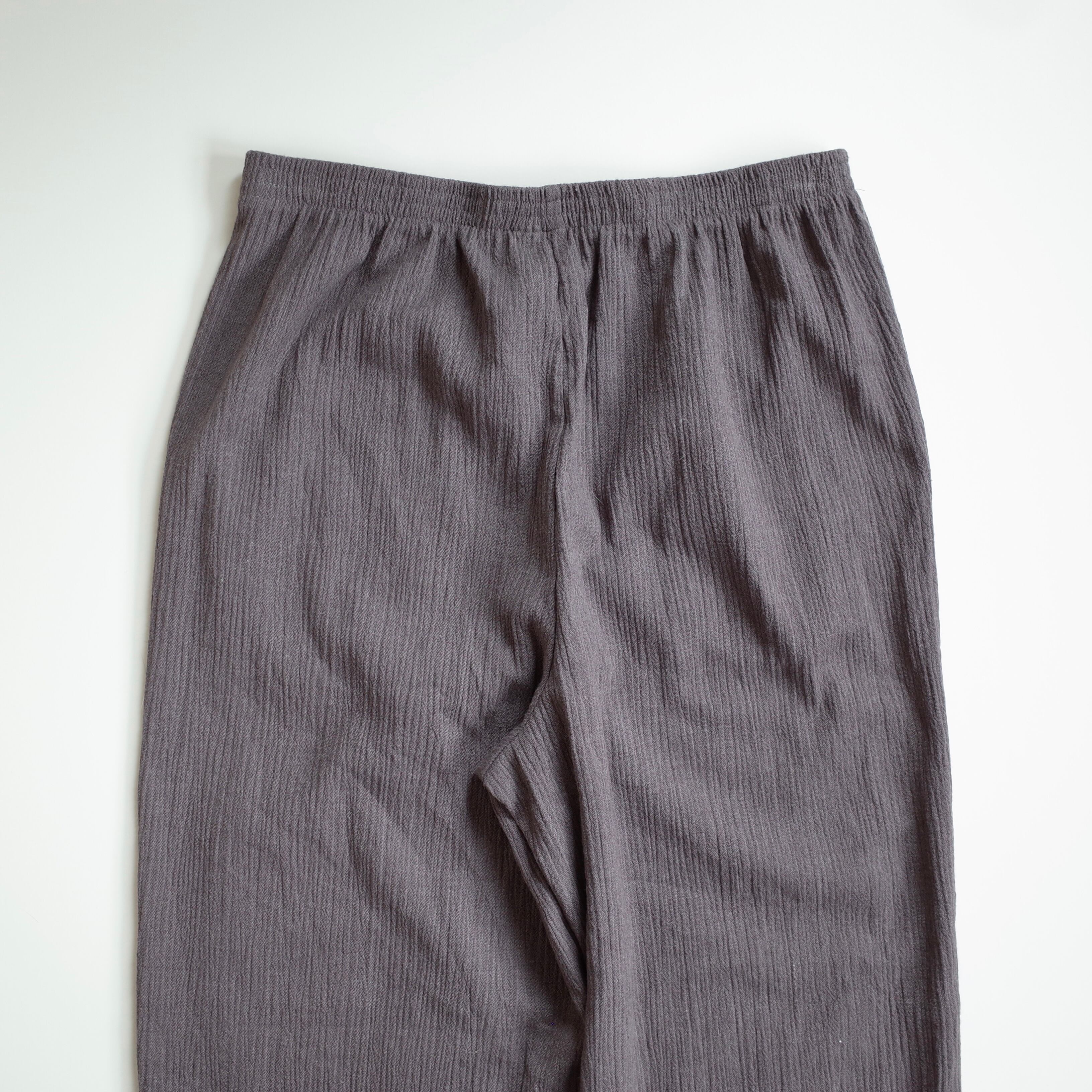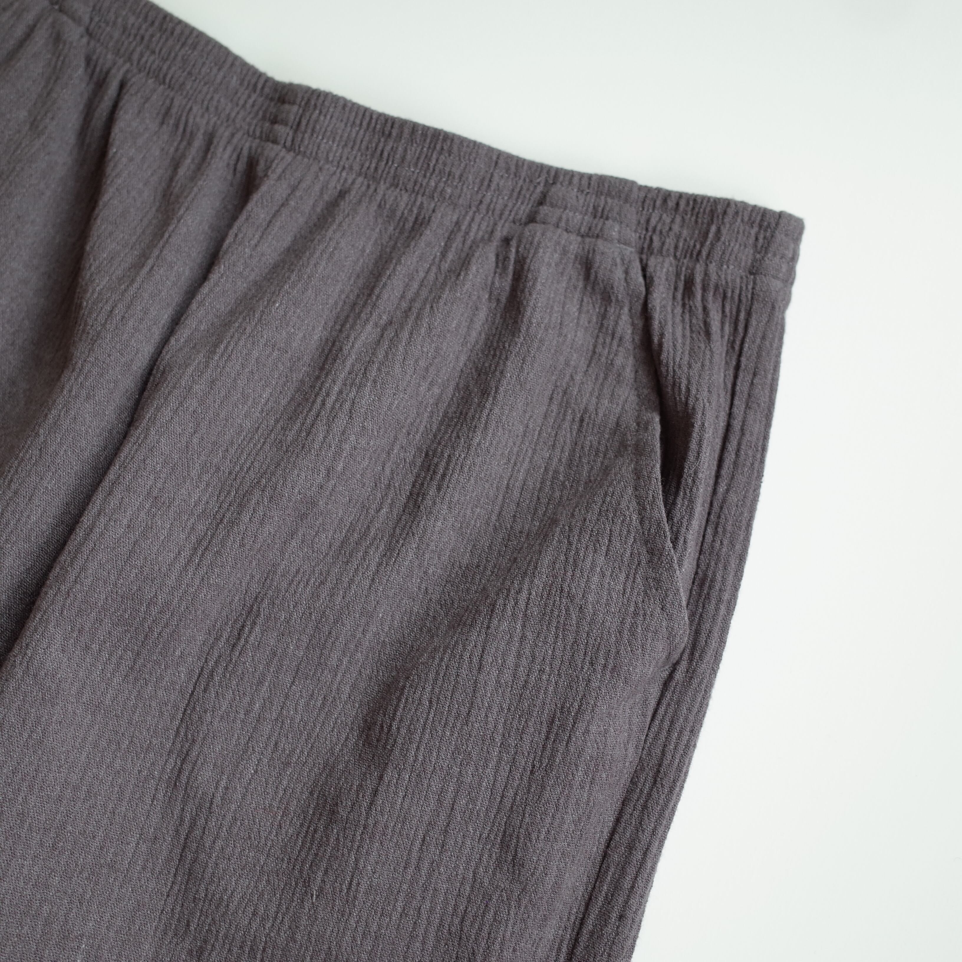濃いめのグレーカラーがシックなイージーパンツ。ザラっとして通気性のいい生地感が涼しげな一枚です。ウエストはゴムで楽ちんな履き心地の為、お家でのリラックスウェアとしても◎コーディネート次第では綺麗目にも着用頂ける万能なパンツです。