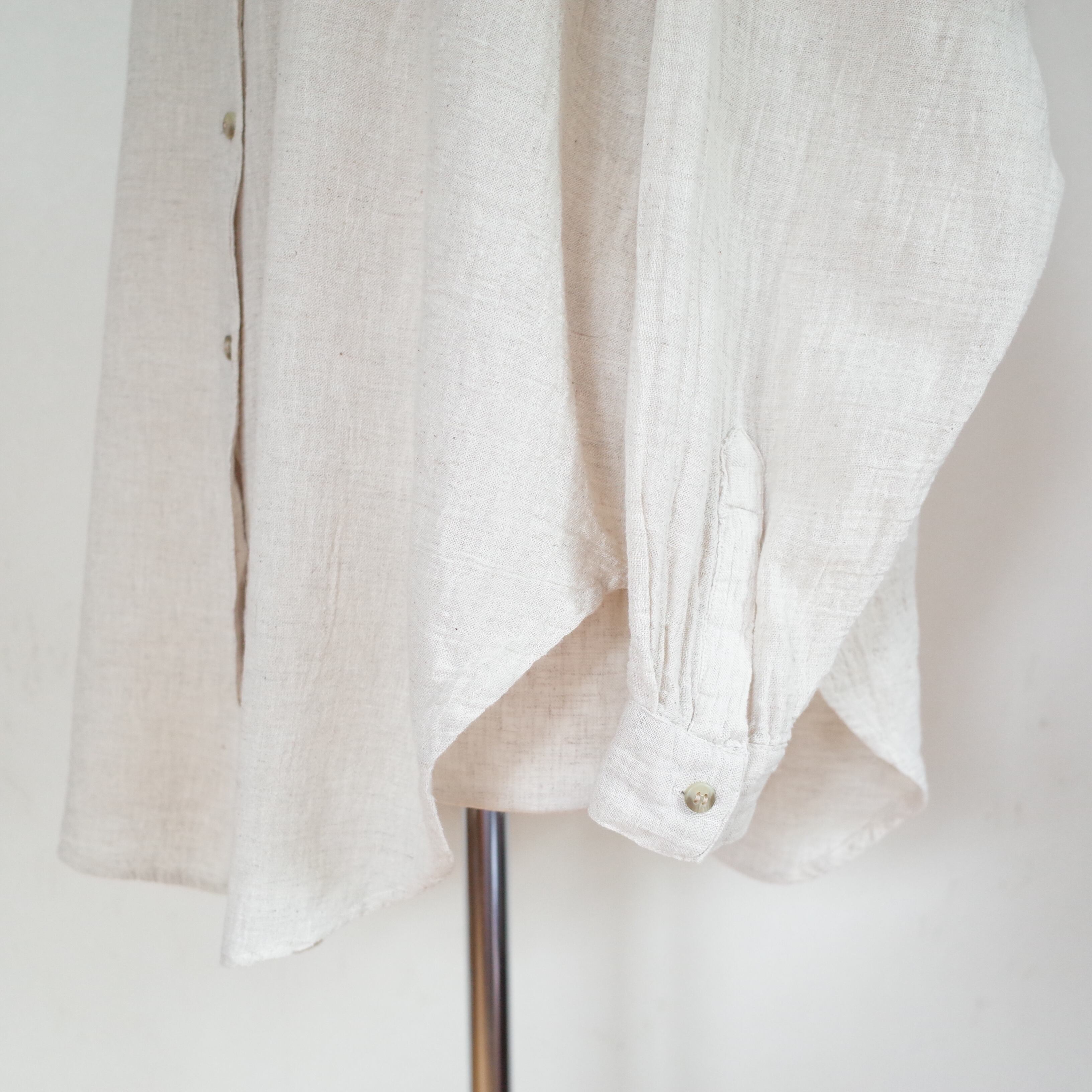 コットンリネン素材のシャツ。シアー感があり、オーバーサイズシルエットで涼しげな一枚です。