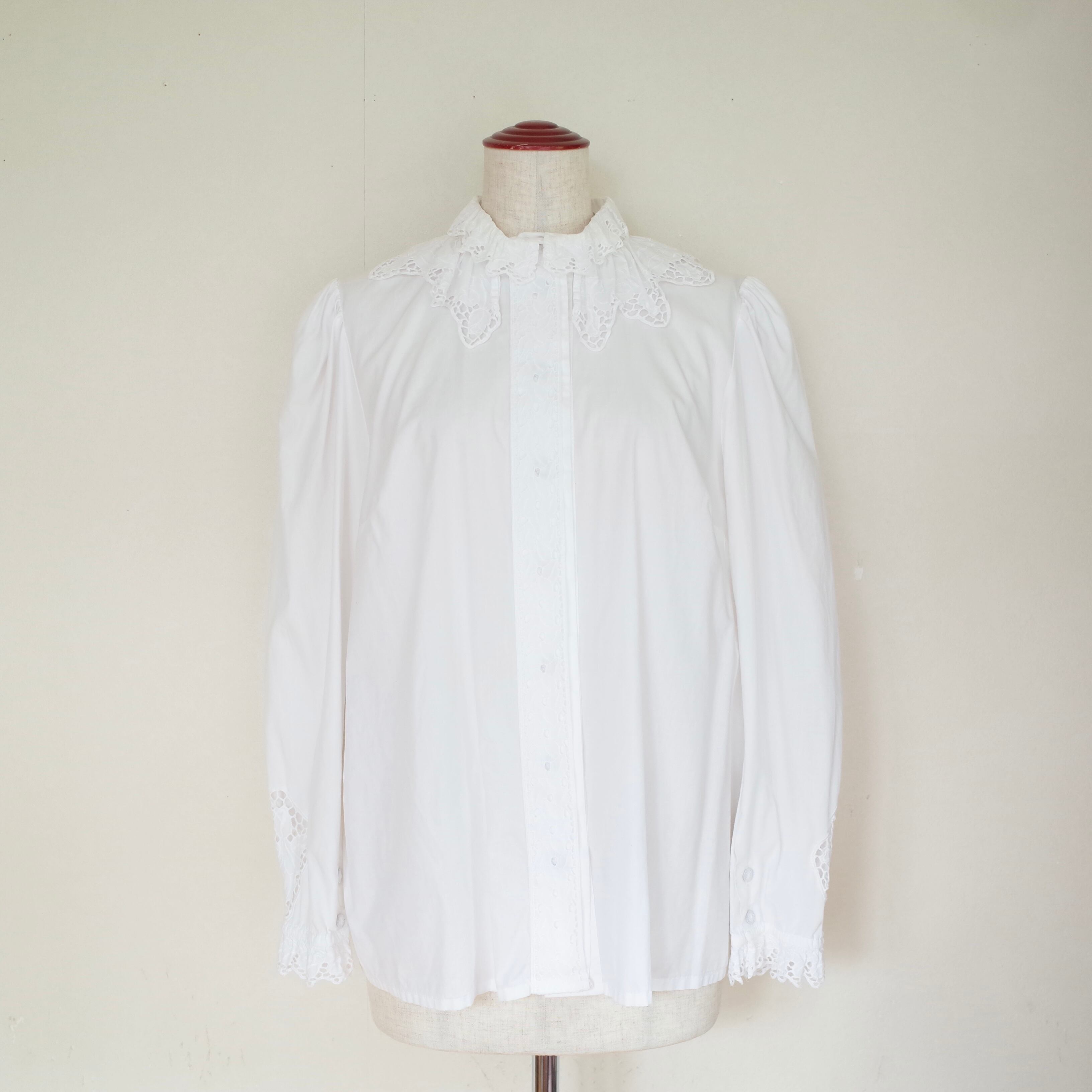 二重になったレースの襟がかわいいブラウス。袖のタックや糸で装飾されたボタンなど、細かいディテールも手の込んだ作りになっています。手首のレースで透けるデザインもgood!!カットソーやスウェットとレイヤーしたり、冬はニットと合わせても◎