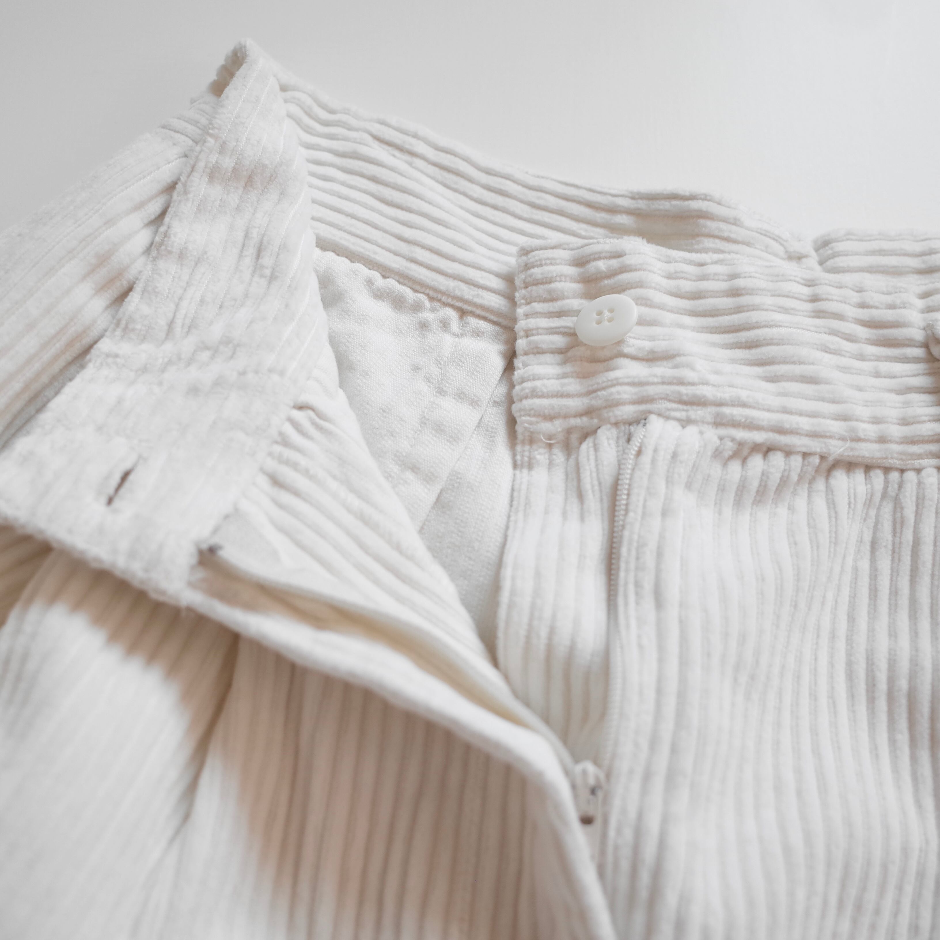 太畝コーデュロイのショートパンツ。ハイウエストで、キュロットのようなカタチがgood!使いやすいホワイトカラーも◎夏はTシャツにサンダルでラフに可愛いパンツです。