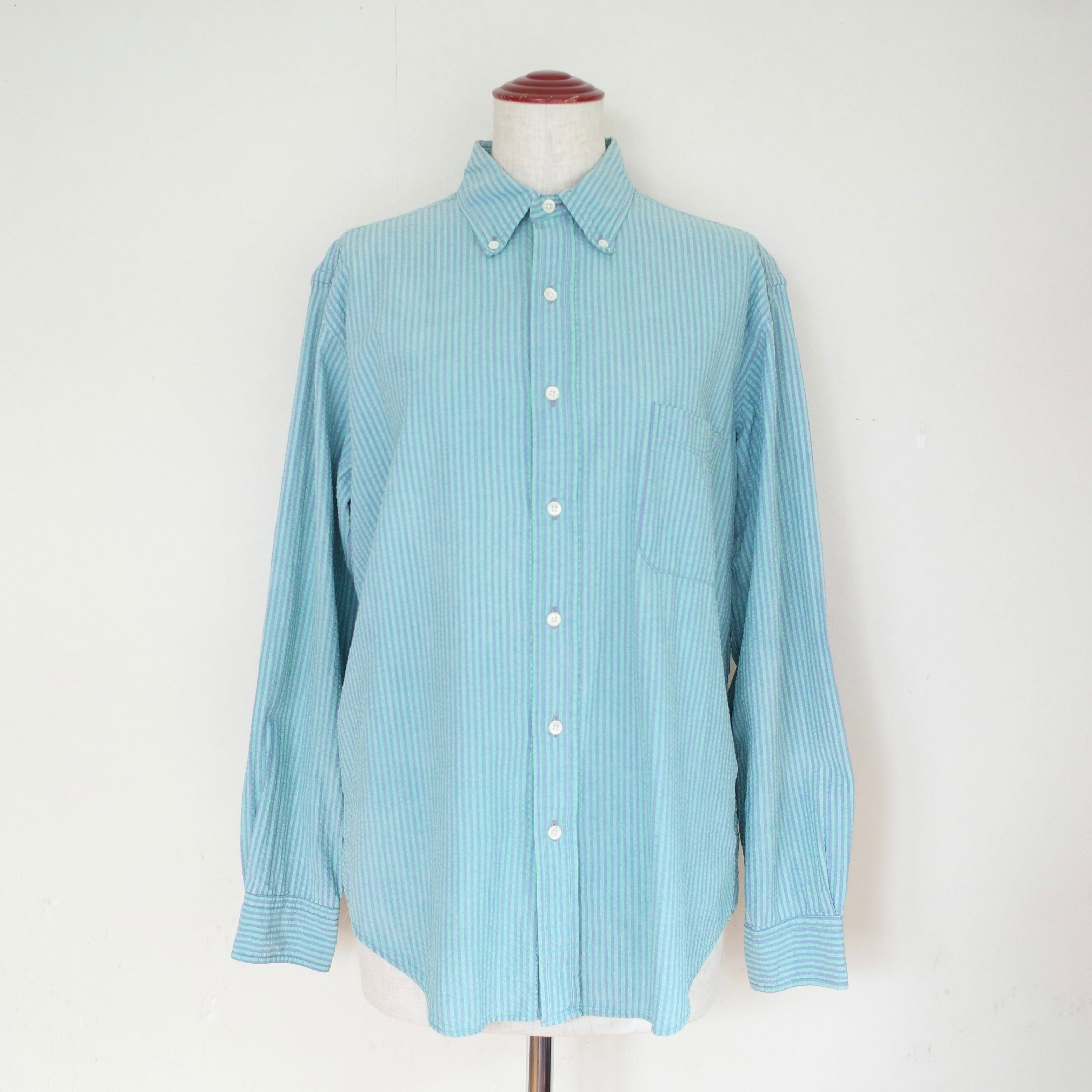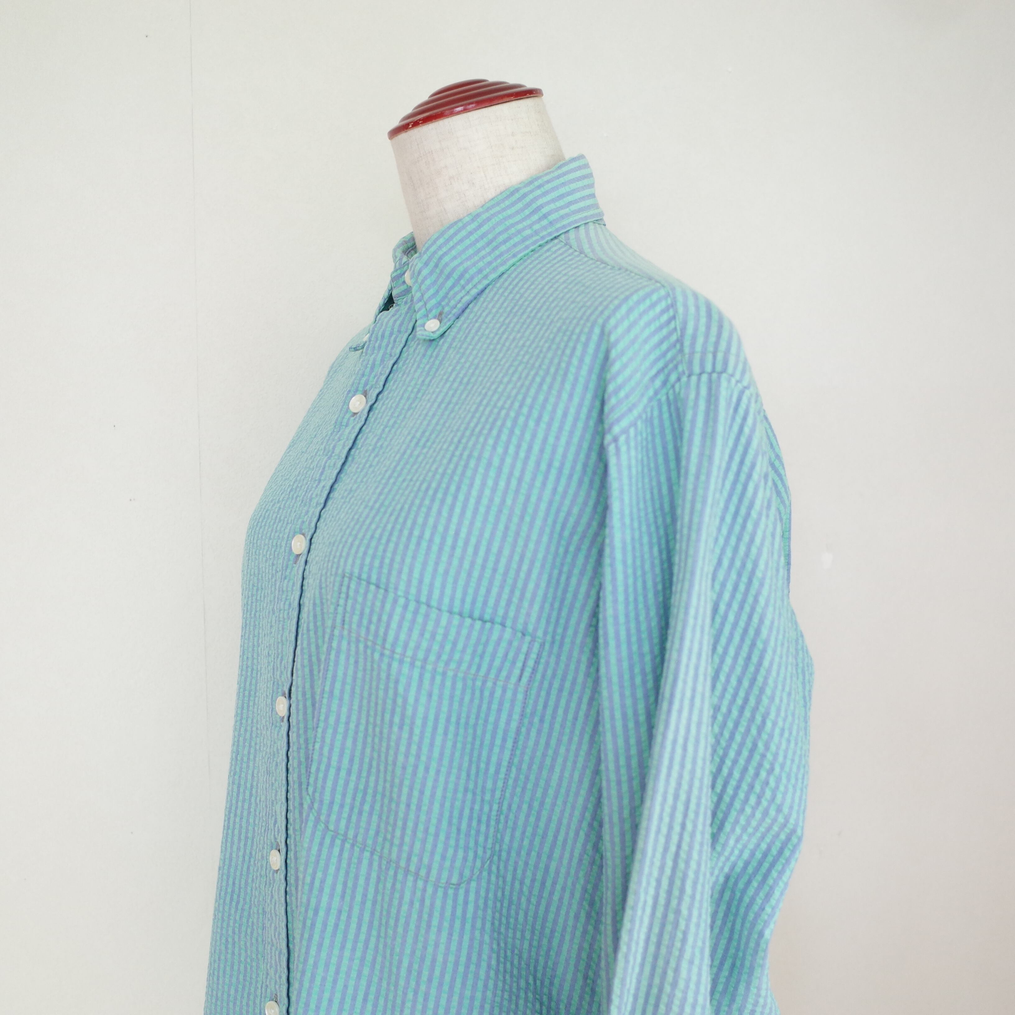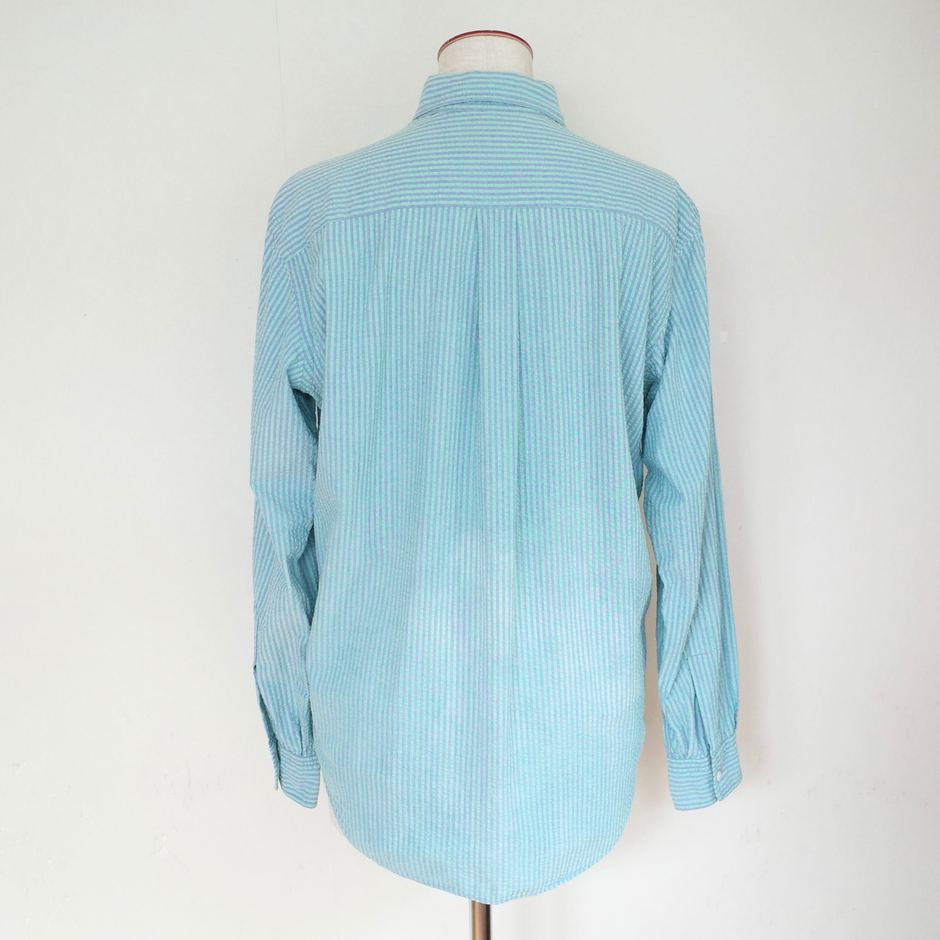 アメリカ製L.L.Beanの爽やかな配色のストライプシャツ。シアサッカー生地の凹凸あるラフな素材感で、通気性も良く、アイロンいらずの洗いざらしOKな一枚です。気軽に羽織れて、涼しく使いやすいシャツ。ユニセックスで着用可能なサイズ感です。