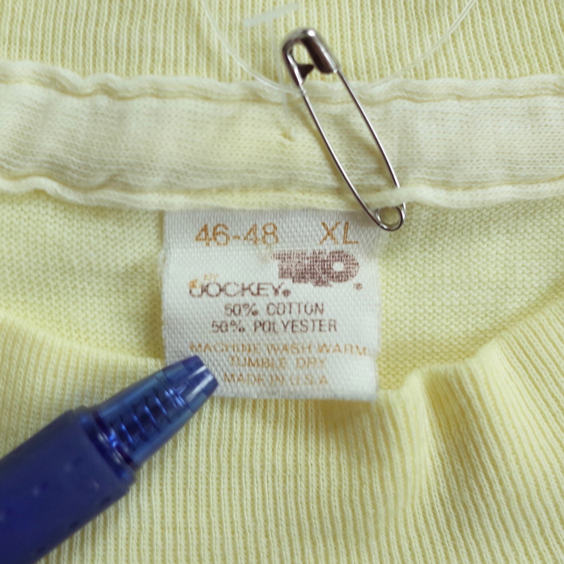 80年代アメリカ製ボディはJOCKEYのプリントTシャツ。ライトイエローのボディに、ブラウンとオレンジの良い配色のプリントです。着込まれてくたっとした生地感も雰囲気あります。