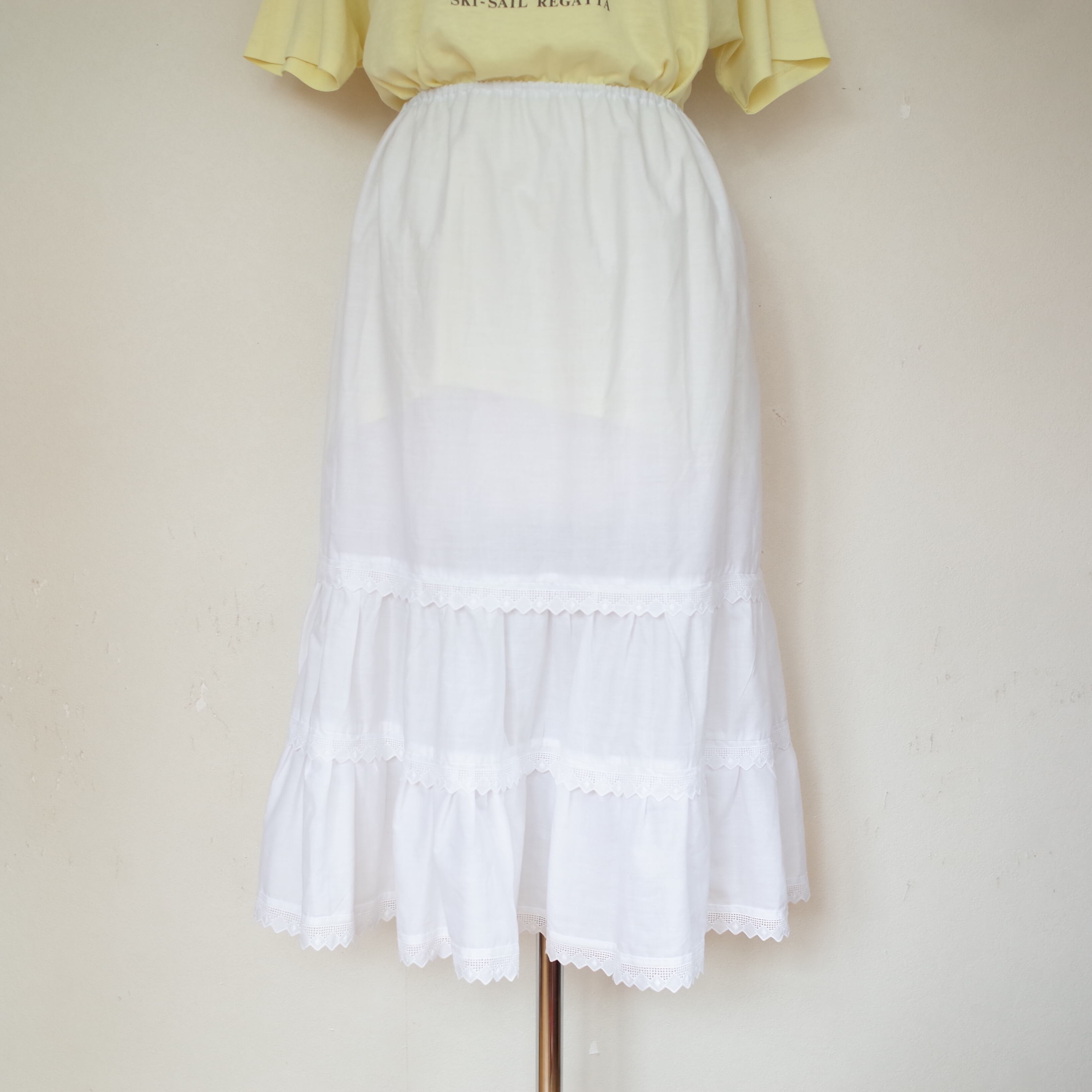 ヨーロッパ古着のミモレ丈ティアードスカート。切り替えにレースが付いています。本来はペチコートとして履かれていたスカートですが、薄手のペチコートを下に穿いてスカートとしての着用も◎前開きのスカートやワンピースの下にレイヤードしたスタイルやデニムの上に履いても goodです。寒くなったら、スウェットやニットとコーディネートしてもかわいい一枚。
