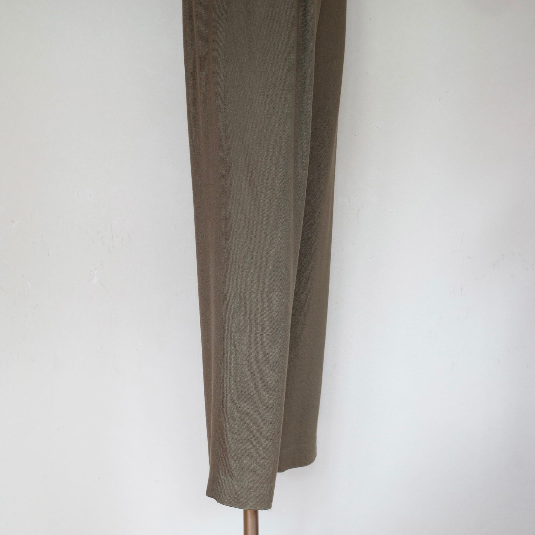 Liz claiborneのスラックス。テーパードのレングスに、タックの入った腰回りのシルエットが体型カバーもしてくれる形の良い一本。リネンのような風合いのレーヨンならではのとろんとした生地感です。裏地付き。シンプルにTシャツと合わせるだけで、程よい抜け感のあるコーディネートに。秋はニットやジャケットと。