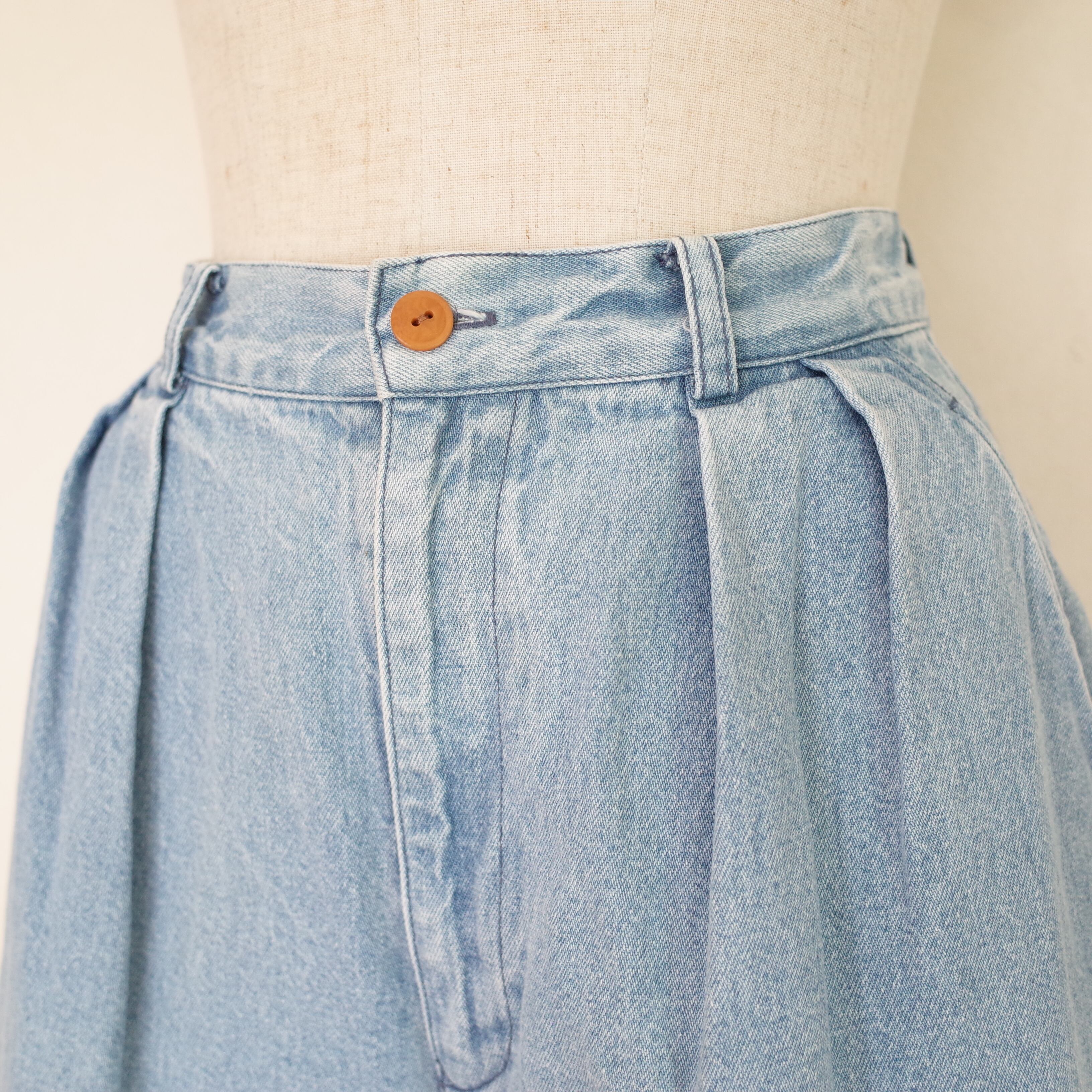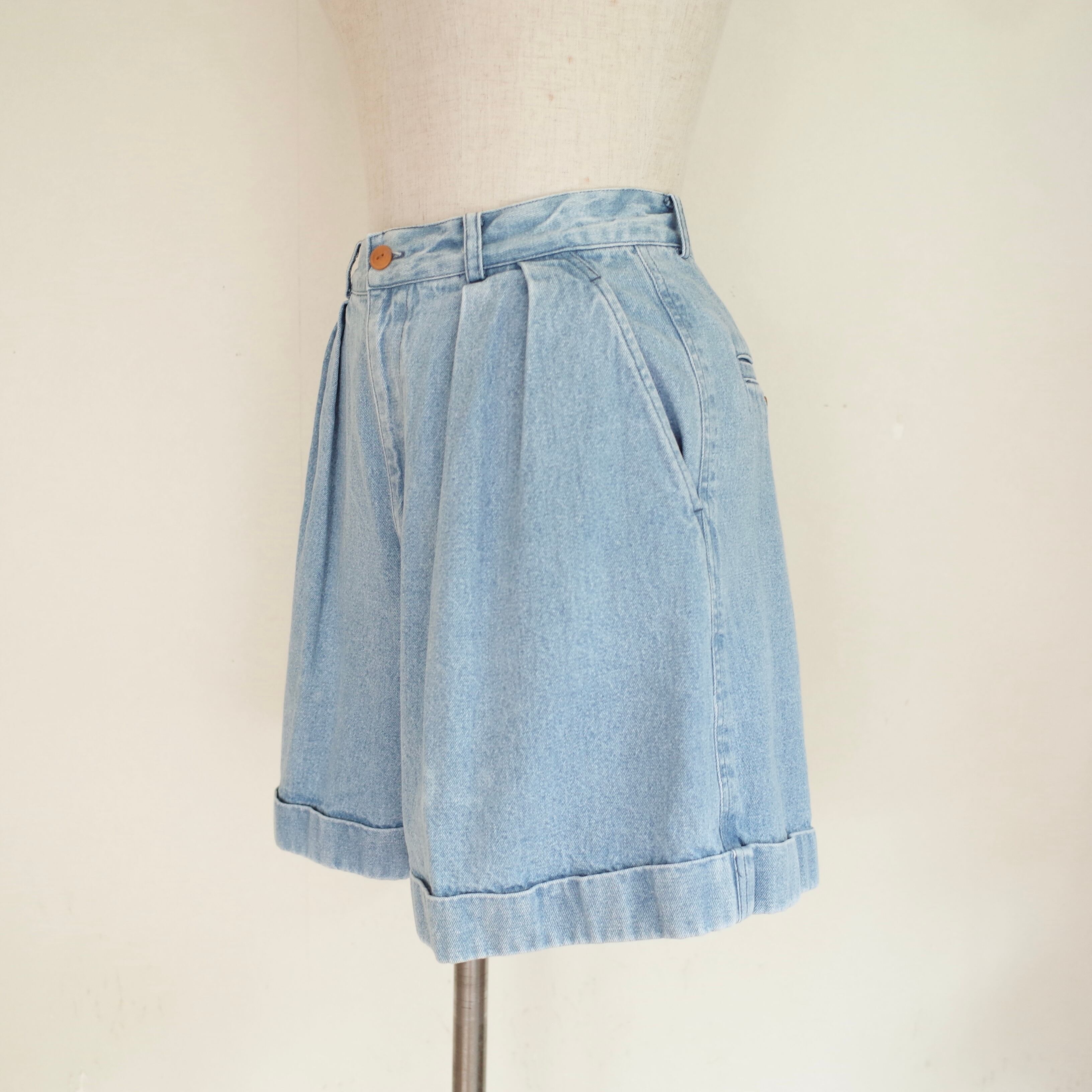 80〜90年代製RALPH LAUREN COUNTRYのデニムショートパンツ。RRLの前身ラインとも言われ、1988年に誕生し1990年には幕を閉じた、たった3年だけの幻のライン「COUNTRY」。股上が深く、裾はダブルになっていて、脚を綺麗に見せてくれる広がったシルエットです。いい具合に色落ちしたライトブルーのカラー。この夏、Tシャツや半袖シャツと合わせたいショートパンツです。