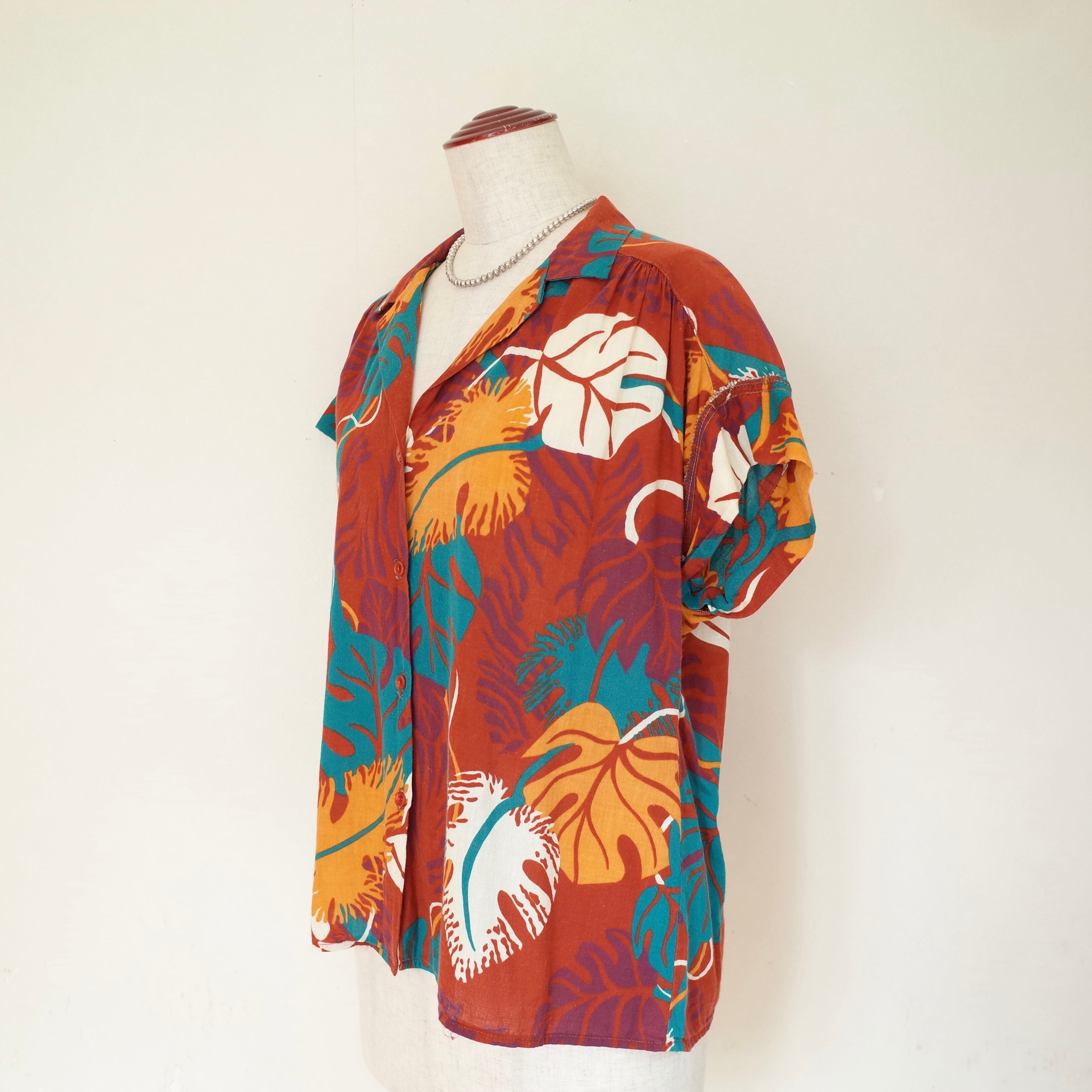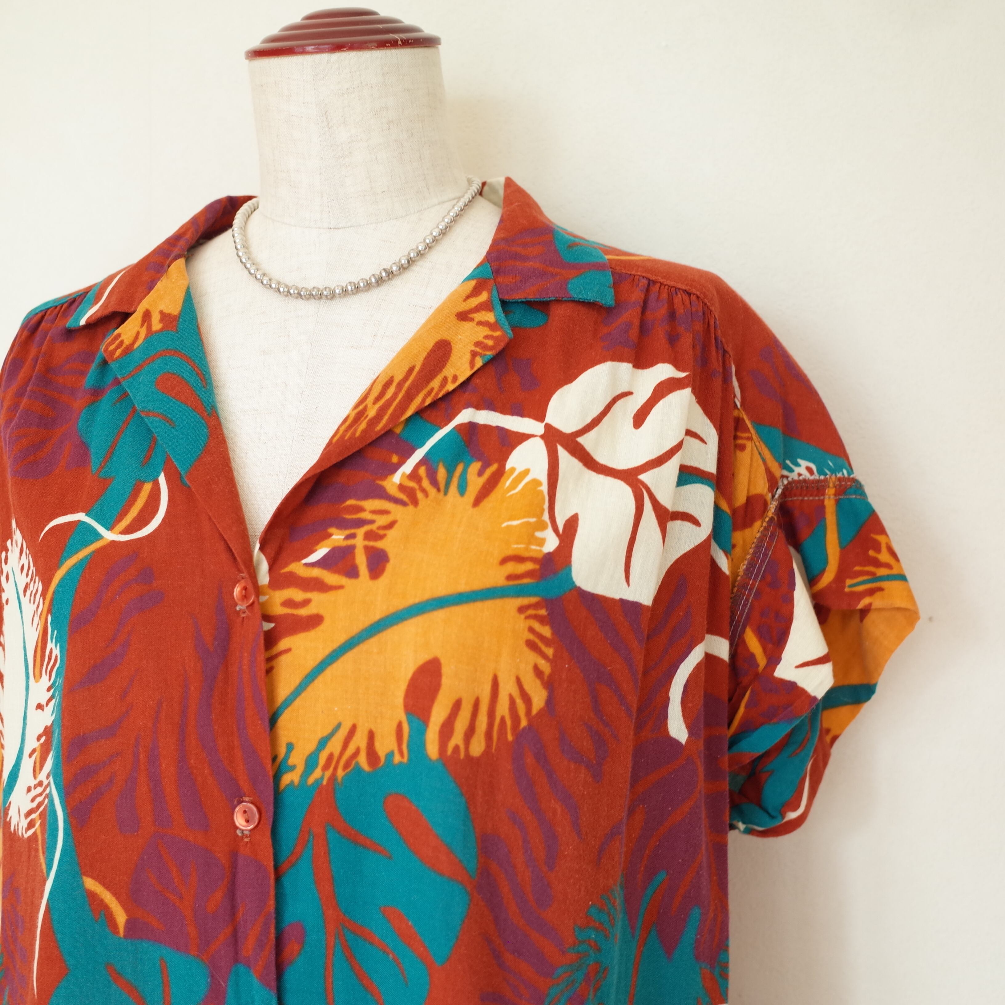 ボタニカルプリントの開襟シャツ。肩にギャザーが入っていて、ふんわりとしたゆるいシルエット。袖口がロールアップして縫われているので、短めです。前をあけてタンクトップやキャミソールの上に羽織っても◎塩梅の良い配色で、コーディネートにも取り入れやすい柄のシャツです。