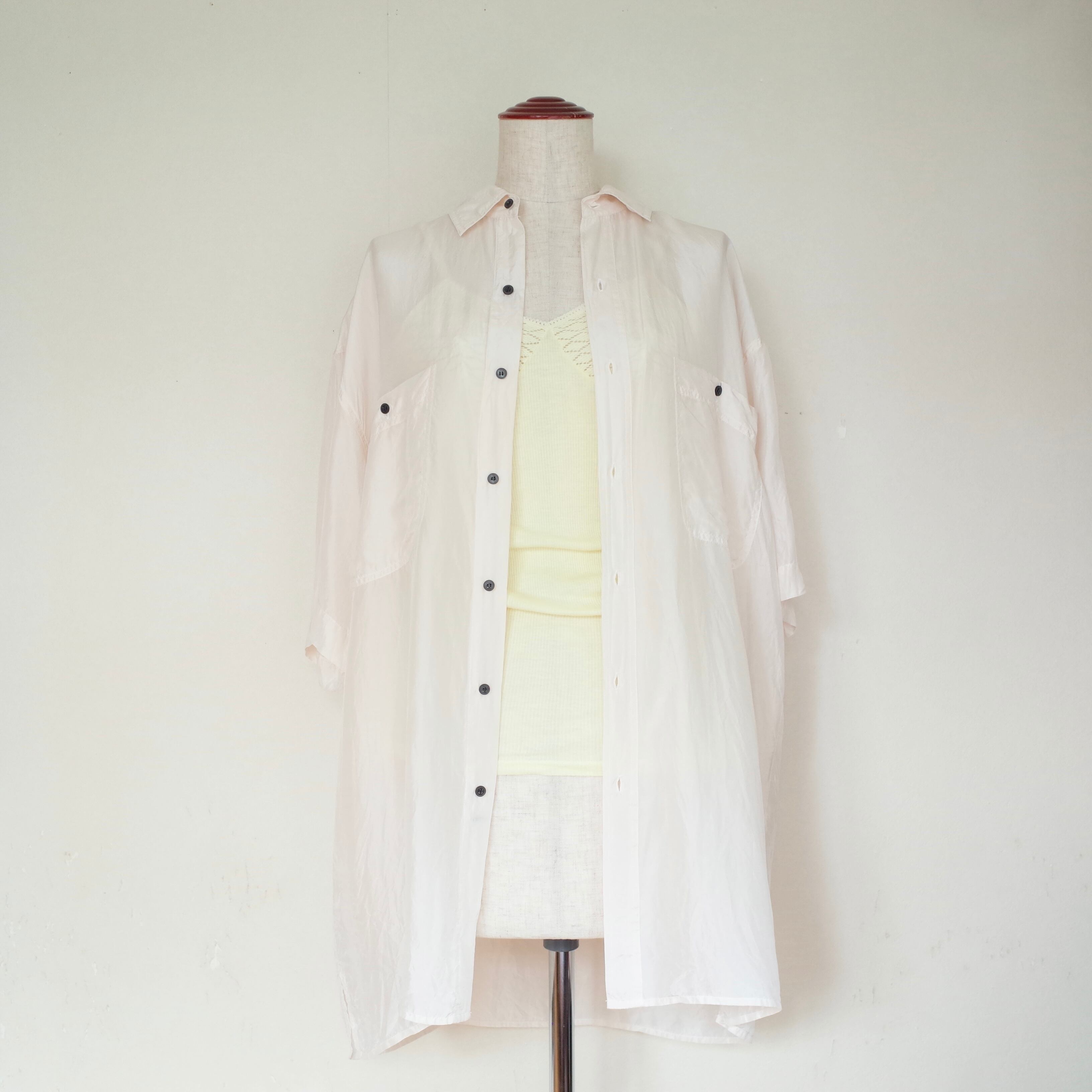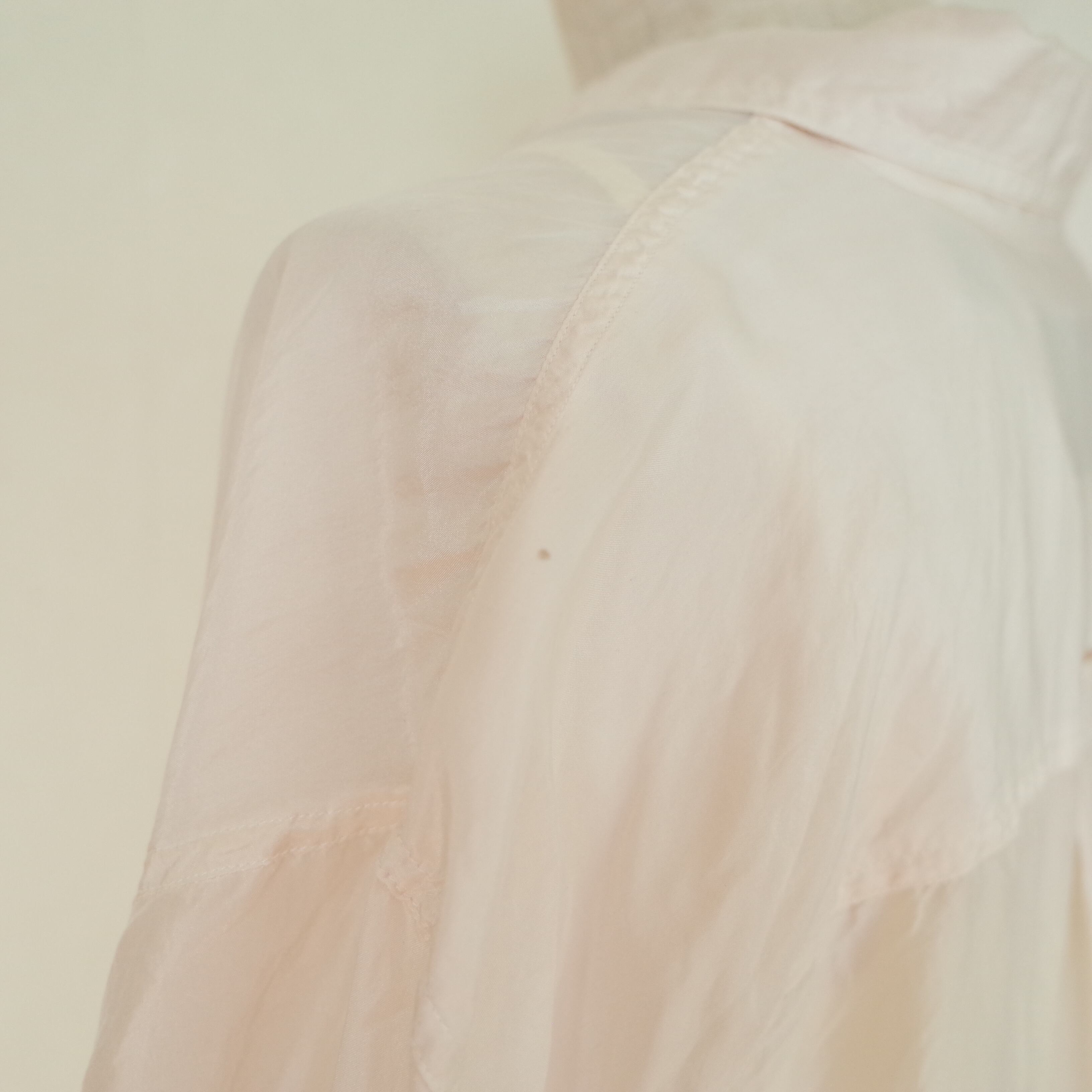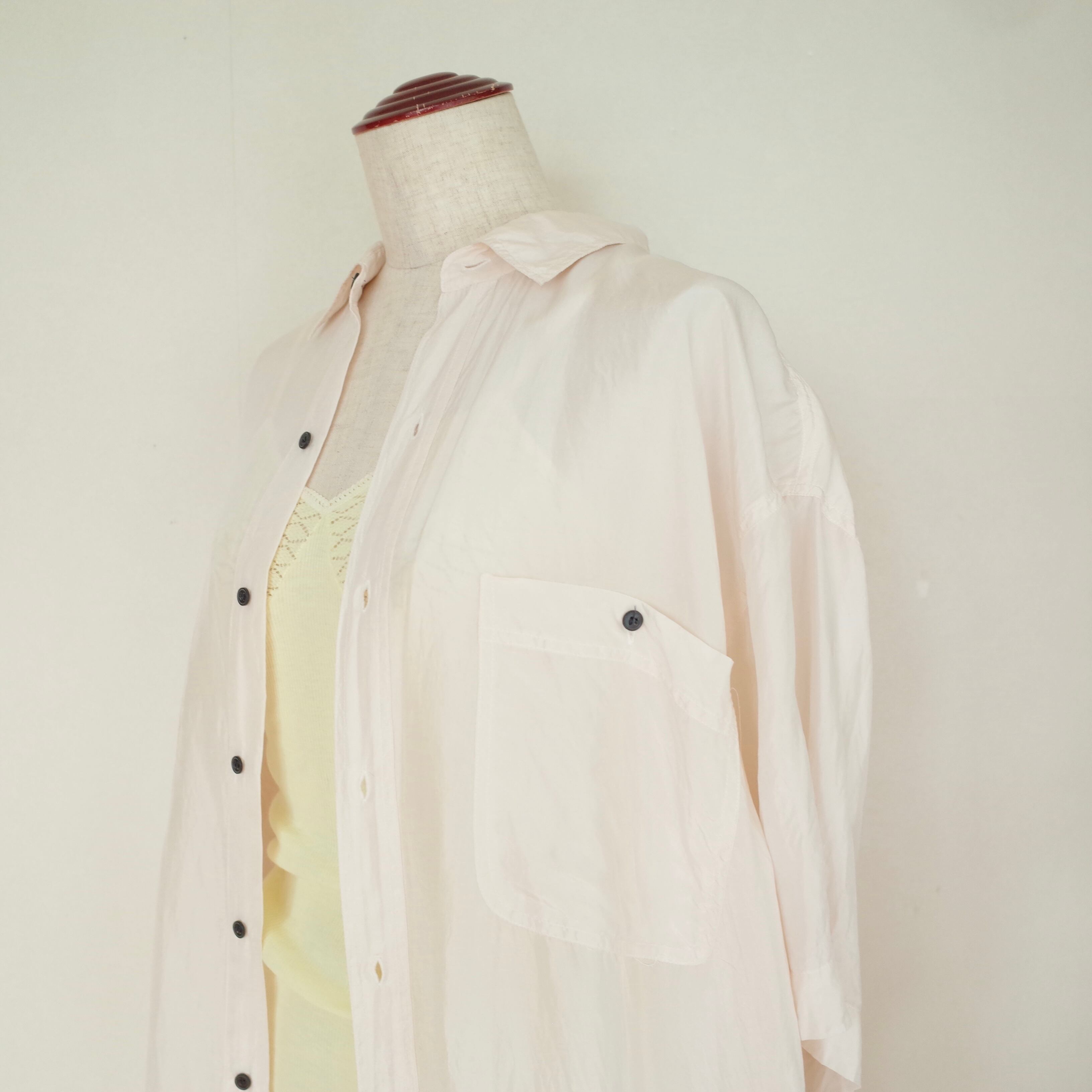 オーバーサイズのシルクシャツ。大きめサイズでユニセックスで着用頂けます。上質なシルク100%の滑らかな肌触りと程よいルーズ感のバランスが絶妙なシルクシャツ。こちらは少しピンクがかったホワイトで、ボタンがブラックになった一枚。着こなしの幅が広く、薄くて軽いので羽織としても◎自宅で手洗いできるのもおすすめポイントです。