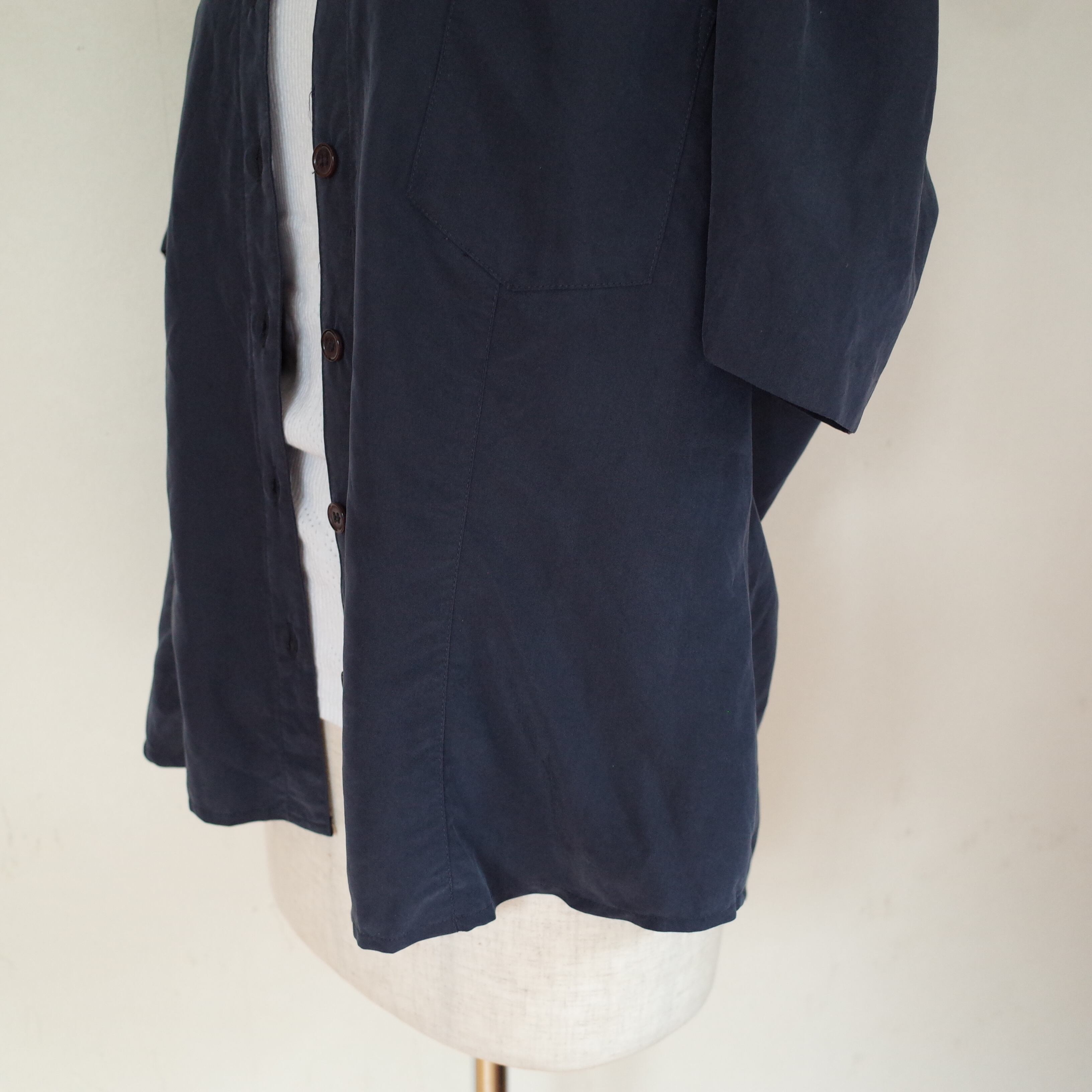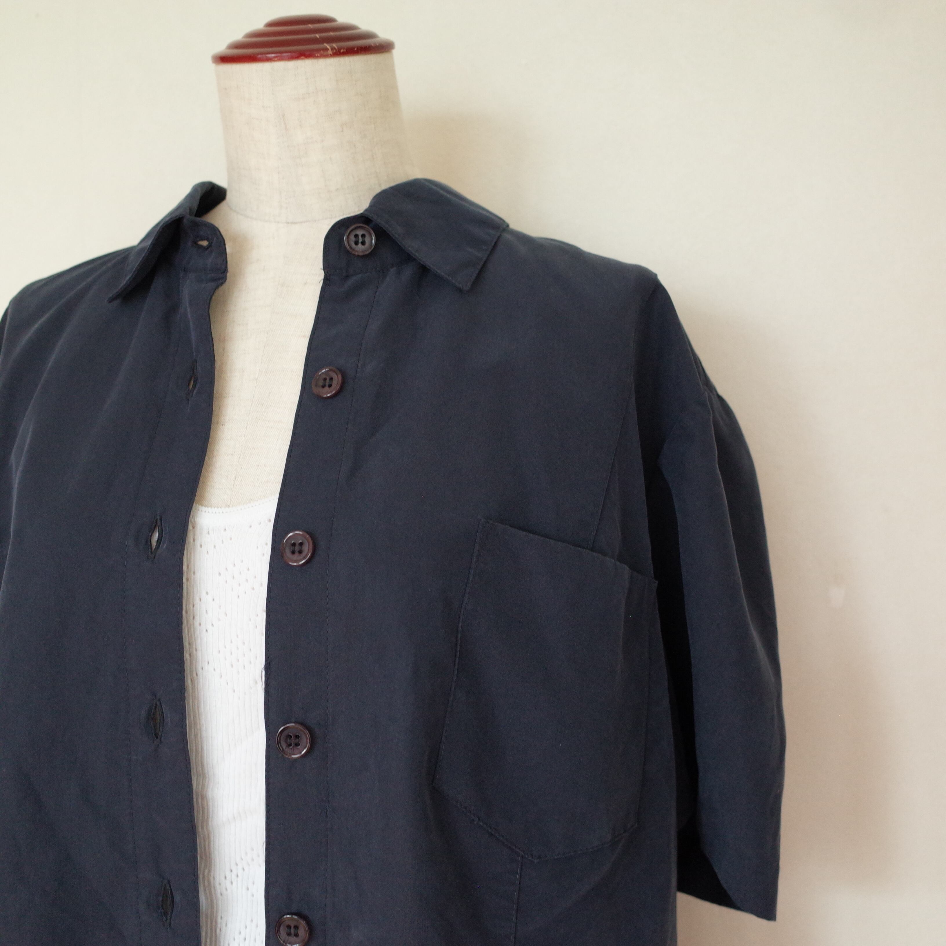 レーヨンのしっかりめな生地感で、滑らかな肌触りと程よいルーズ感のバランスが絶妙な一枚。少しウエストがシェイプされ、パーツが多く立体感のあるシルエットになっています。