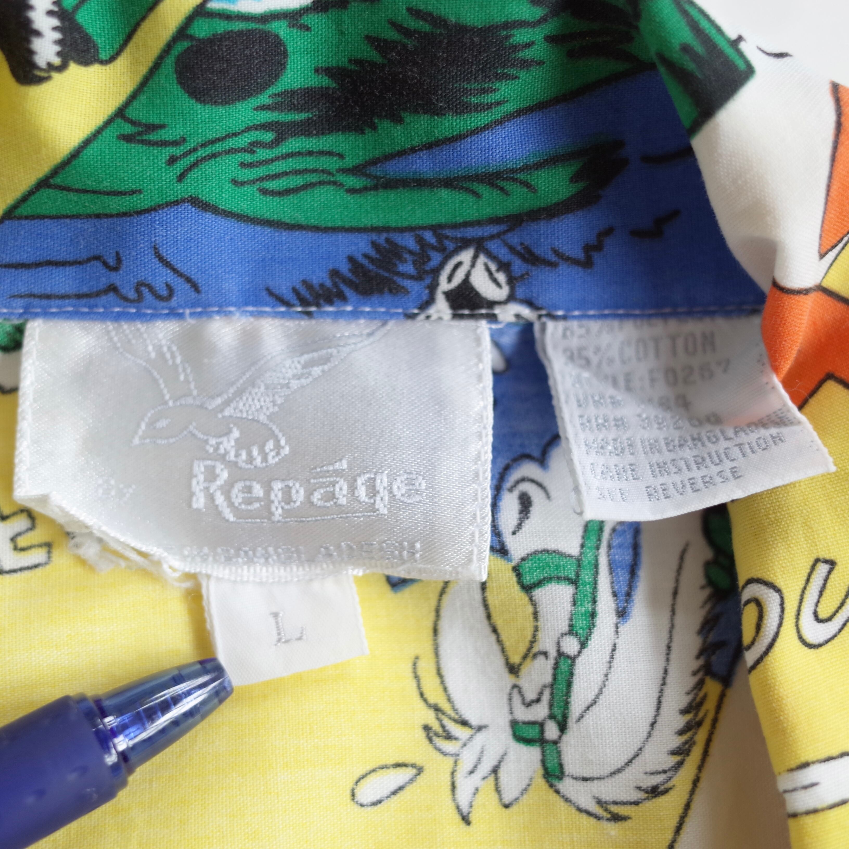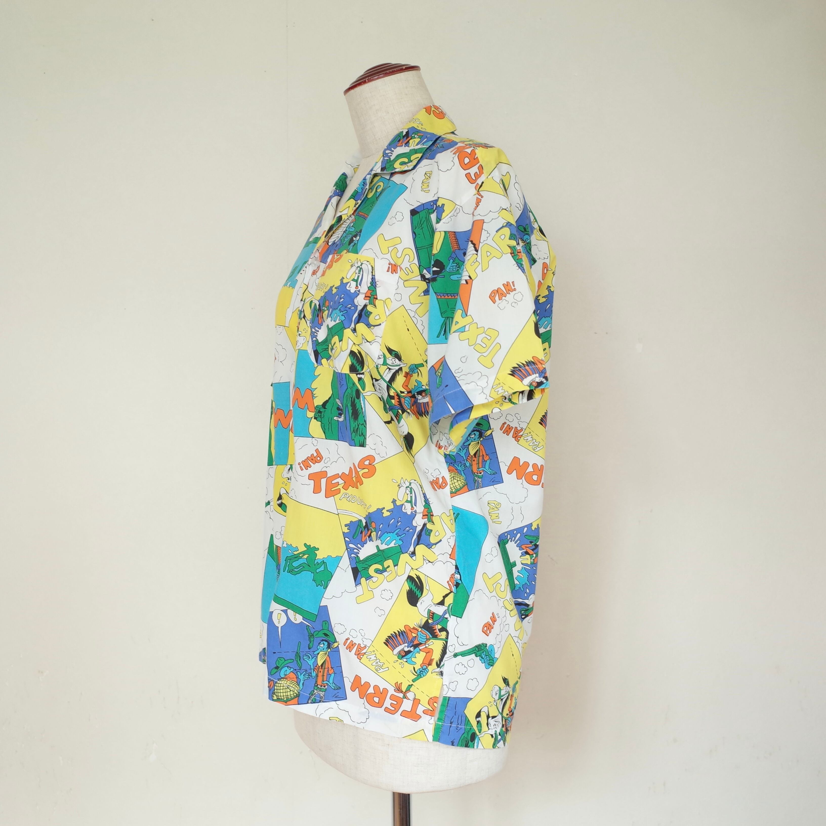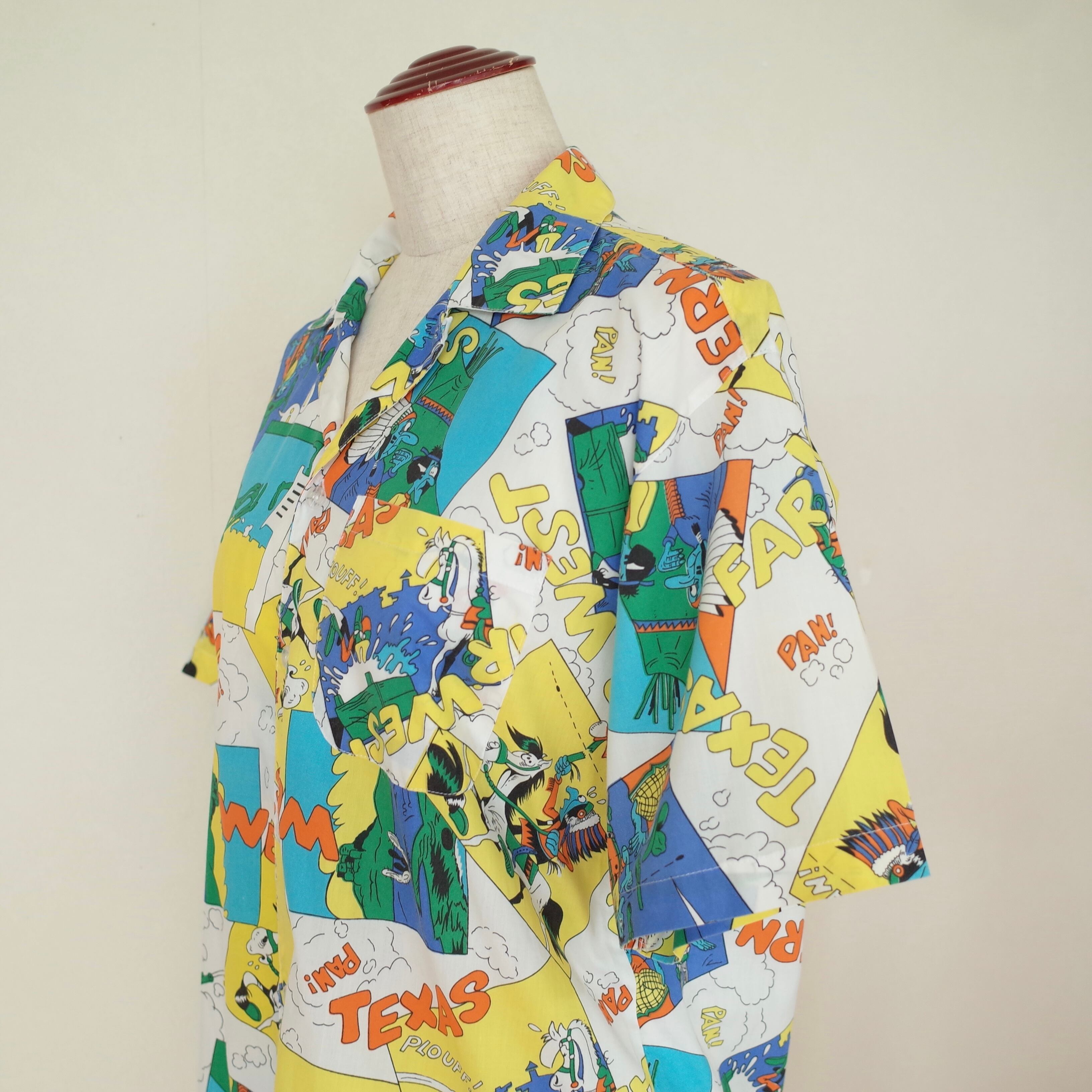 カウボーイやインディアンがコミック調のノリでプリントされた開襟シャツ。コットンポリのサラッとした軽い着心地。前をあけてタンクトップやキャミソールの上に羽織って、ゆったりとした良いサイズ感です。夏にぴったりの一枚です。