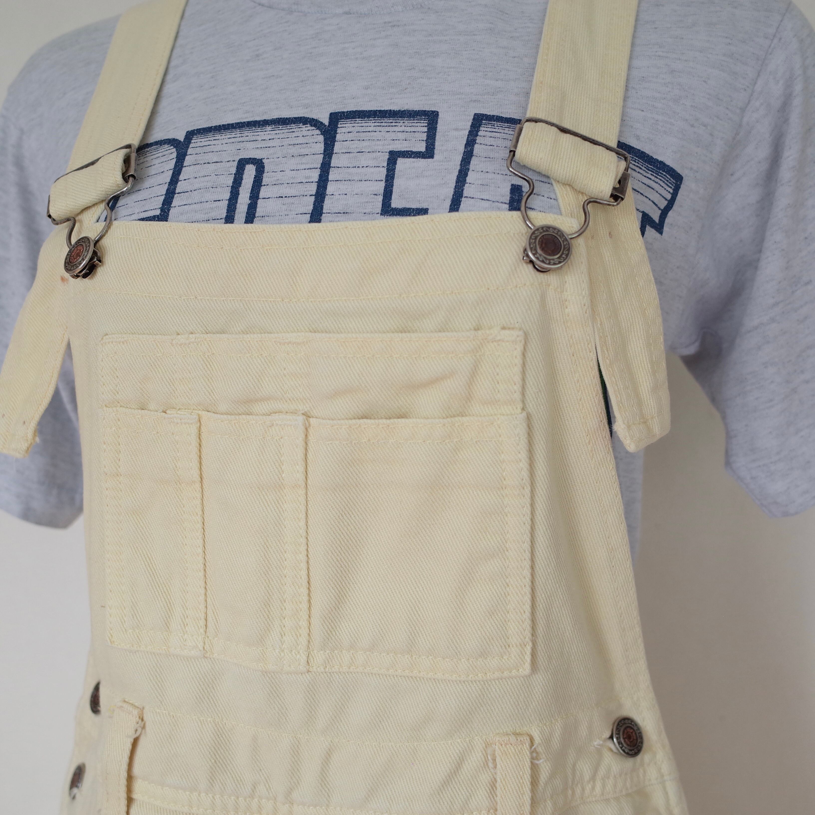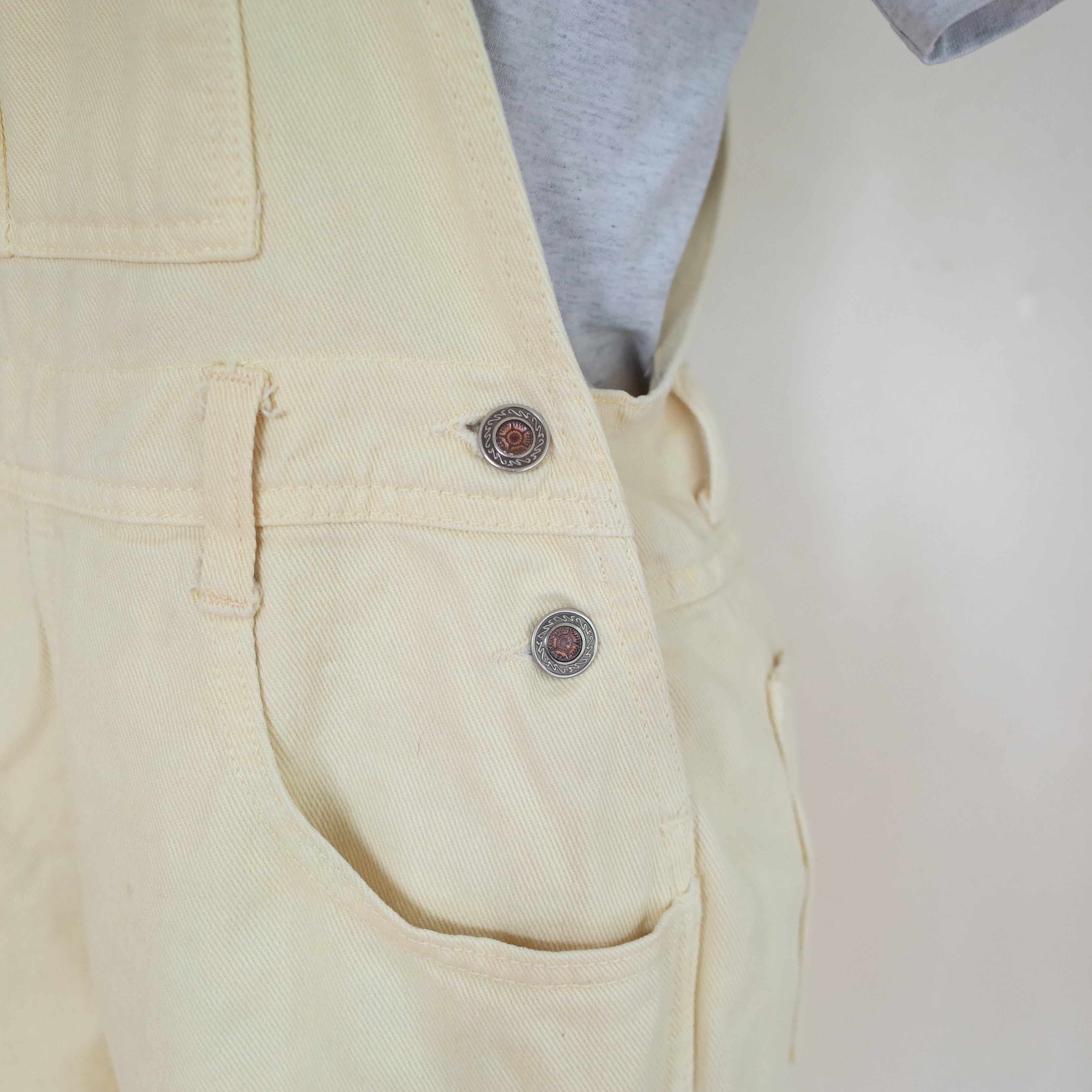 ラフにレングスがカットオフされたショートオール。アメリカ製です。淡いパステルイエローのカラーが可愛い一枚。様々なインナーと合わせてこの夏楽しみたいショートオールです。ショルダー部分で調節可能です。